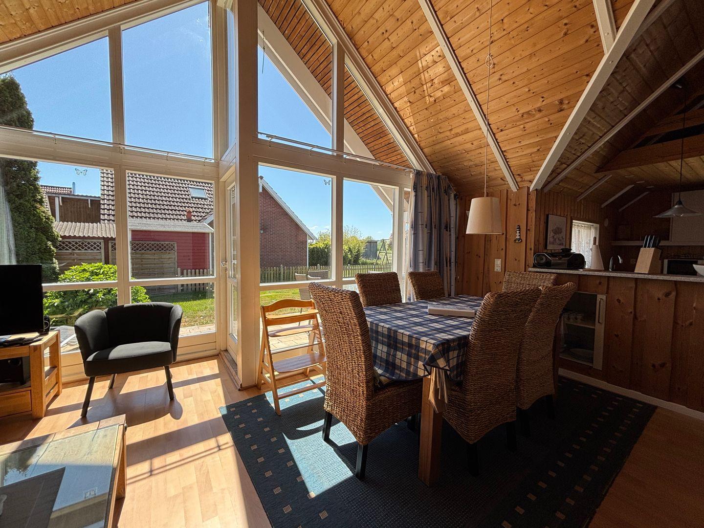 Das Wohnzimmer lädt mit einem großen Sofa und einer beeindruckenden Fensterfront zum Entspannen ein. Genießen Sie die natürliche Helligkeit, die den Raum durchflutet, und lassen Sie die Seele baumeln. Der angrenzende Essbereich bietet Platz für fünf Personen an einem großzügigen Esstisch und ist auch mit einem Kinderhochstuhl ausgestattet, um den Bedürfnissen der Kleinen gerecht zu werden.