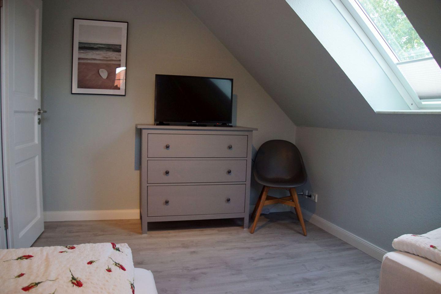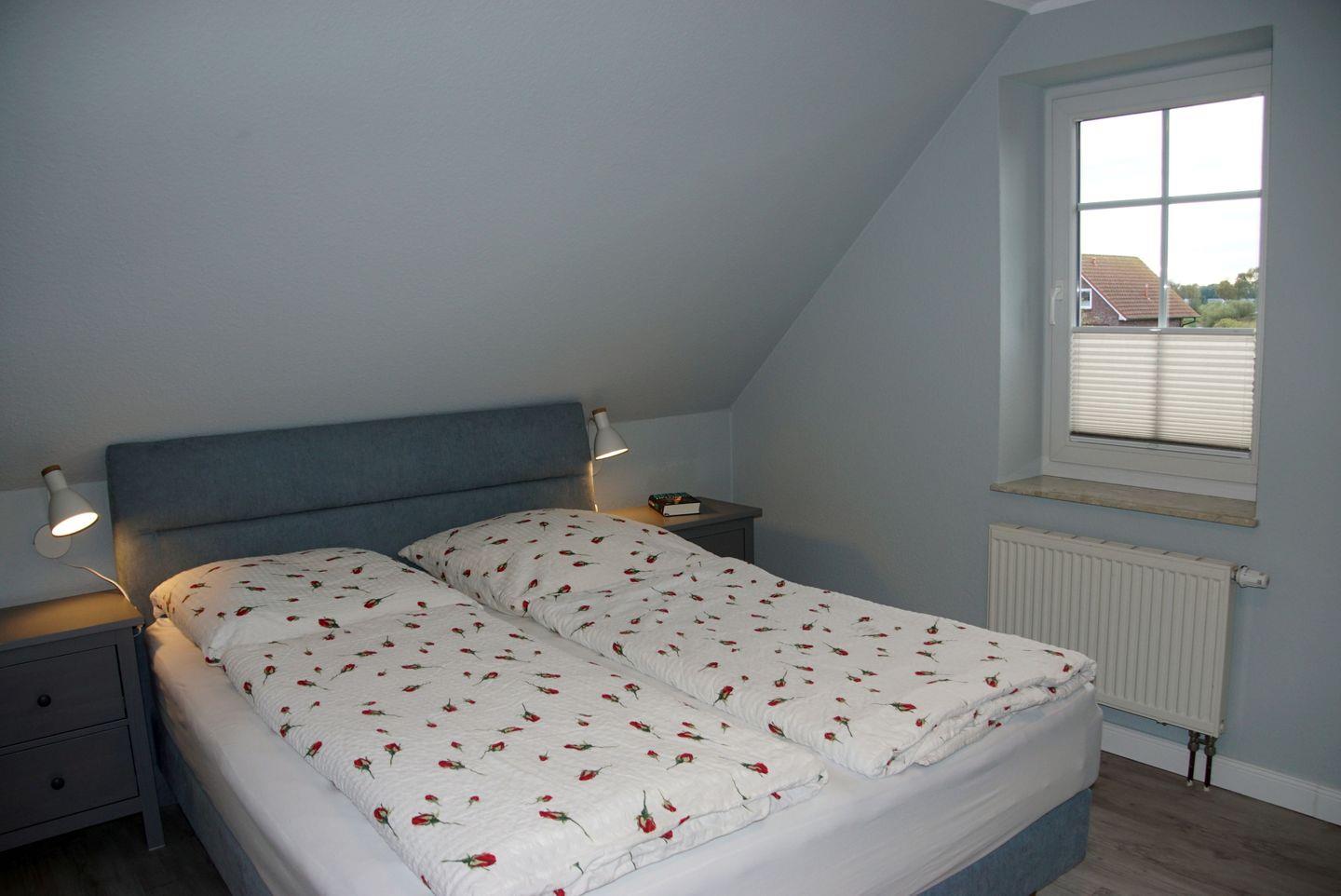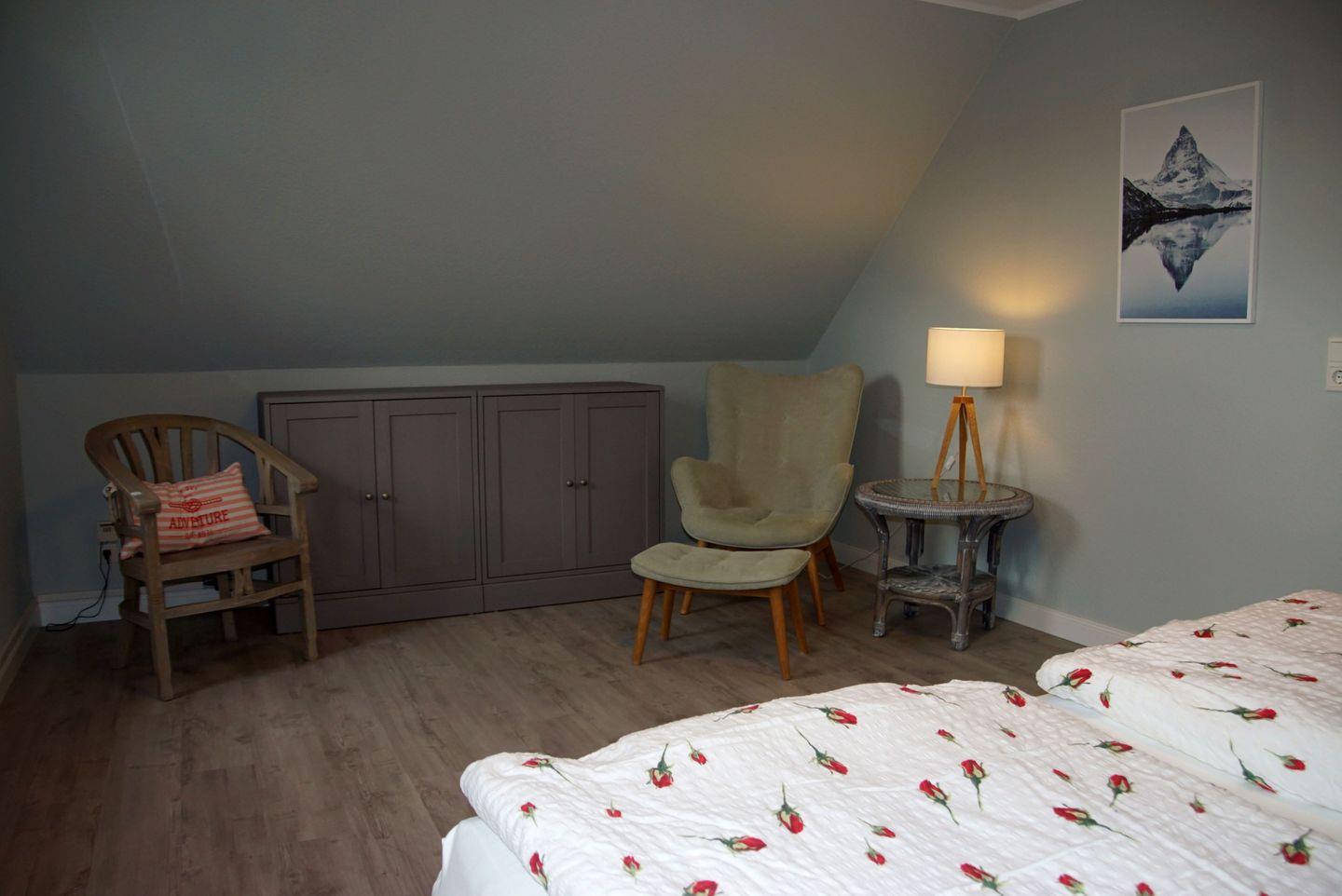 Insgesamt stehen Ihnen drei gemütliche Schlafzimmer zur Verfügung. Im Schlafzimmer im Erdgeschoss erwartet Sie ein komfortables Boxspringbett mit einer durchgehenden Matratze in den Maßen 160x200 cm. Die beiden Schlafzimmer im Obergeschoss bieten Ihnen entweder zwei Einzelbetten in den Maßen 90x200 cm mit teilweisem Meerblick aus dem Veluxfenster oder ein weiteres Boxspringbett mit einer durchgehenden Matratze in den Maßen 160x200 cm. Hier werden Sie erholsame Nächte verbringen und neue Kraft tanken.