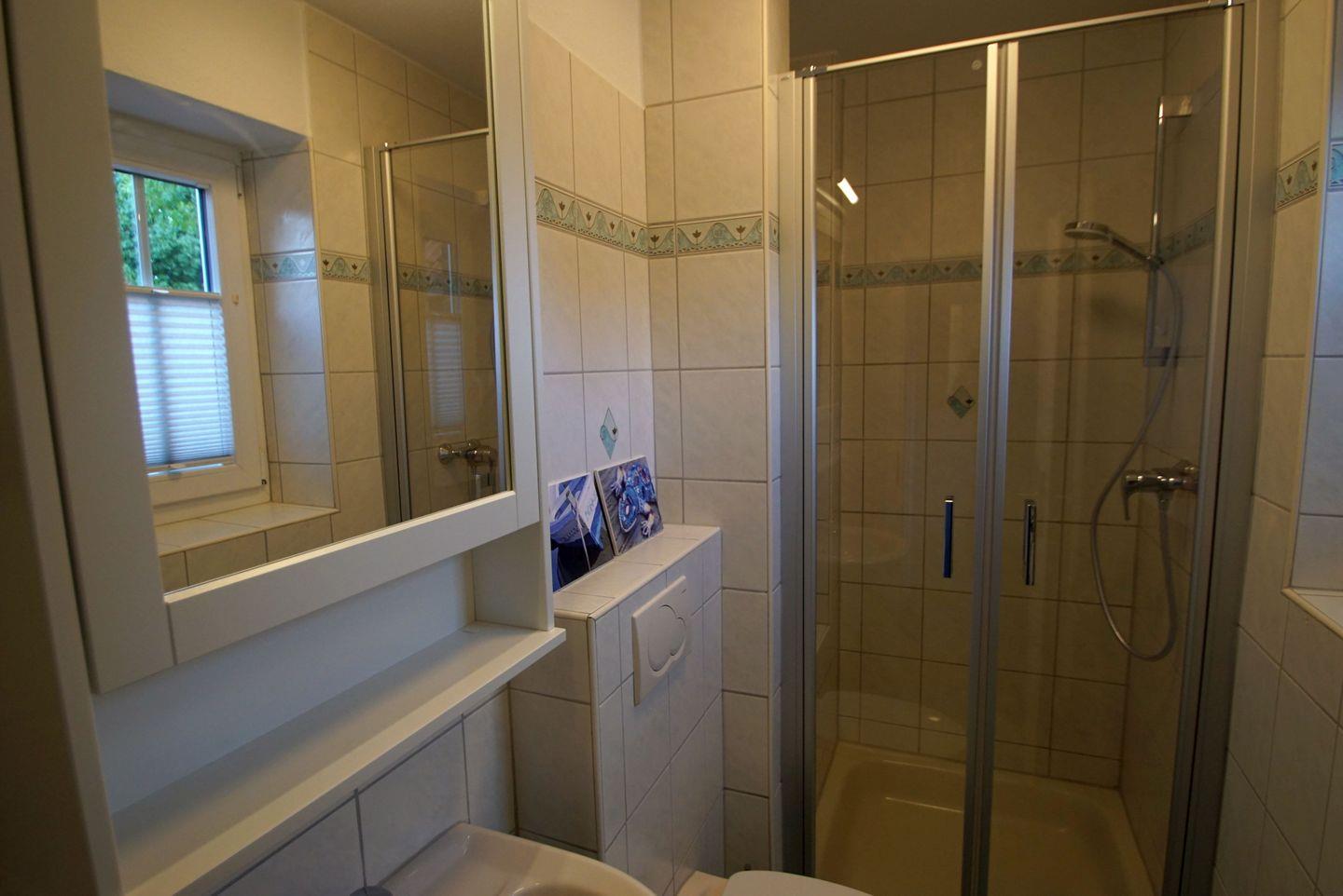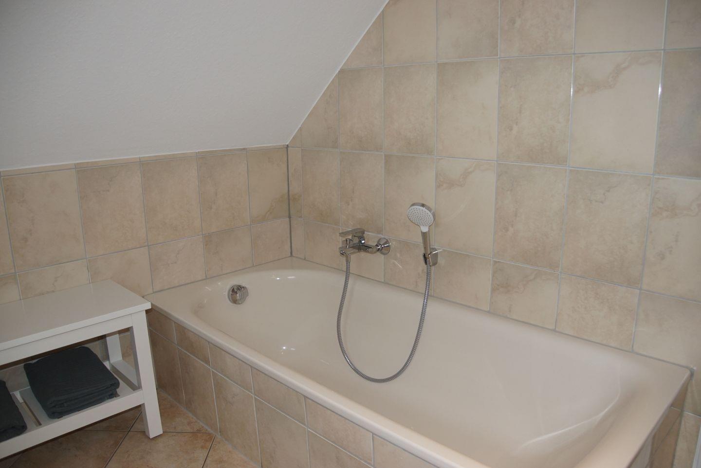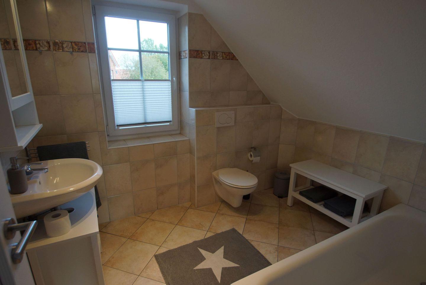 Die Badezimmer des Hauses lassen ebenfalls keine Wünsche offen. Im Bad im Erdgeschoss erwartet Sie eine ebenerdige Dusche, ein WC, ein Waschbecken und eine Handtuchheizung. Im Bad im Obergeschoss können Sie in der Badewanne entspannen und finden ebenfalls ein WC, ein Waschbecken, einen Fön und eine Handtuchheizung vor.
