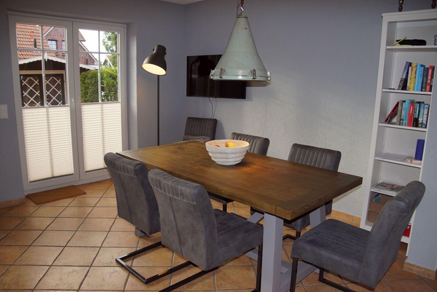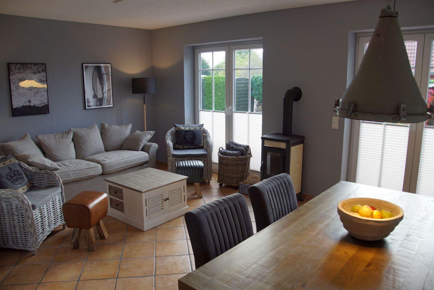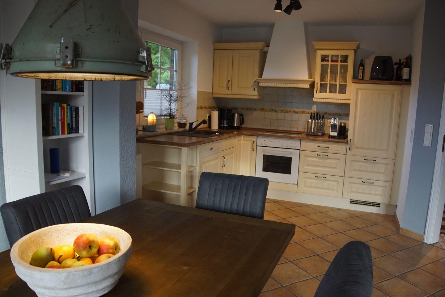 Auch im Inneren des Hauses erwartet Sie eine erstklassige Ausstattung. Der offene Küchen-, Ess- und Wohnbereich bildet das Herzstück des Hauses. Die moderne Küche ist komplett eingerichtet und lässt keine Wünsche offen. Ein Ceran-Kochfeld, eine Kaffeemaschine, ein Geschirrspüler, ein Kühlschrank mit Gefrierfach, ein Backofen, ein Wasserkocher, ein Toaster und ein Mixer stehen Ihnen zur Verfügung, um köstliche Mahlzeiten zuzubereiten. Der großzügige Essbereich mit einem Esstisch und sechs Stühlen lädt zum gemeinsamen Genießen ein.