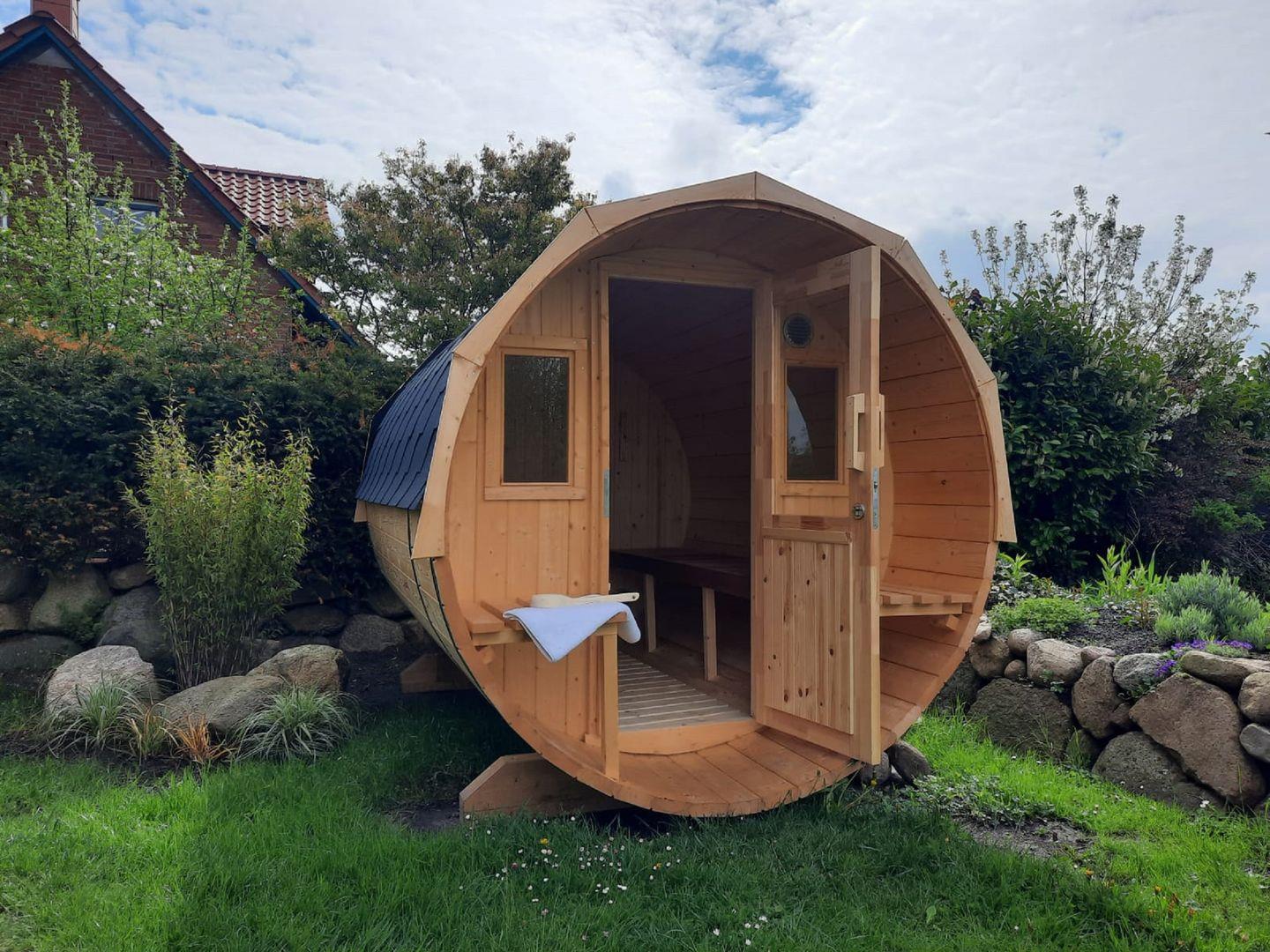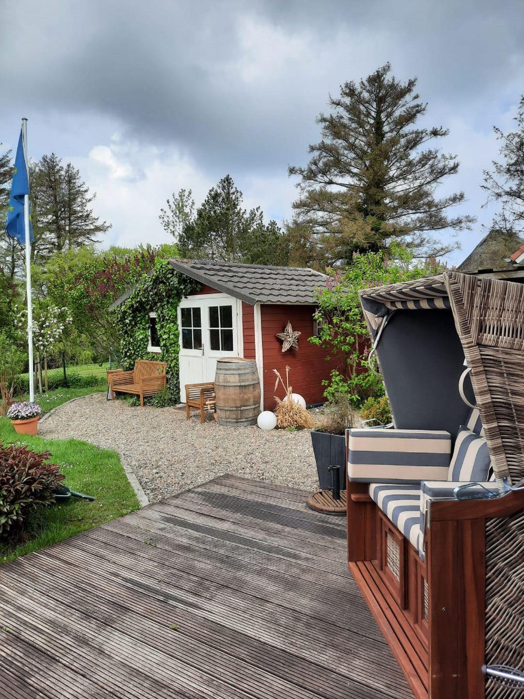 Außenausstattung: 2 Terrassen mit Strandkörben, Gartenmöbel, Liegen, Sonnenschirm, Fassauna, Gartenhaus mit Outdoorspielen, Klettergerüst mit Fußballtor, 2 PKW Stellplätze