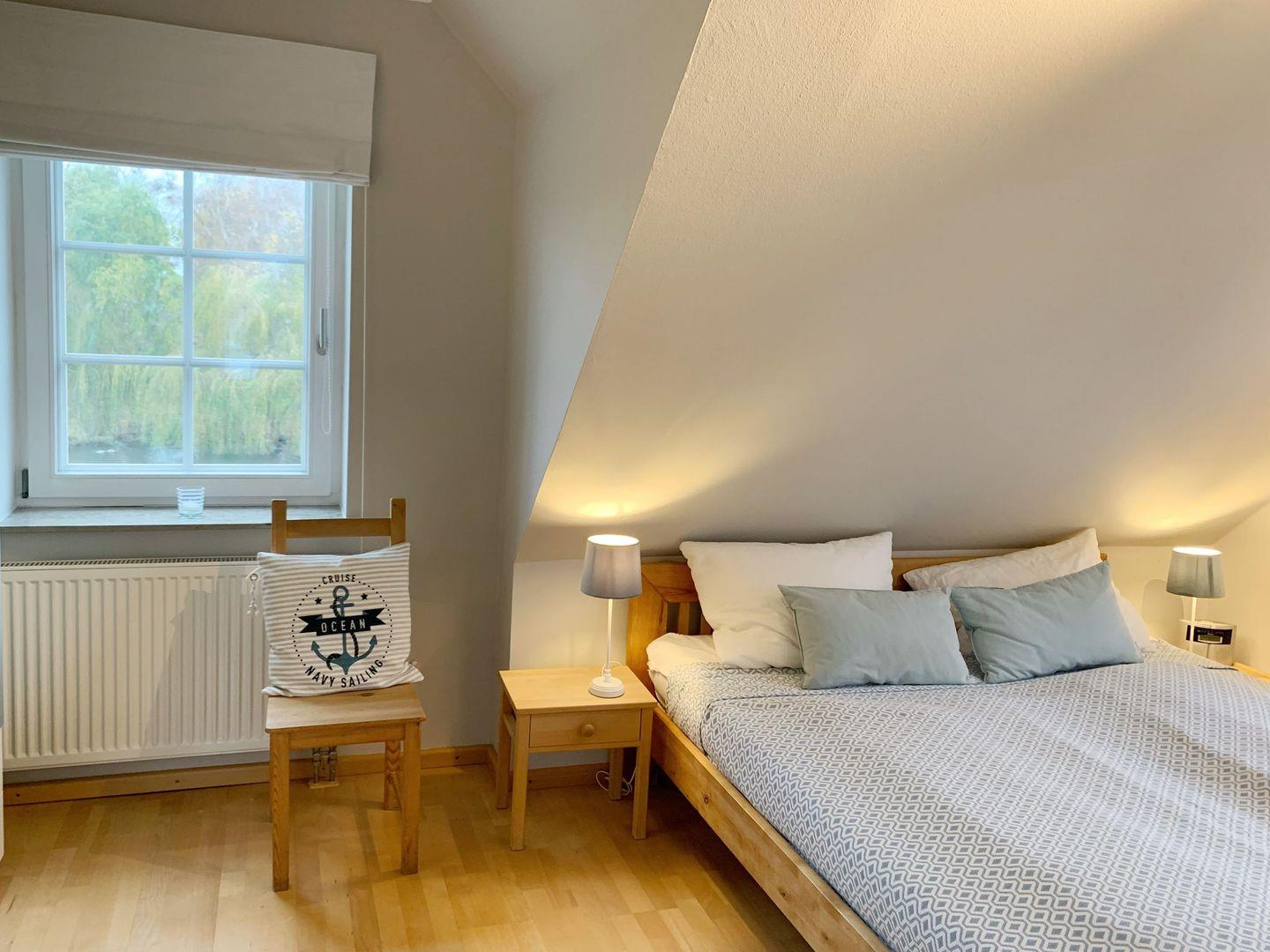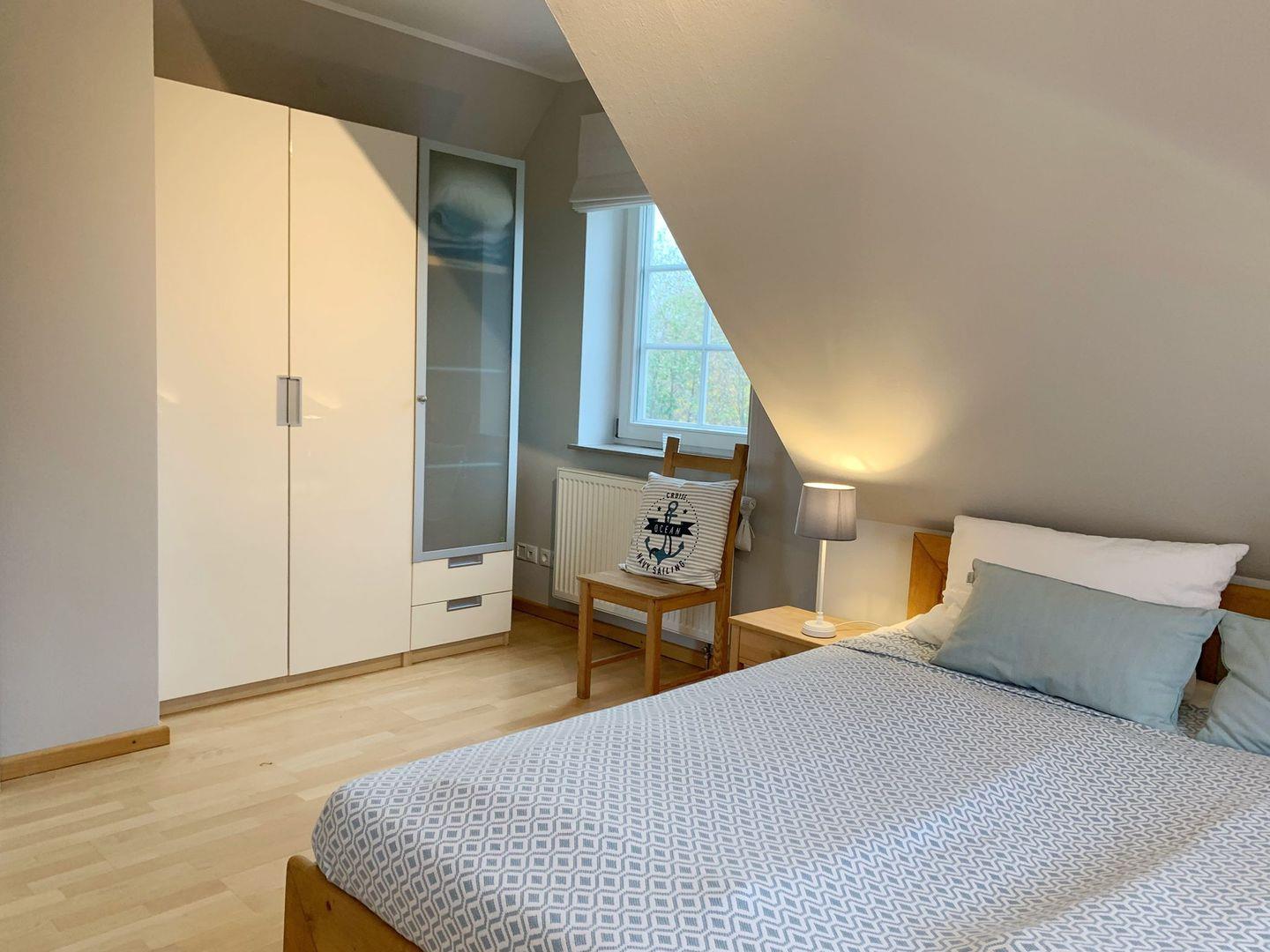 Schlafzimmer 1 (Obergeschoss): Doppelbett (1,80 x 2 m - 2 Matratzen), Kleiderschrank, Vorhänge + Innenjalousie, Kommode, Leselampe