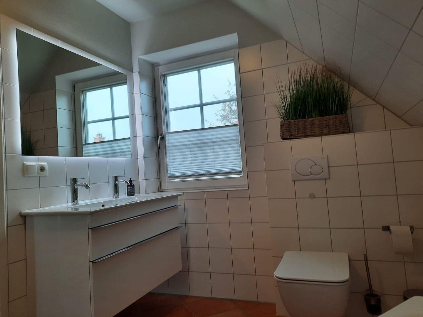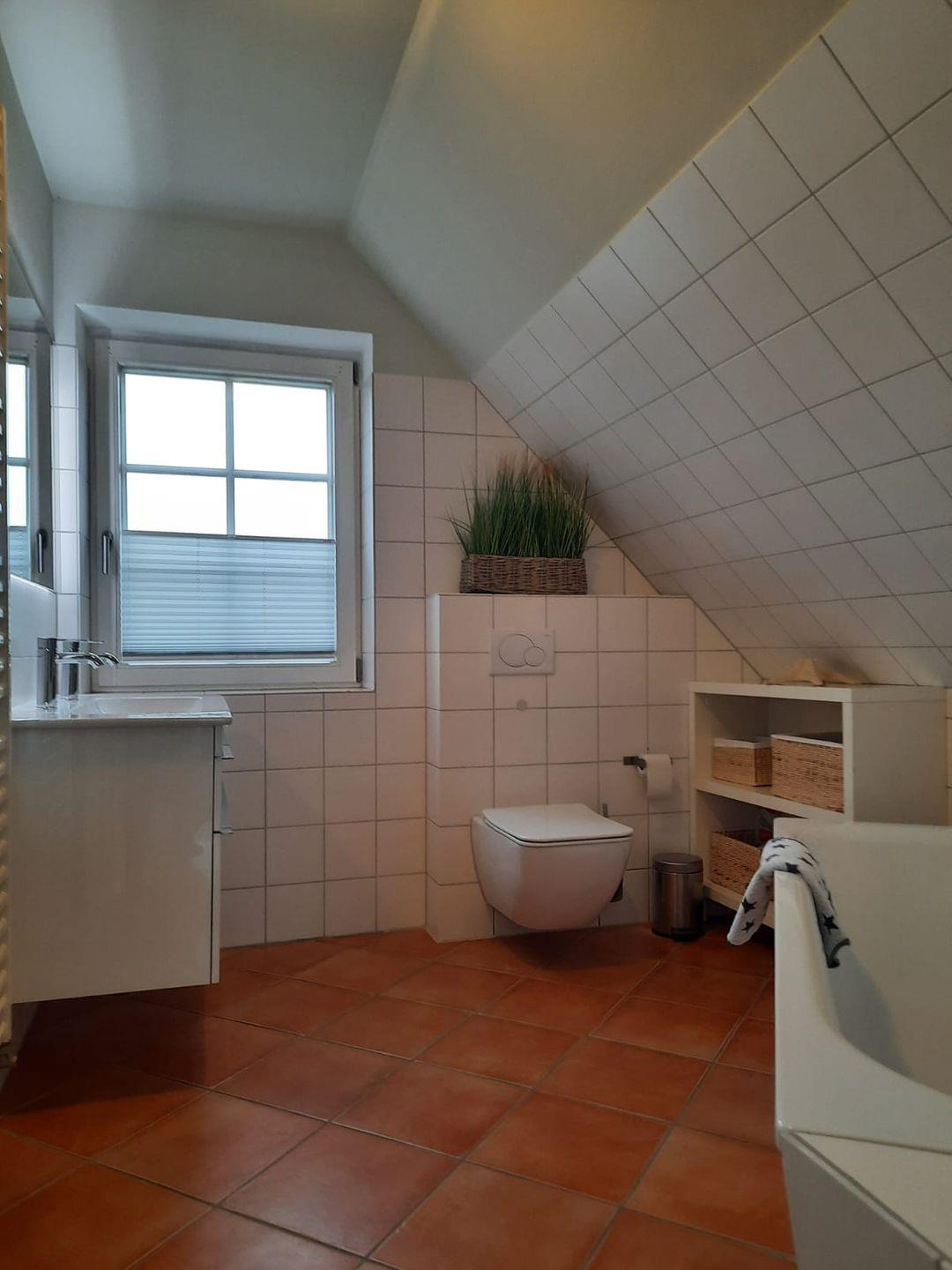 Bad 1 (Obergeschoss): Badewanne, WC, Waschbecken, Fön, Handtuchheizung, Kindertritt + Kindersitz für WC, Fußbodenheizung