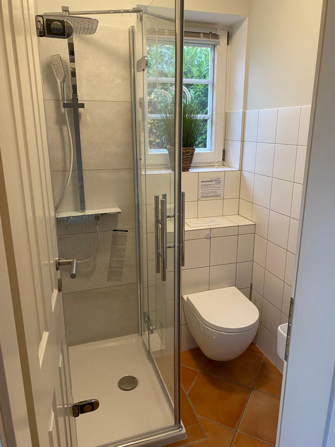 Bad 2 (Erdgeschoss): Dusche, WC, Waschbecken, Fußbodenheizung
