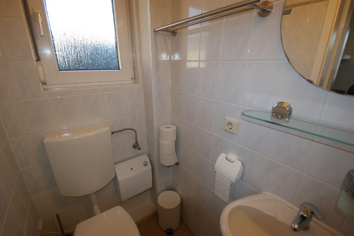 Das Badezimmer im Obergeschoss lädt mit einer einladenden Badewanne zum Entspannen ein. Ein WC, ein Waschbecken und ein Fön stehen Ihnen ebenfalls zur Verfügung. Im Erdgeschoss befindet sich ein Gäste-WC mit Dusche, das Ihnen zusätzlichen Komfort bietet.