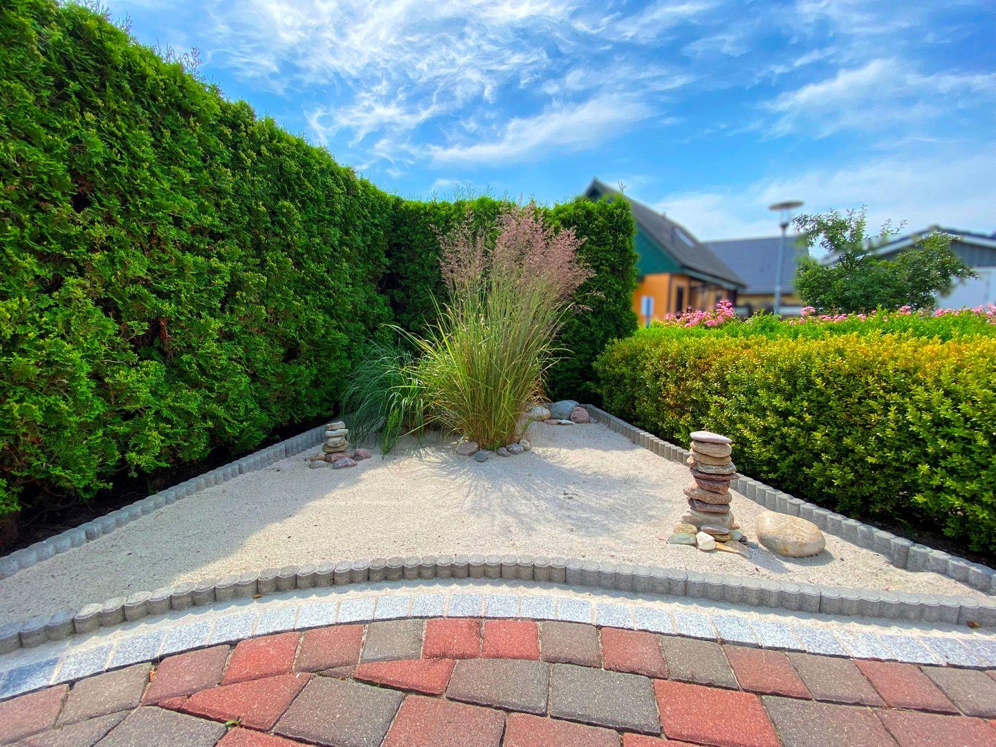 Im Erdgeschoss erwartet Sie ein lichtdurchflutetes Wohnzimmer mit offener Küche, die nahtlos in den gemütlichen Wohnbereich übergeht. Hier können Sie am Kamin entspannen und die wohlige Wärme genießen – ideal für gemütliche Abende. Ein angrenzendes Badezimmer mit Fenster und Dusche bietet Komfort und Bequemlichkeit. Der Wohnbereich führt Sie direkt zur einladenden Terrasse und dem schönen grünen Garten mit viel Privatsphäre. Hier können Sie die frische Meeresluft und die Sonne genießen.