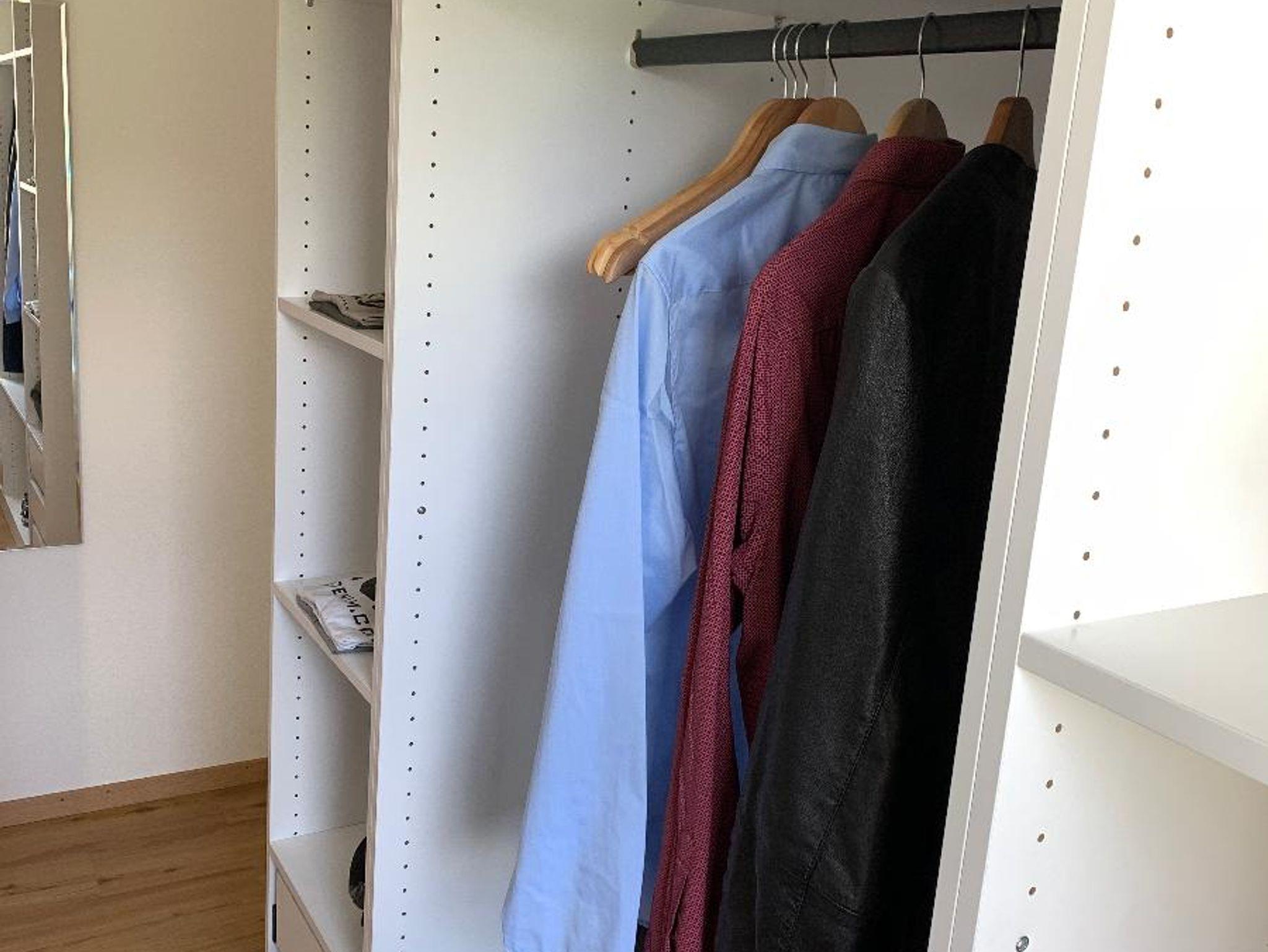 offenen Kleiderschrank, einen großen Spiegel und eine Abstellmöglichkeit