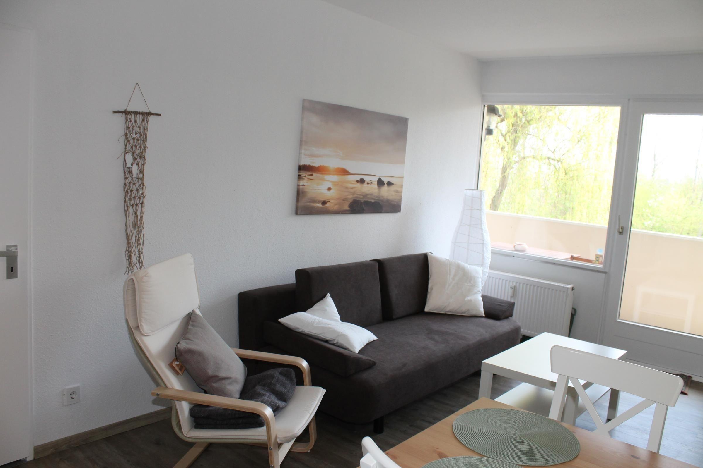 Das helle Wohnzimmer mit Zutritt zum Balkon bildet das Zentrum der Wohnung. Hier können alle Gäste zusammenkommen und den Urlaub gemeinsam genießen.