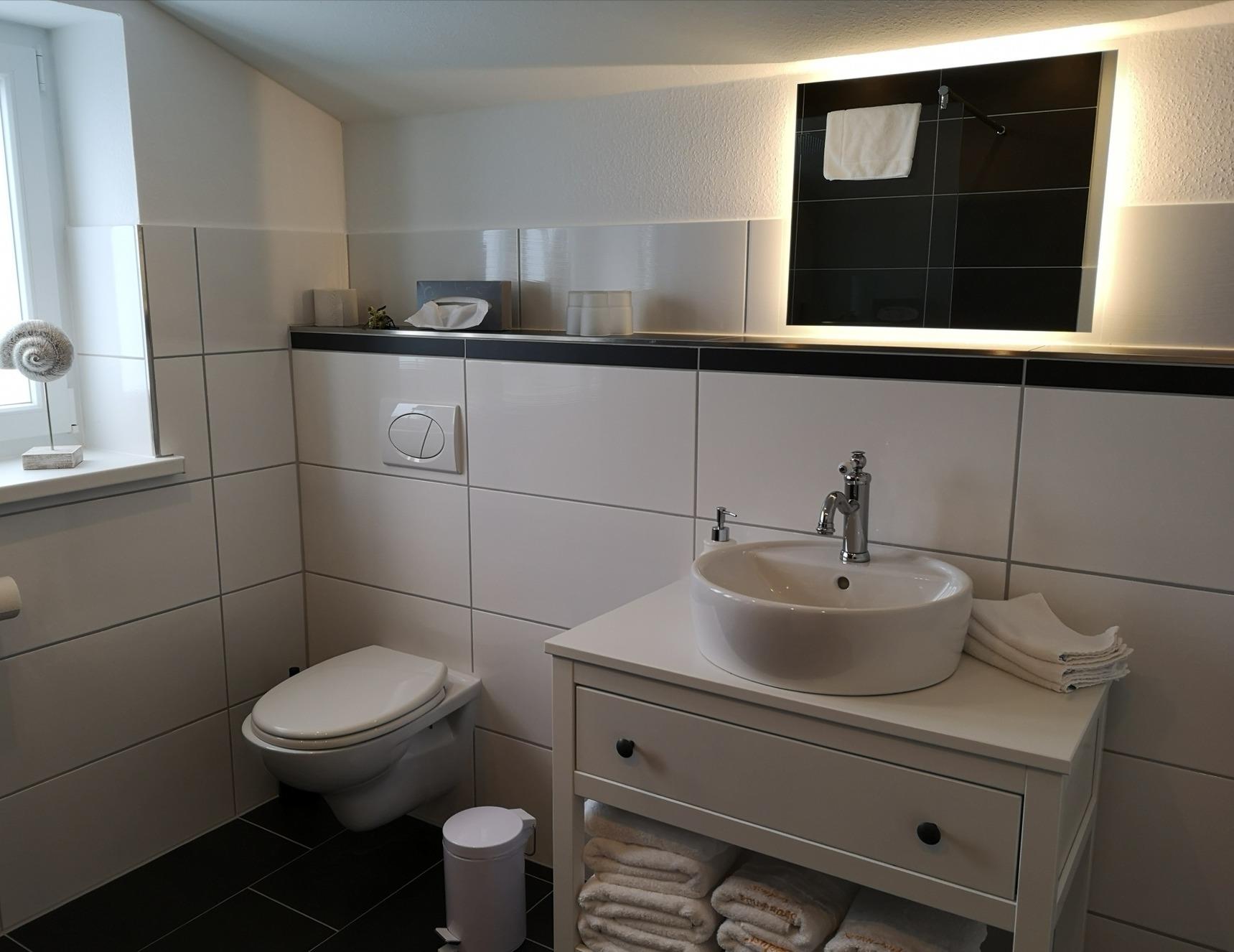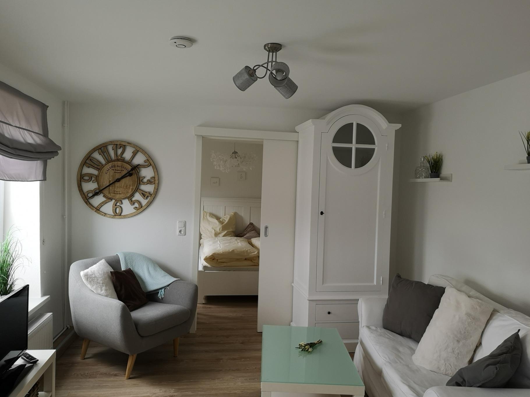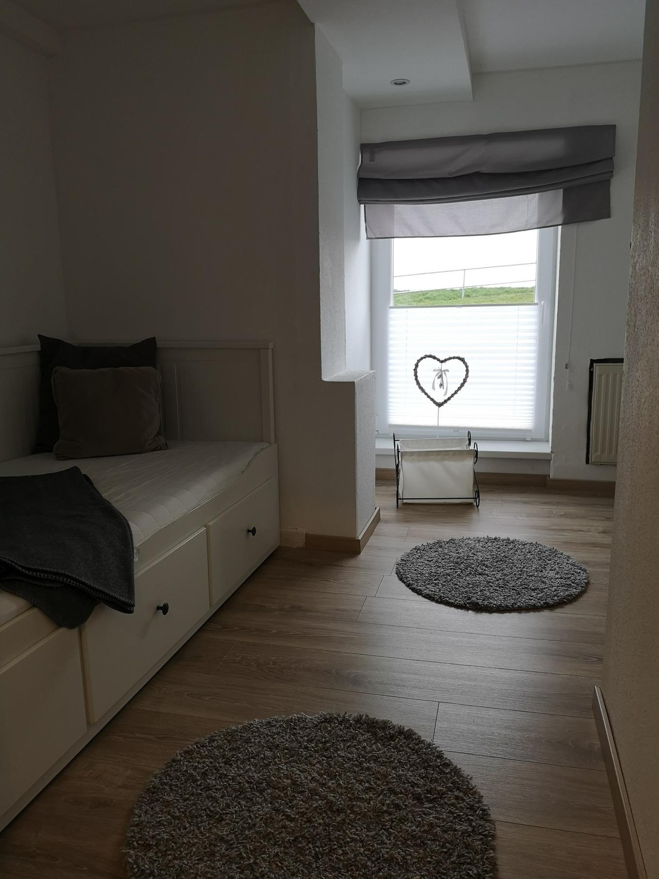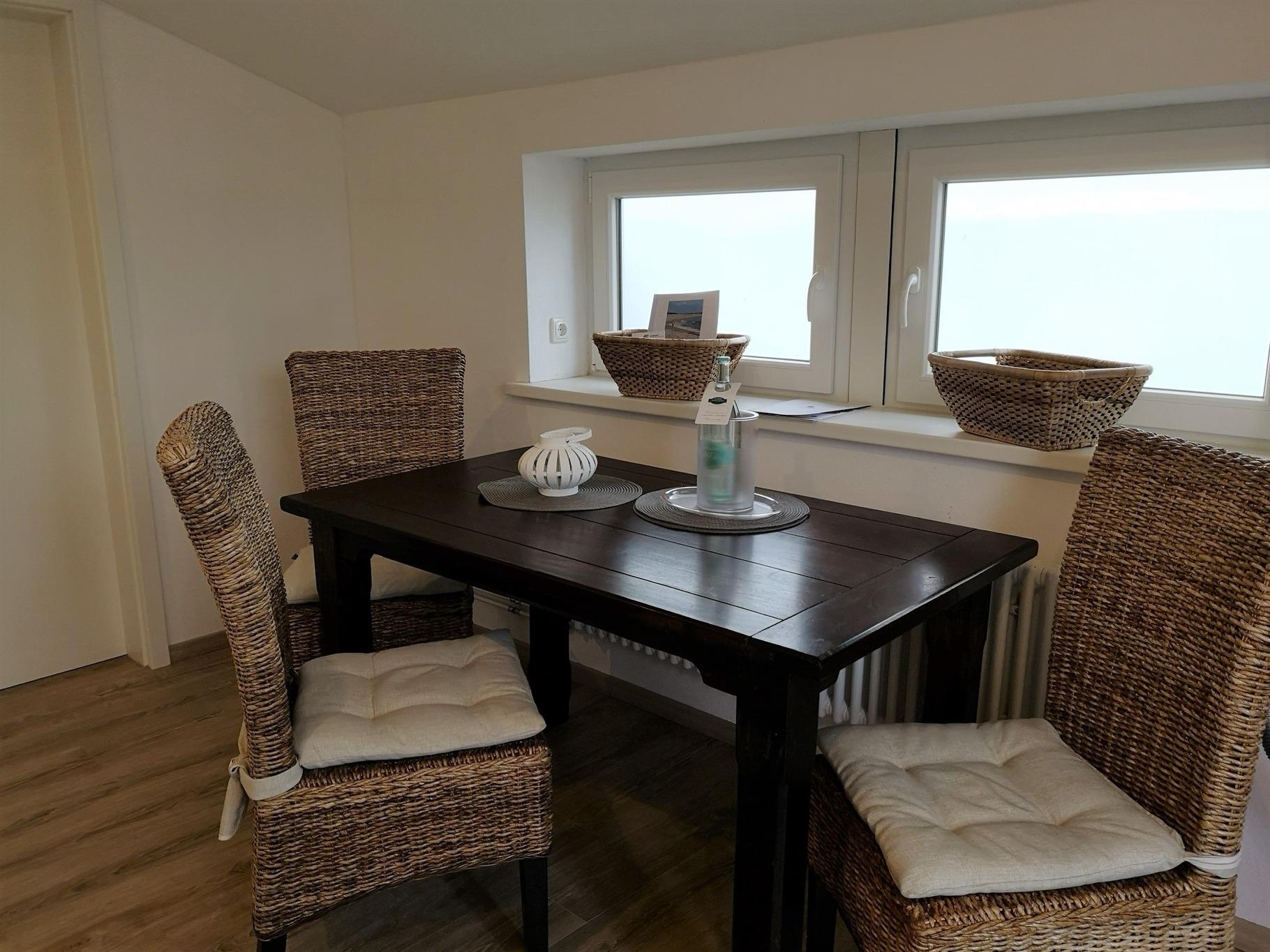 Die Wohnung befindet sich im Ergeschoß eines Ferienhauses mit einer großzügigen Holzterrasse Richtung Süden. Auf einer Wohnfläche von ca. 60qm finden bis zu drei Erwachsene und ein Baby ausreichend Platz. Für mehr Privatsphäre sorgen zwei separate Schlafzimmer. Hunde sind in dieser Ferienwohnung dazu buchbar. Bei einer Anreise mit dem eigenen Auto, steht ein Parkplatz kostenfrei zur Verfügung. Die Wohnung verfügt über eine Küche mit weißer Holzverkleidung und mit goldenen Details. Zur Ausstattung gehört eine Herdplatte mit vier Kochfeldern, ein Backofen, sowie Kühlschrank und Gefrierschrank und eine Geschirrspülmaschine. Für Ihren Aufenthalt stehen Ihnen Kaffemaschine, Toaster und Wasserkocher zur Verfügung. Der Essbereich findet sich separat von der Küche direkt unter einem Fenster. Das Wohnzimmer liegt angrenzend an der Küche, welches durch eine Schiebetür erreichbar ist. Vom Sofa oder Sessel aus schauen Sie auf den Flachbild TV . Das Schlafzimmer mit einem Doppelbett in der Größe 160x200cm liegt direkt hinter dem Wohnzimmer. Ein zusätzliches Schlafzimmer verfügt über ein Einzelbett in der Größe 80x200cm. In der gesamten Wohnung ist WLAN vorhanden.Das Badezimmer hat einen hochwertigen Waschtisch und ist mit praktischer Fußbodenheizung ausgestattet.