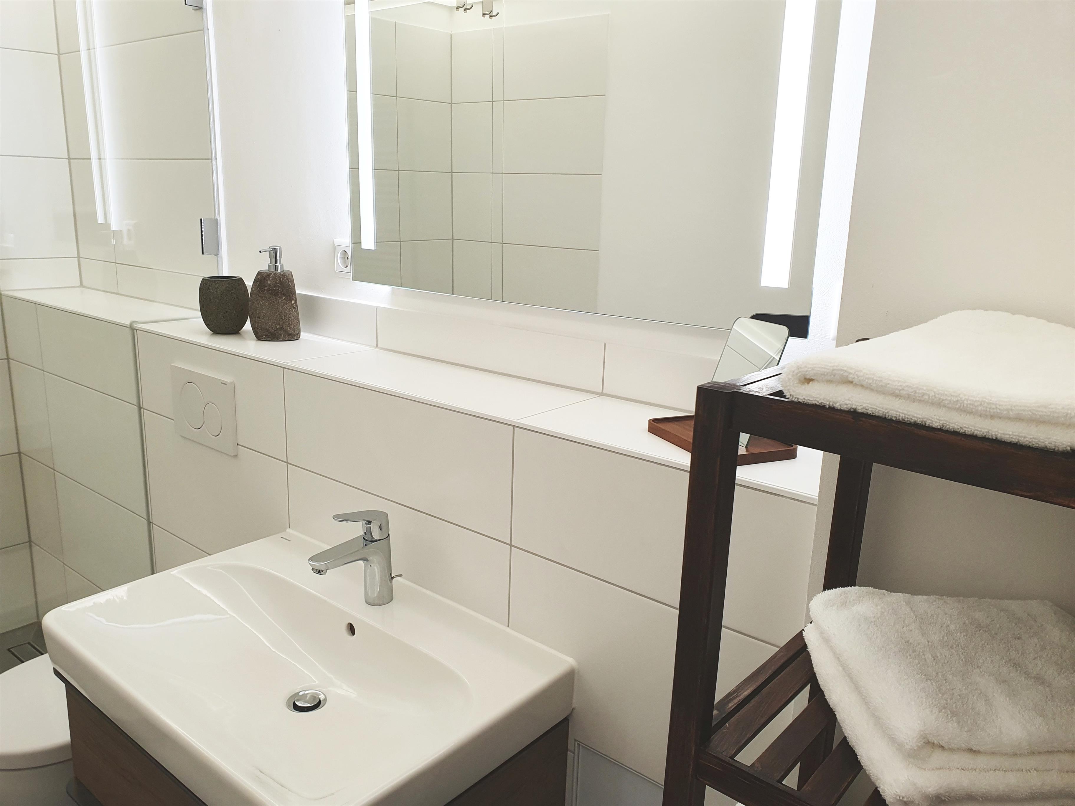 Das Badezimmer ist elegant in weiß und grau gefliest und mit weißer Badkeramik ausgestattet. Der Waschbeckenunterschrank aus Nussbaum und das geflieste Sims bieten Ihnen ausreichend Stellfläche und Stauraum, der Handtuchheizkörper wärmt Ihr Handtuch vor. Selbstverständlich sind ein Fön sowie ein Kosmetikspiegel vorhanden.