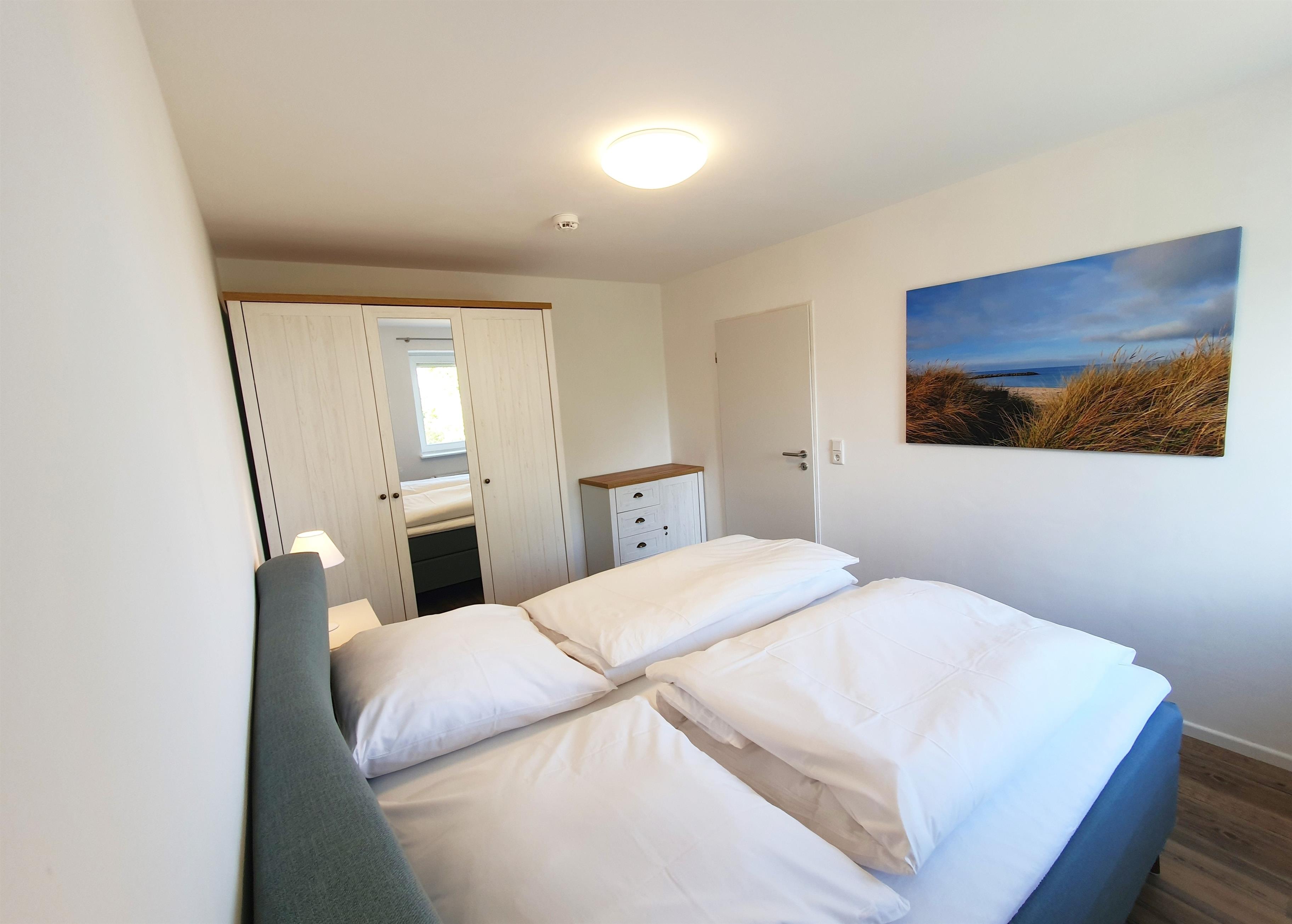 Das separate Schlafzimmer ist durch eine Tür vom Wohnzimmer abgetrennt und bietet Ihnen eine private und gemütliche Rückzugsmöglichkeit. Hier erwartet Sie ein komfortables Boxspringbett (180 x 200 cm) sowie praktische Nachtschränke und ein großer Schrank für Ihre Kleidung und persönlichen Gegenstände. Damit Sie sich um nichts kümmern müssen, sind Bettwäsche und Handtücher bereits im Mietpreis enthalten. Das Wäschepaket umfasst zwei große Duschhandtücher, zwei kleine Handtücher sowie einen Badezimmervorleger und ein Geschirrhandtuch, damit Sie sich rundum wohlfühlen können.