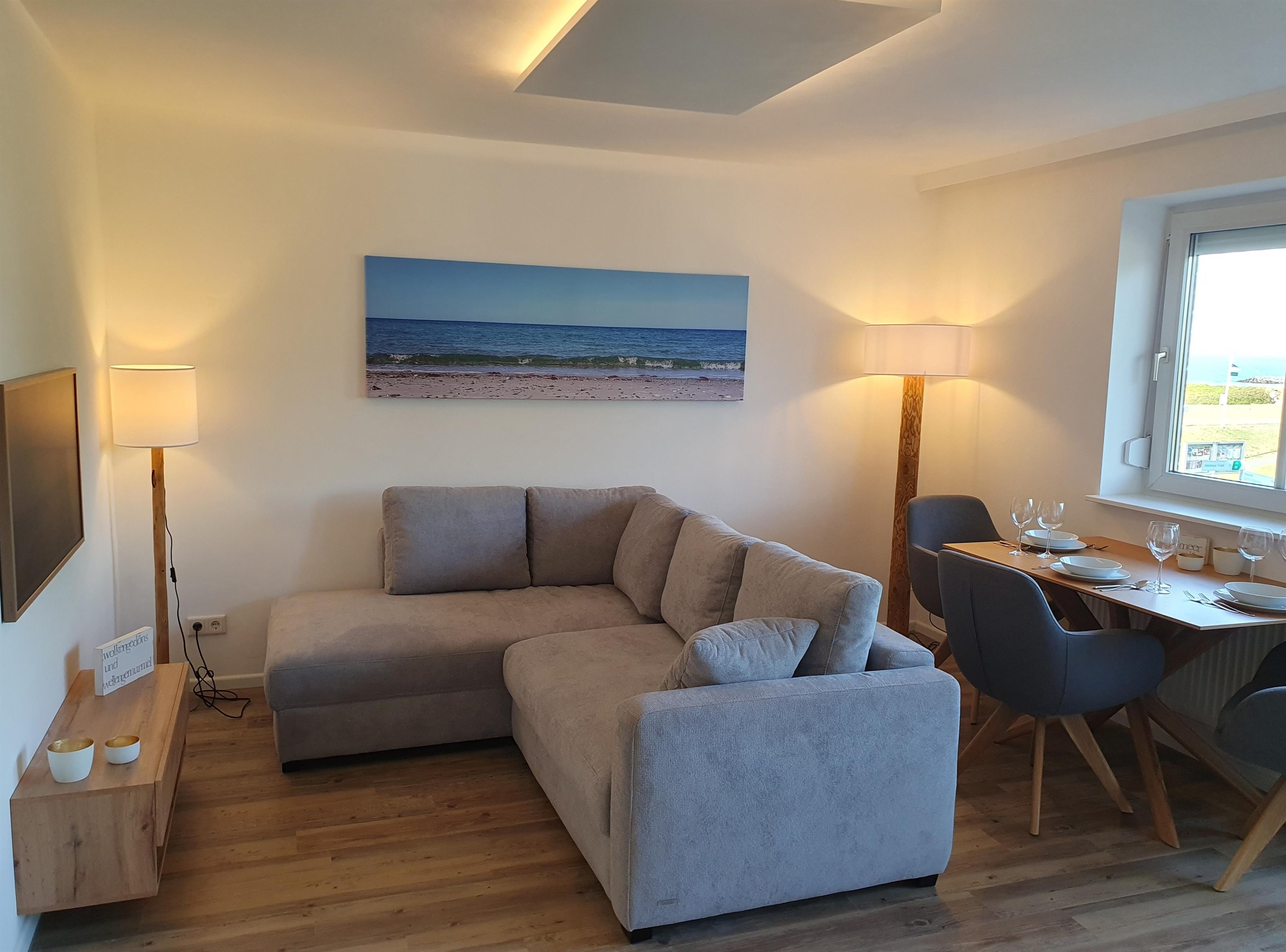 Das Wohnzimmer ist mit einem gemütlichen Sofa ausgestattet, das mit seiner hochwertiger Boxspringpolsterung für besten Komfort sorgt. Hier können Sie sich nach einem ereignisreichen Tag zurücklehnen und einfach die Seele baumeln lassen. Das Sofa lädt zum Kuscheln, Lesen oder einfach nur zum Verweilen ein.