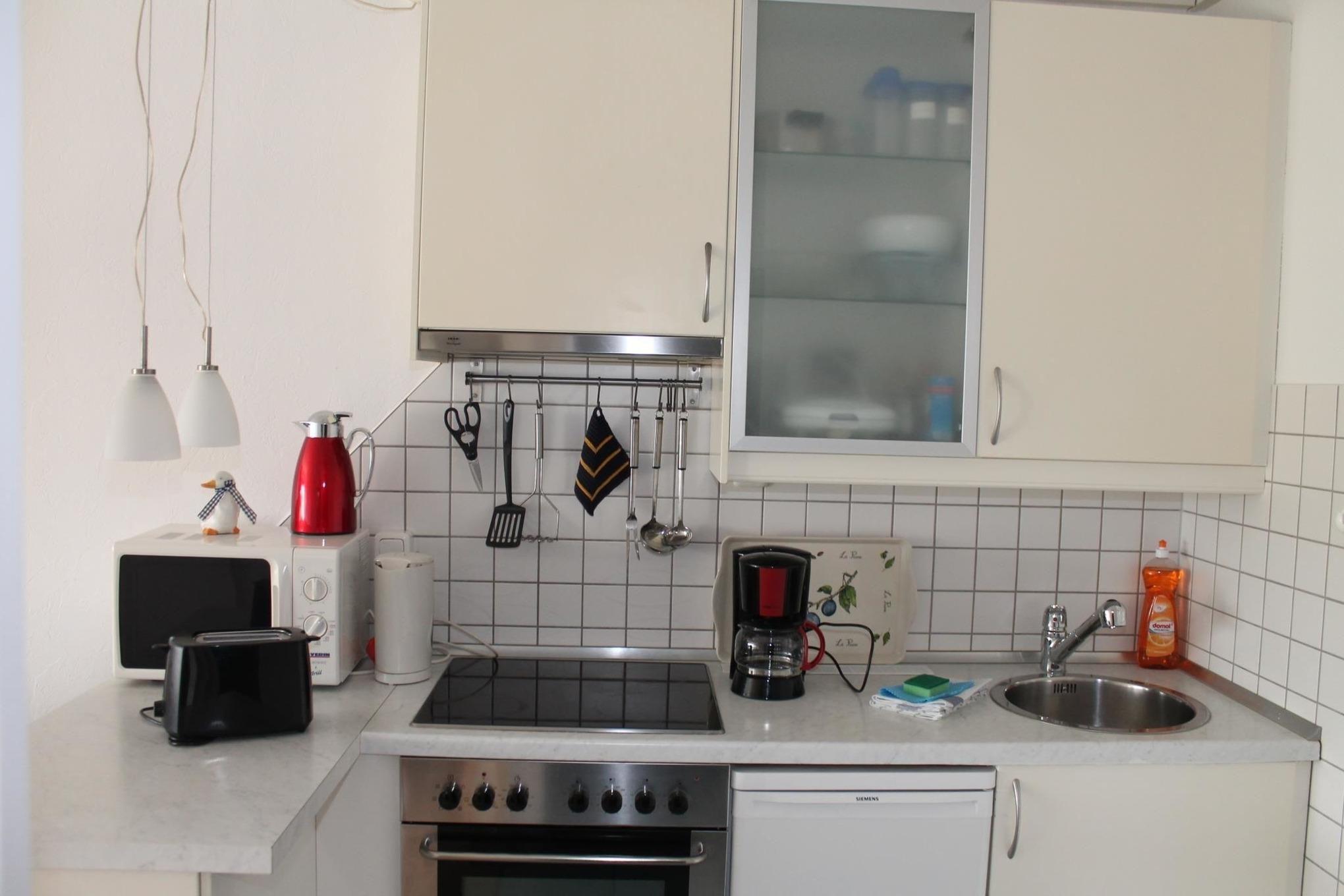 Die komplett ausgestattete Küchenzeile bietet alle Möglichkeiten zur Selbstversorgung. Im separaten Schlafraum stehen 2 weitere Betten und der Kleiderschrank.