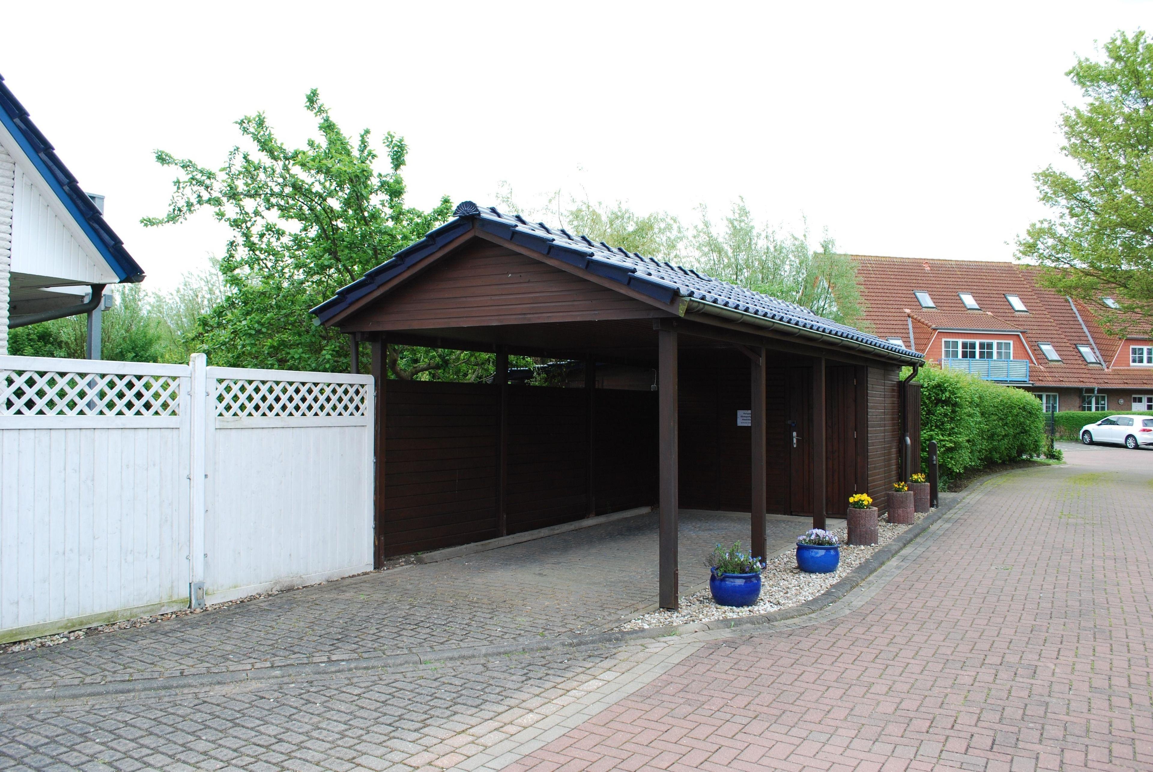 Ein Carport und eine Gartenhütte