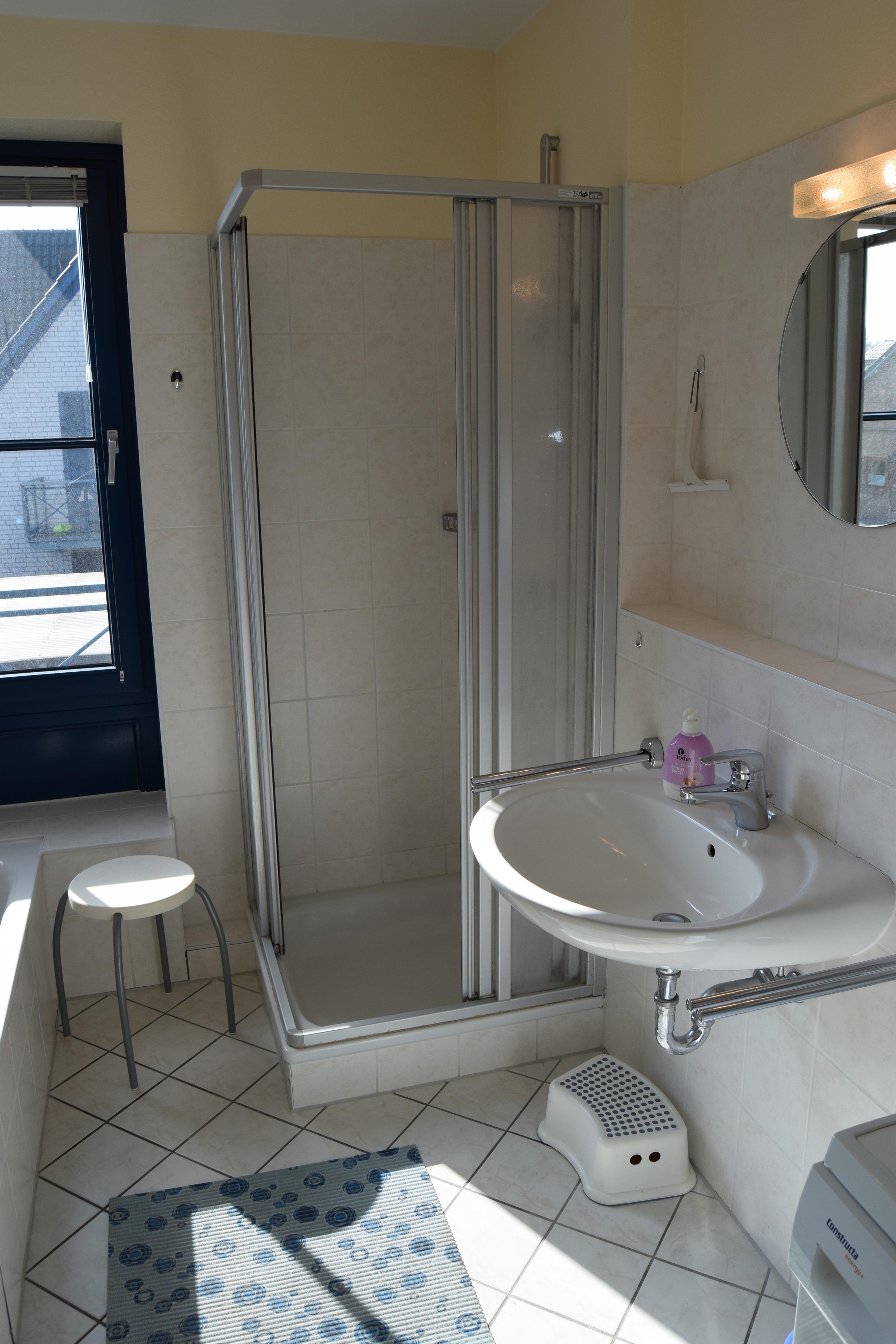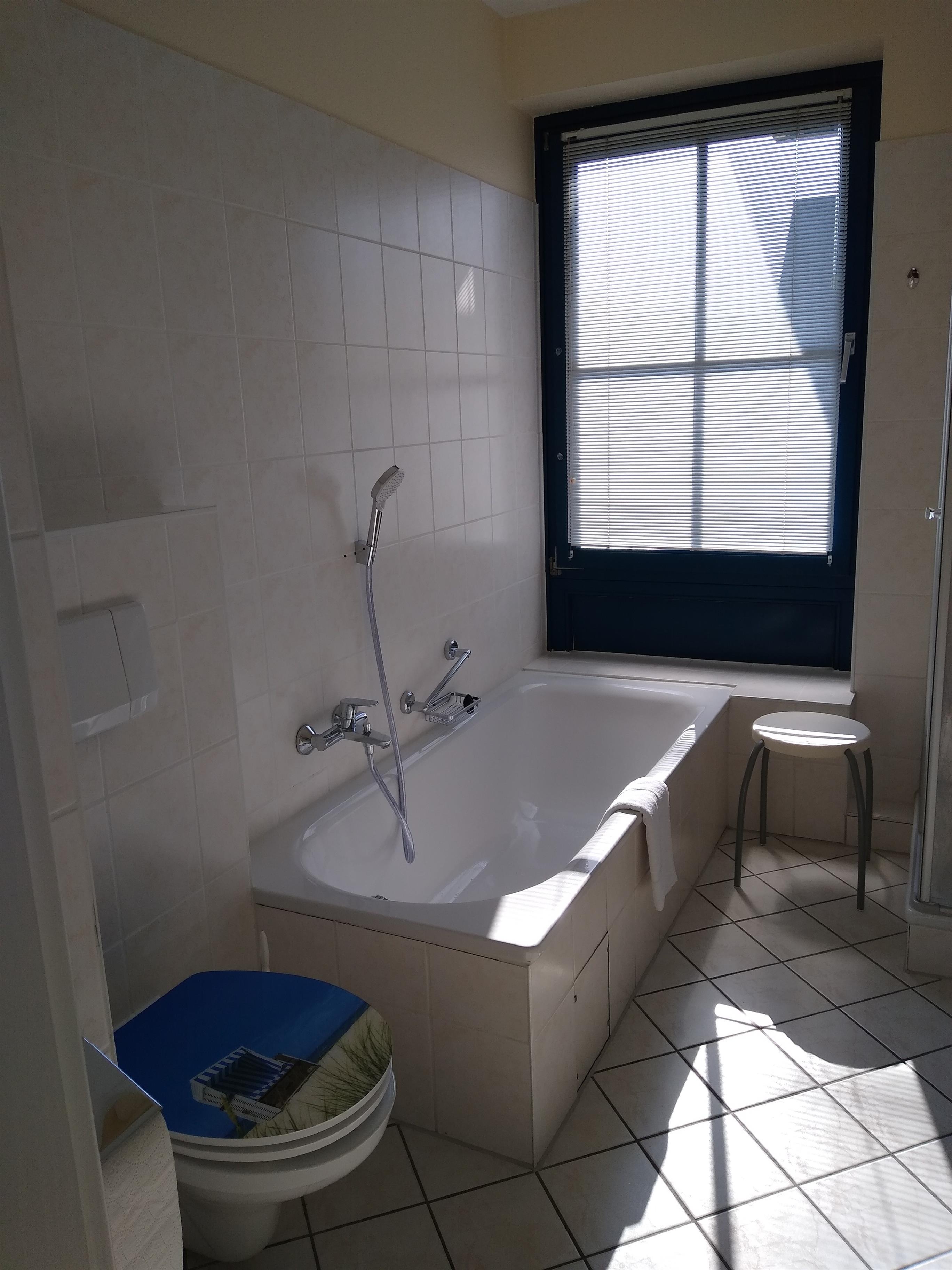 Im hellen Badezimmer (5,7m²) befindet sich das WC mit Waschbecken, eine Dusche sowie eine Badewanne. Ebenfalls vorhanden ist ein Haartrockner und genügend Stauraum für Ihre Kosmetikartikel.
