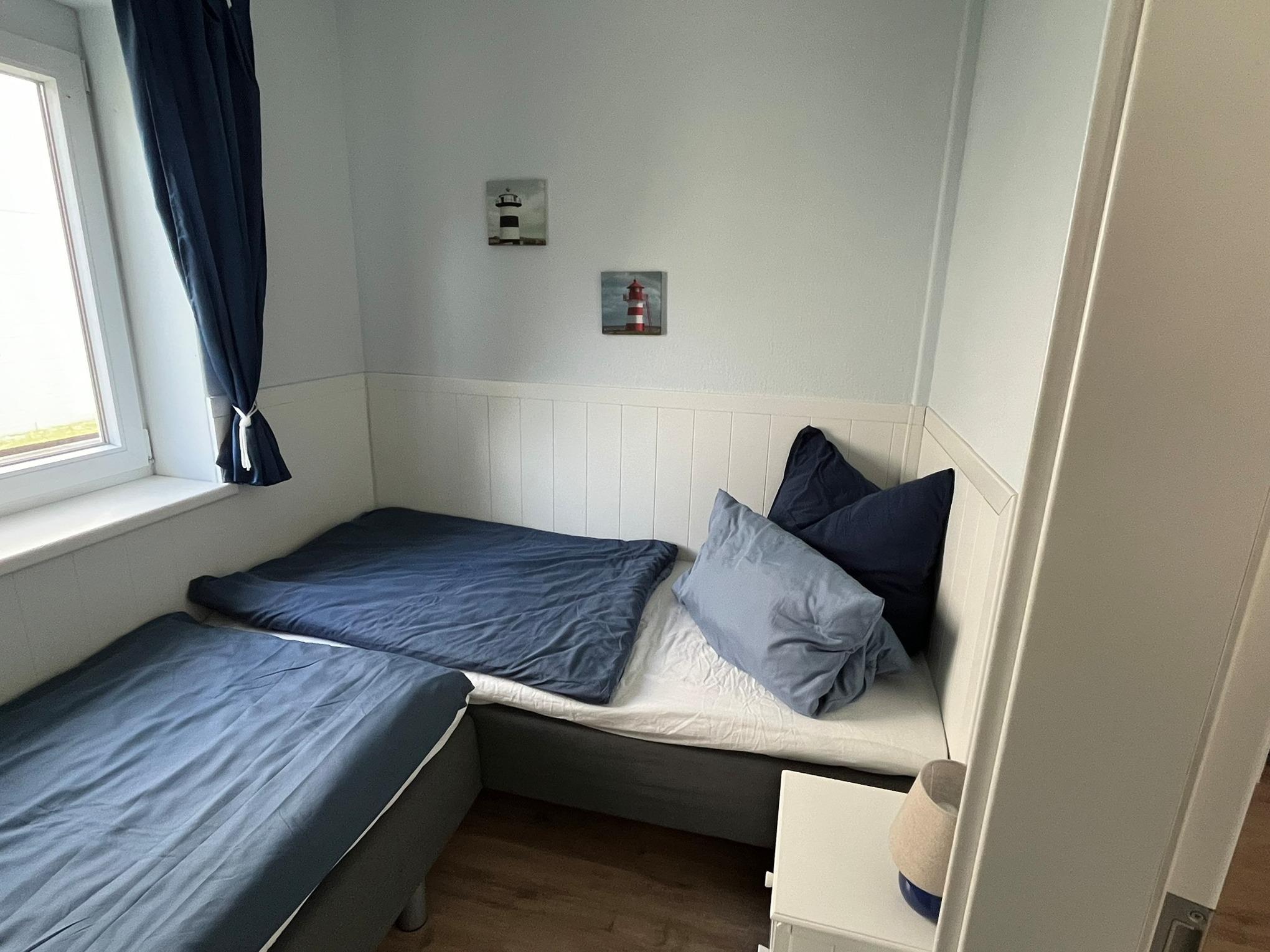 Der Schlafraum ist vom Wohnraum abgetrennt, er beherbergt zwei bequeme Boxspringbetten.