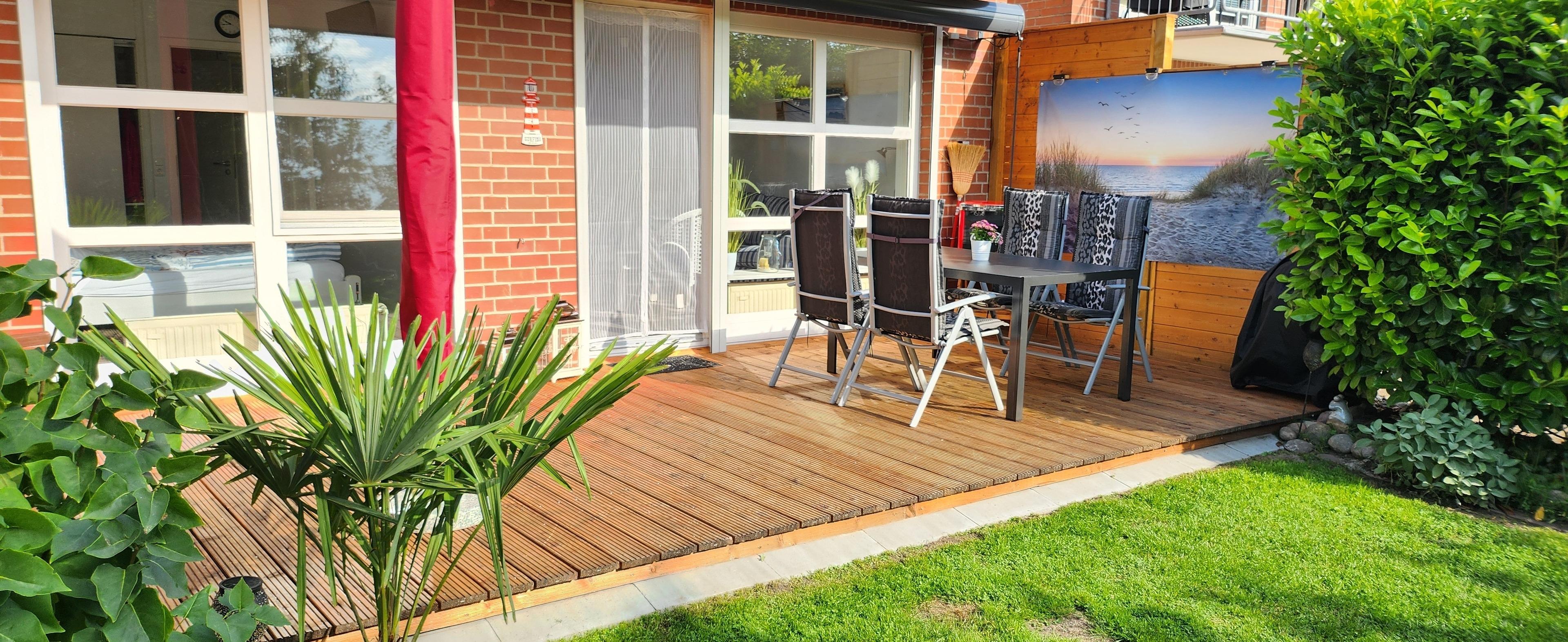 Die Ferienwohnung " Baltic " befindet sich in einer sehr ruhigen Lage im Eschenweg 1 am Schönberger Strand im Erdgeschoss. Sie ist ein Teil einer kleinen Appartementanlage mit nur wenigen Einheiten und verfügt über eine zum Teil überdachte Holzterrasse und davor liegende Rasenfläche.