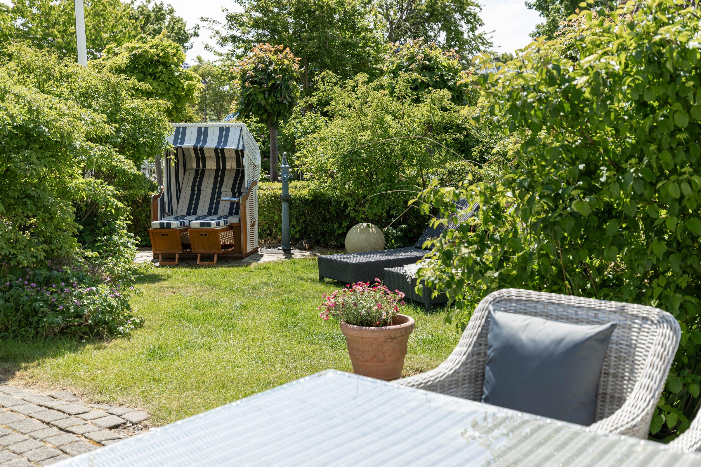 Zwei herrliche Sonnenterrassen mit hochwertigen Gartenmöbeln und der aufwendig gestaltete Garten laden zum verweilen ein. Oder Sie machen es sich im Garten im Strandkorb gemütlich.