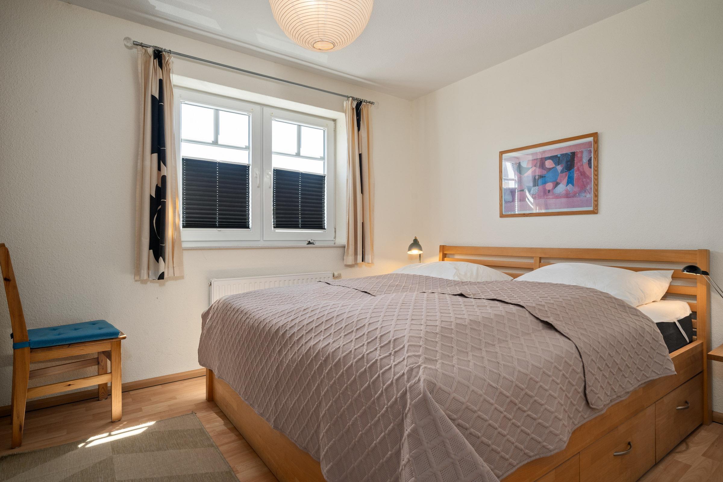 Schlafzimmer 1: 1 Doppelbett (2x 90x200 cm), Kleiderschrank, Verdunkelung: Plissees, Gardinen