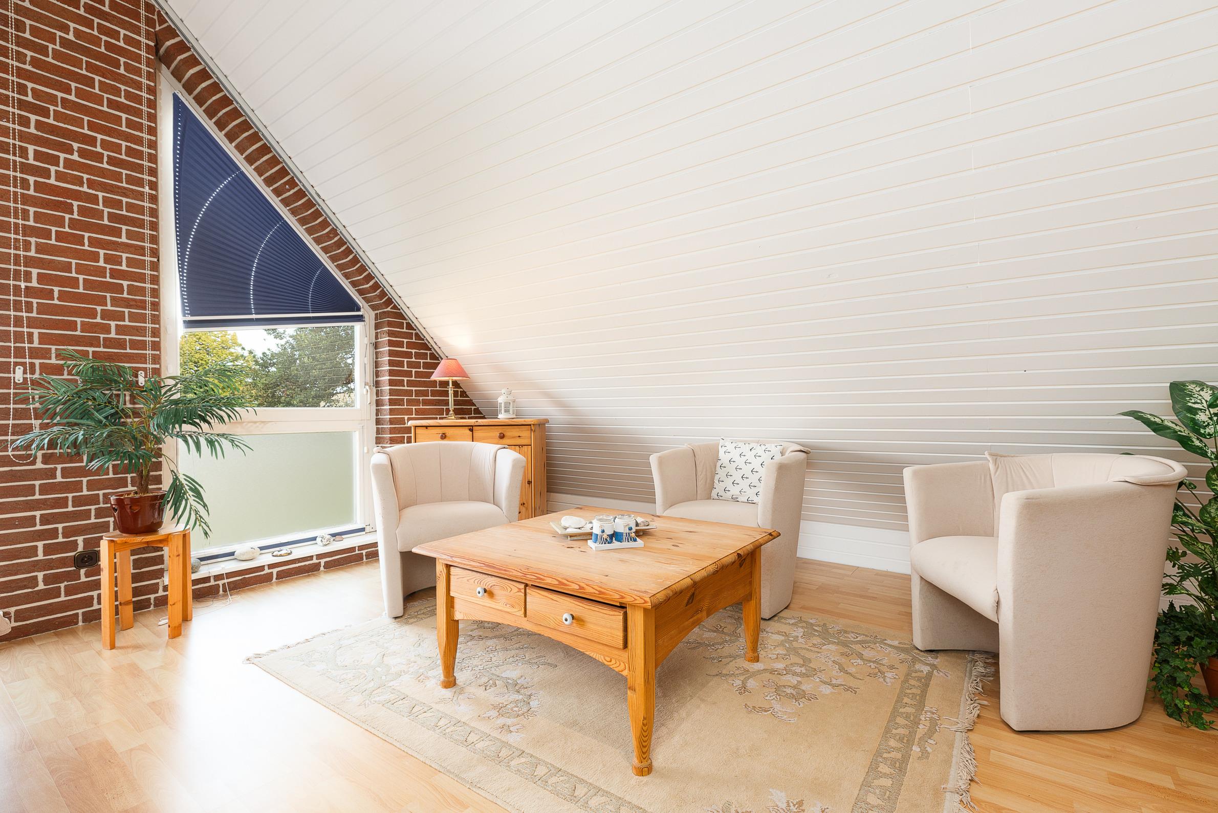 Die ca. 80 m² große Ferienwohnung erstreckt sich über zwei Ebenen und verfügt über ein Duschbad, eine gut ausgestattete offene Küche, ein Schlafzimmer mit einem französischen Bett (160x200 cm) und im oberen Bereich über zwei zusätzliche Einzelbetten. Vom Wohnbereich mit einem großen Sofa und einem Sessel für gemütliche Abende können Sie direkt auf dem Balkon treten. Außerdem erwartet Sie im oberen Bereich eine Sessel-Lounge für geselliges Beisammensein. Kostenloses WLAN ist hier inklusive.