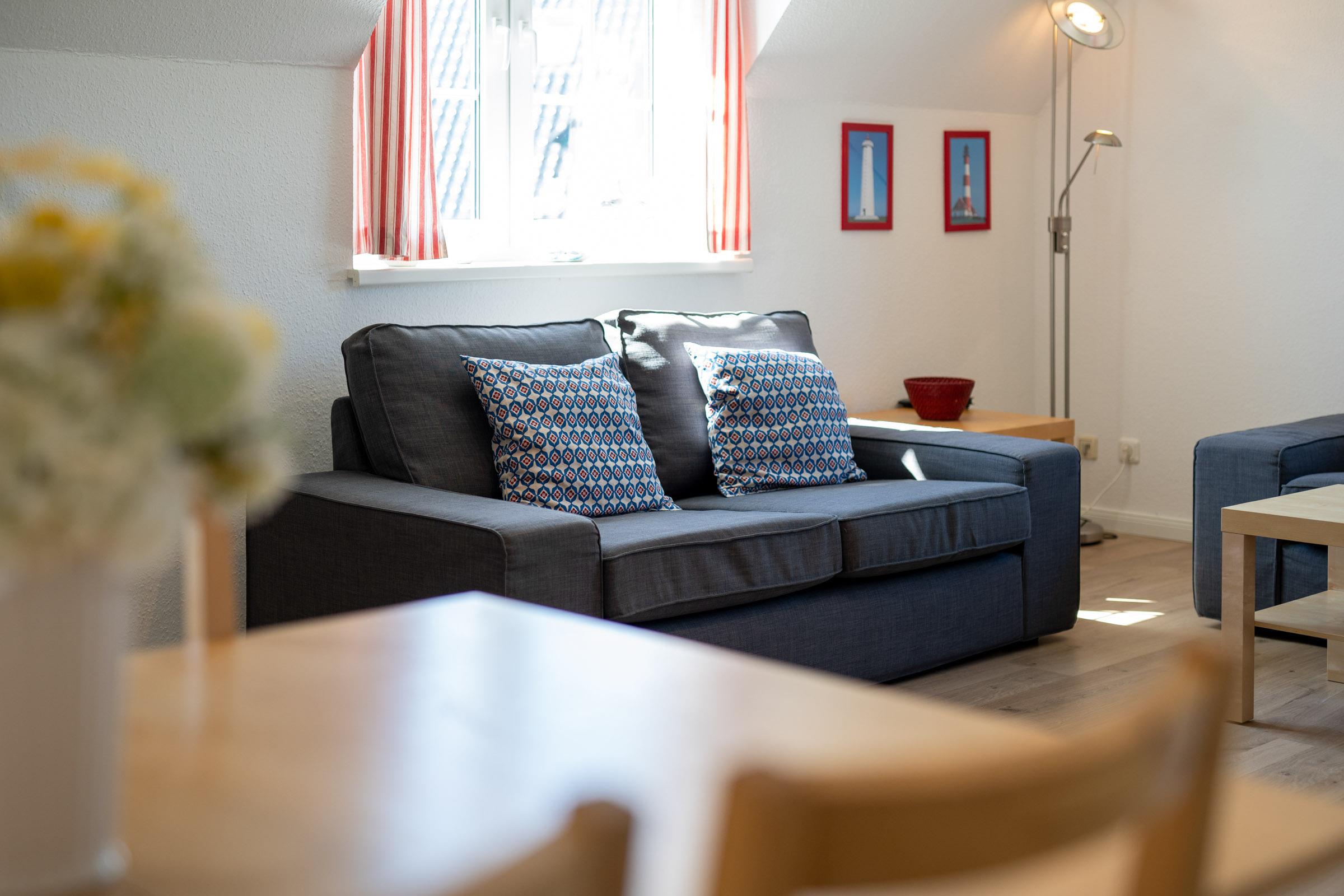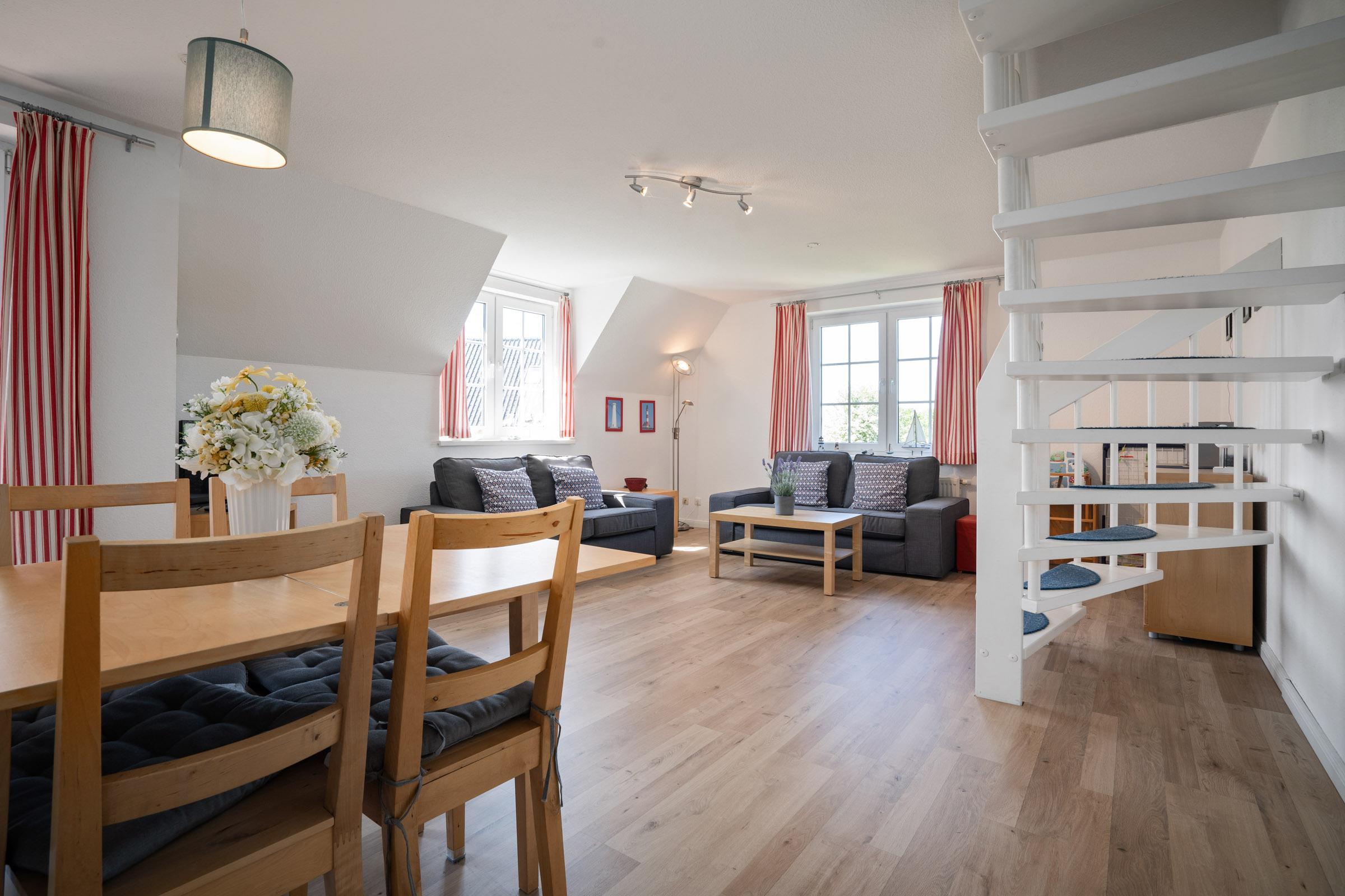 Auf einer Wohnfläche von ca. 65 m² verteilen sich ein Wohnzimmer mit intergrierter Küchenzeile und Essbereich, ein Duschbad und zwei separate Schlafzimmer im Dachgeschoss, die mit einem Doppelbett (2x 90x200 cm) und zwei Einzelbetten (je 90x200 cm) ausgestattet sind.