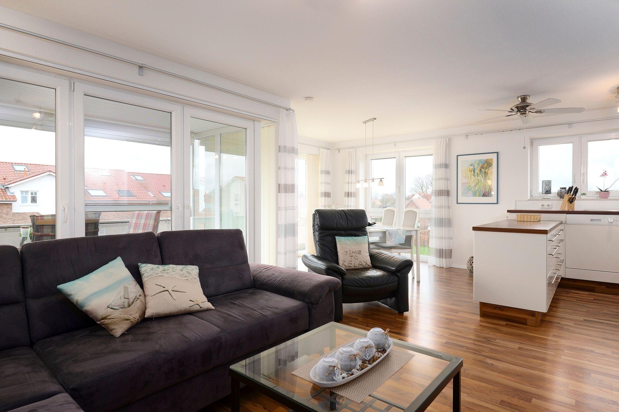 Die moderne, lichtdurchflutete 3-Zimmer-Ferienwohnung lädt Sie zum Entspannen und Relaxen ein. Auf 78 qm verteilen sich zwei separate Schlafzimmer, ein Duschbad und ein Wohnzimmer mit offener Küche. Ihre Ferienwohnung erreichen Sie bequem über einen Fahrstuhl.