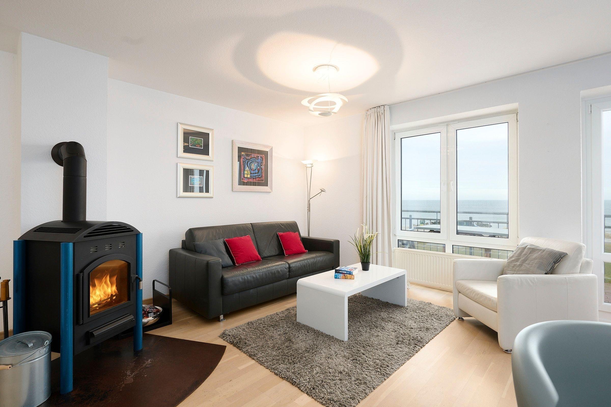 Das Wohnzimmer ist mit einer Schlafcouch (160x200cm), einem grossen modernen Flachbildfernseher, Mini-Stereoanlage, DVD-Player und einem kostenfreien Wlan-Anschluss ausgestattet. Die wohlige Wärme aus dem Kaminofen sorgt für Gemütlichkeit und ist ein weiteres Highlight Ihrer Ferienwohnung. Das Duschbad verfügt über eine Regendusche, Handtuchwärmer und Fön.