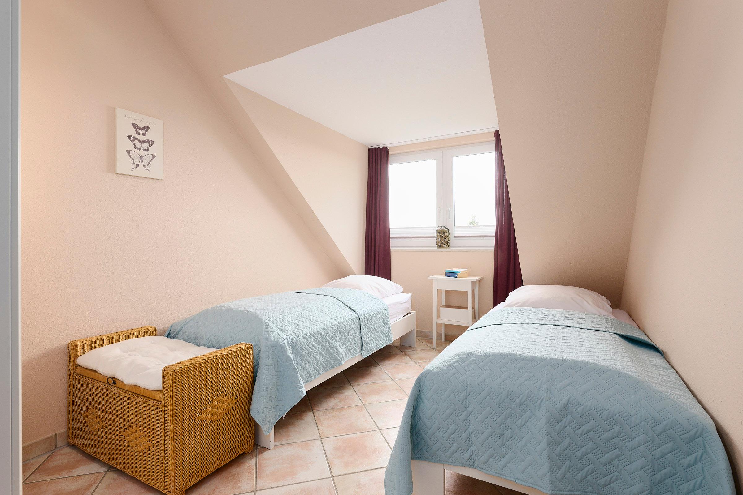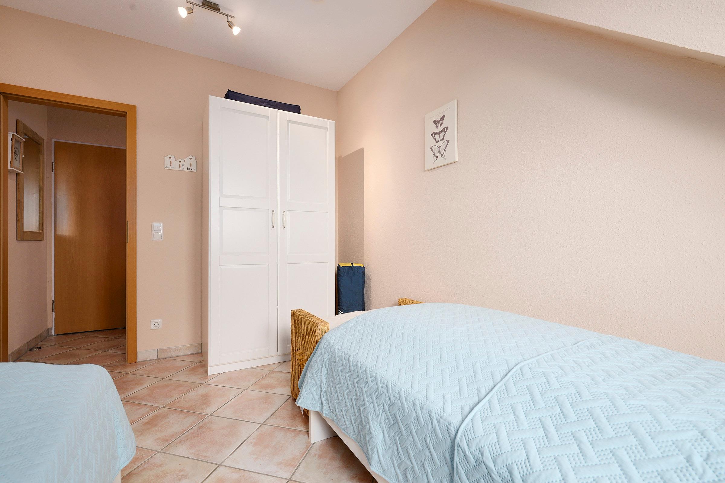 Schlafzimmer 2: 2 Einzelbetten (je 90x200 cm), Kleiderschrank, Verdunkelung: Vorhänge