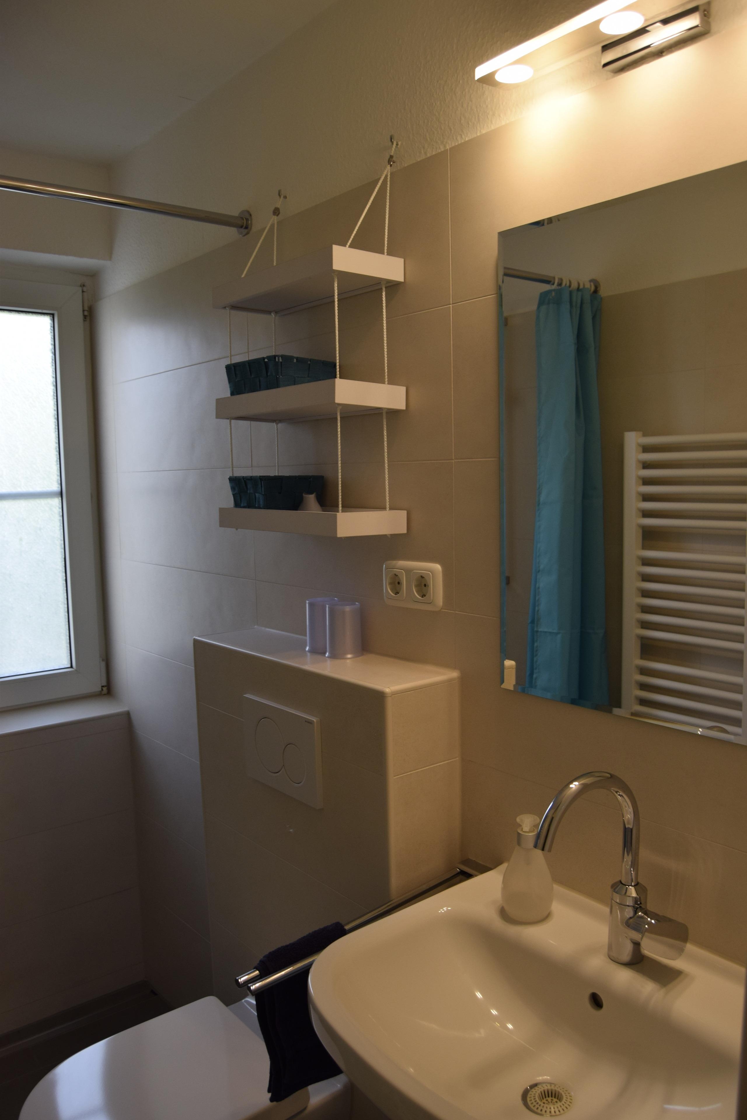 Das Badezimmer ist 2,8 m² groß und mit einer ebenerdigen Dusche sowie einem WC ausgestattet. Es gibt einen Handtuchwärmer sowie genügend Ablagefläche .