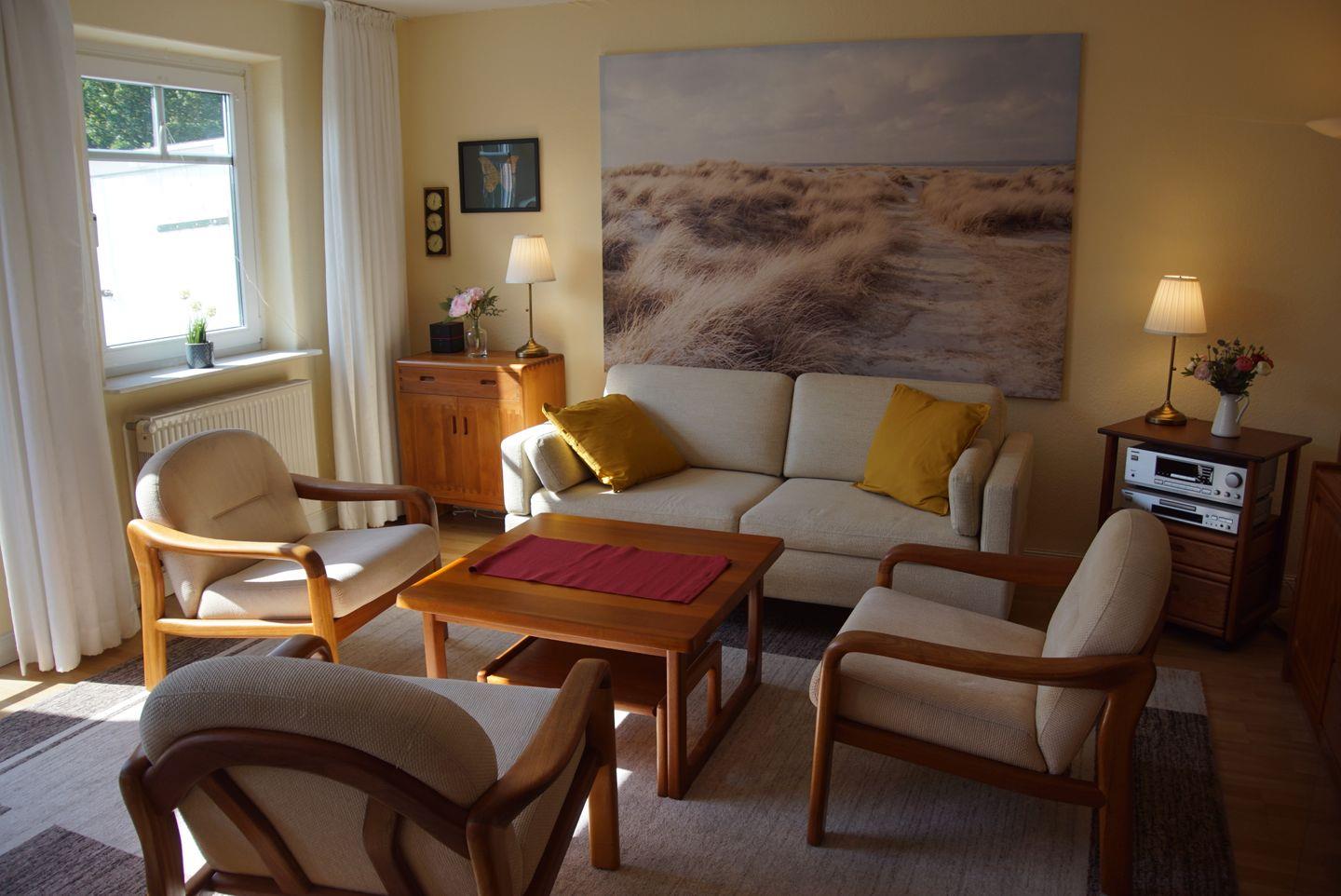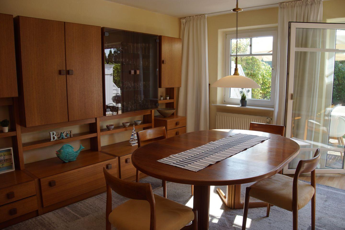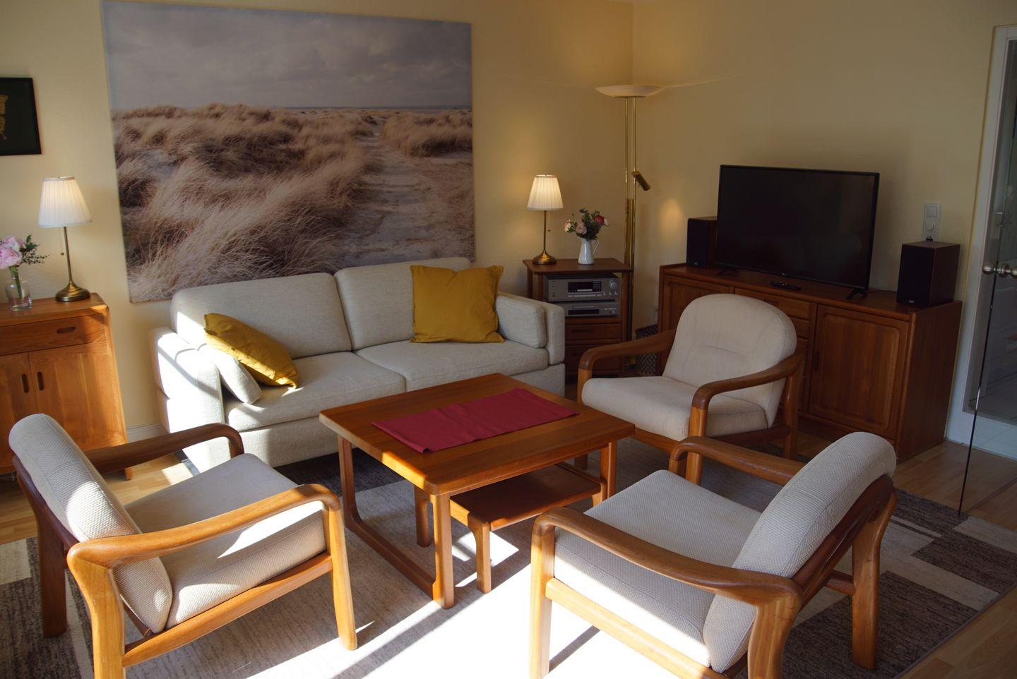 Das Wohnzimmer lädt mit einer gemütlichen Polstergarnitur zum Entspannen ein. Ein LED-TV und eine Stereoanlage mit CD sorgen für Unterhaltung und musikalische Begleitung. Der angrenzende Essbereich bietet einen Esstisch mit fünf Stühlen und einem Kinderhochstuhl, an dem Sie gemeinsame Mahlzeiten genießen können.