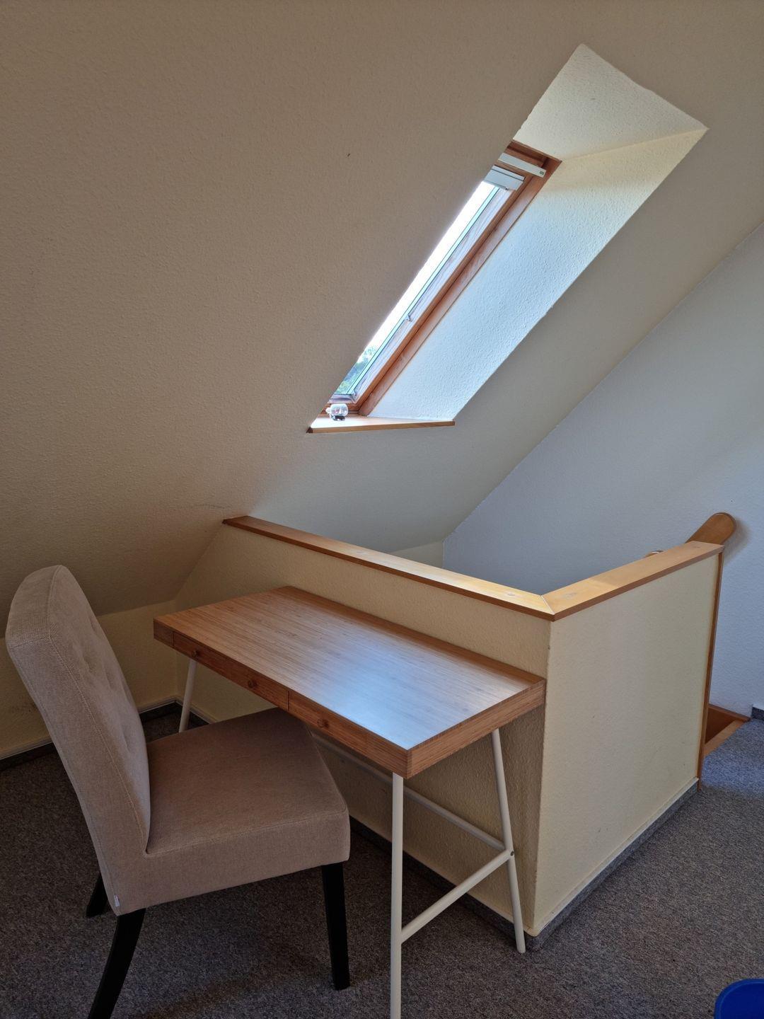 Das Schlafzimmer im ausgebauten Dachgeschoss lädt mit einem gemütlichen Doppelbett und einem großzügigen Kleiderschrank zum Entspannen und Träumen ein. Die Veluxverdunklung sorgt dafür, dass Sie eine erholsame Nachtruhe genießen können. Außerdem steht Ihnen ein Schreibtisch mit Sitzgelegenheit für eventuelle Home-Office Tätigkeiten zur Verfügung.