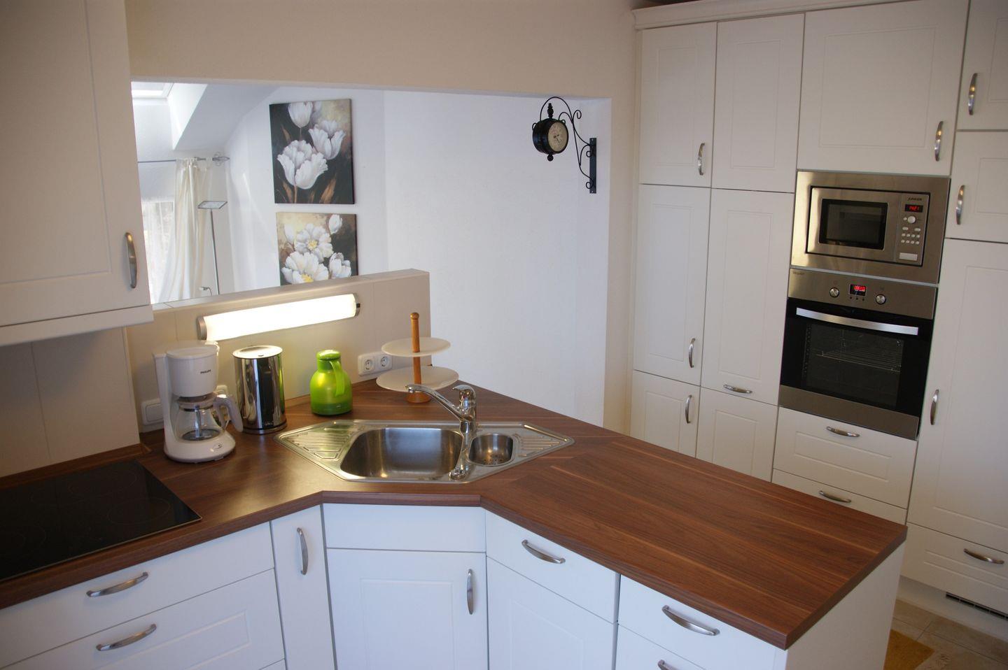 Beim Betreten der Wohnung werden Sie sofort von der geschmackvollen Inneneinrichtung beeindruckt sein. Die Einbauküche ist modern und komplett ausgestattet, mit einem Cerankochfeld, einem Hoch-Backofen, einer Mikrowelle, einer Spülmaschine, einem Kühlschrank mit Gefrierfach und allen weiteren Utensilien, die Sie zum Kochen benötigen. Ein Tresen mit drei Barstühlen lädt zu geselligen Kochabenden ein. Der offene Küchen- und Essbereich bietet einen Esstisch mit vier bequemen Stühlen, an dem Sie gemeinsame Mahlzeiten genießen können.