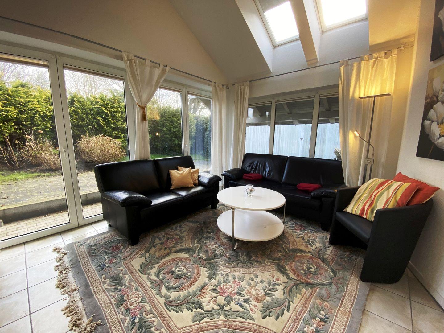 Der Wohnbereich mit Wintergarten ist der perfekte Ort zum Entspannen. Hier finden Sie ein bequemes Sofa, zwei Sessel und einen Flachbildfernseher für gemütliche Fernsehabende. Vom Wohnzimmer aus gelangen Sie auf die nordöstlich ausgerichtete Terrasse, die teilweise überdacht ist und somit auch bei leichtem Regen Schutz bietet.