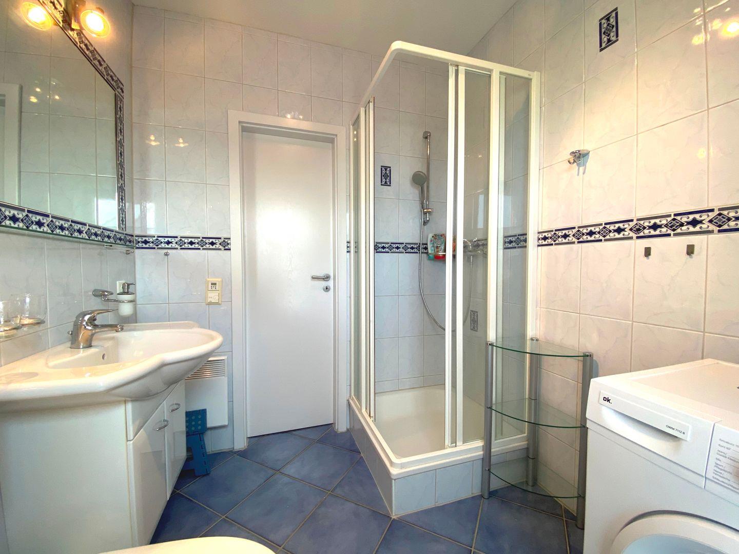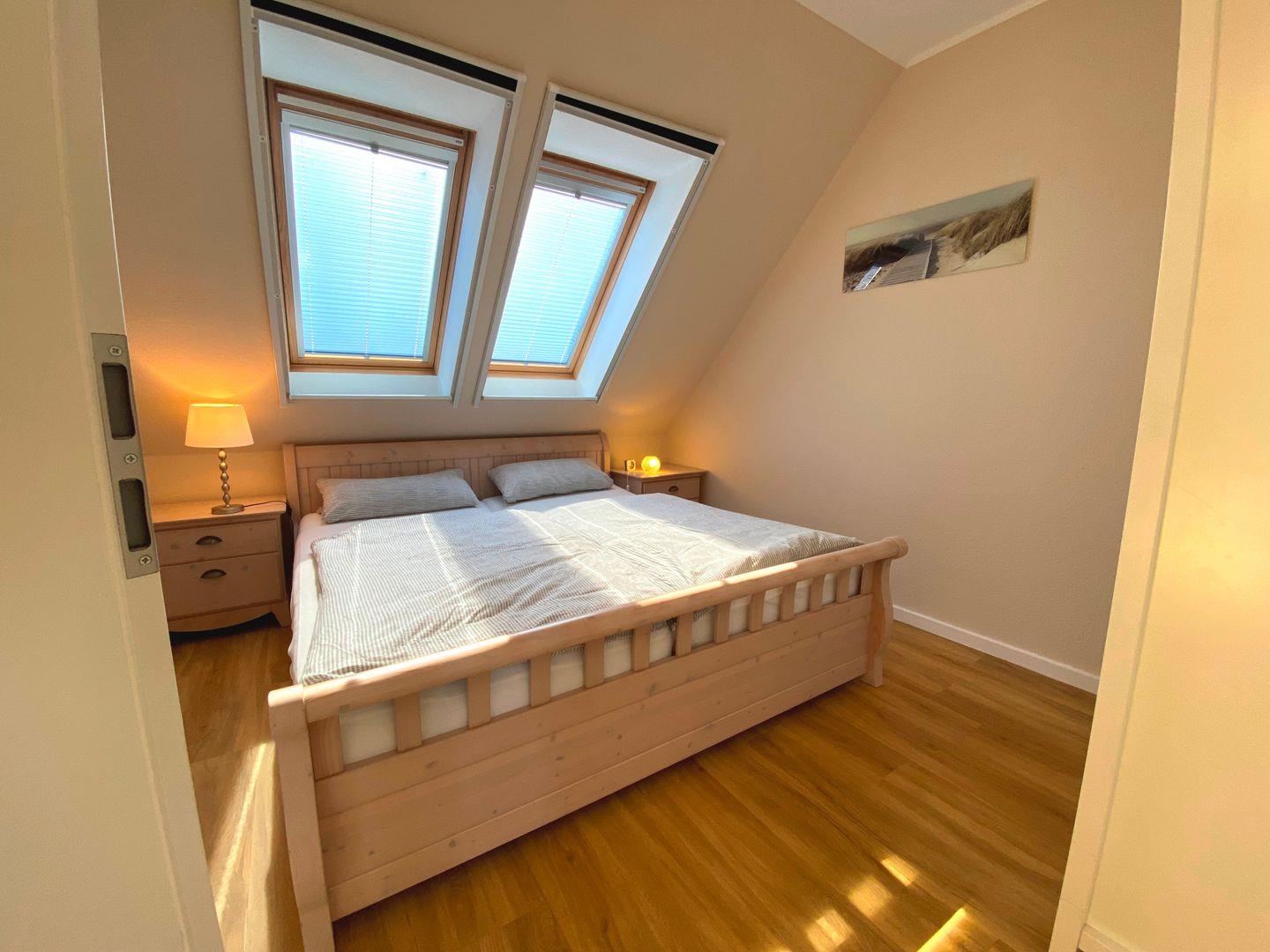 Im hinteren Bereich der Wohnung erwartet Sie ein gemütliches Schlafzimmer mit einem bequemen Doppelbett mit Rausfallschutz für Kleinkinder und einem geräumigen Kleiderschrank. Das angrenzende Wohnzimmer kann bei Bedarf mühelos in ein weiteres Schlafzimmer verwandelt werden, sodass auch Familien oder befreundete Paare genügend Platz finden. Das moderne Duschbad mit Fenster bietet die Möglichkeit, sich nach einem langen Tag am Strand zu erfrischen.