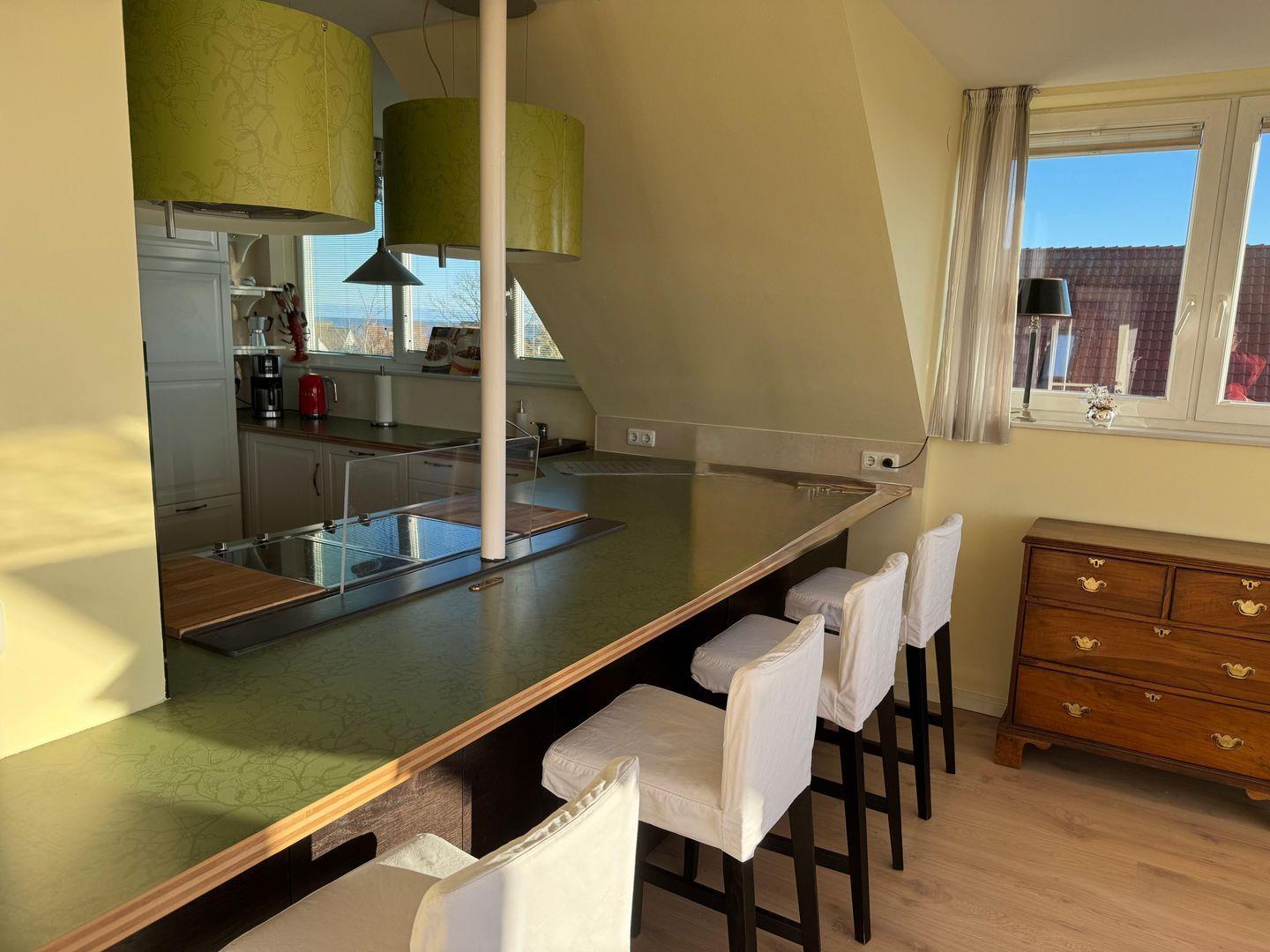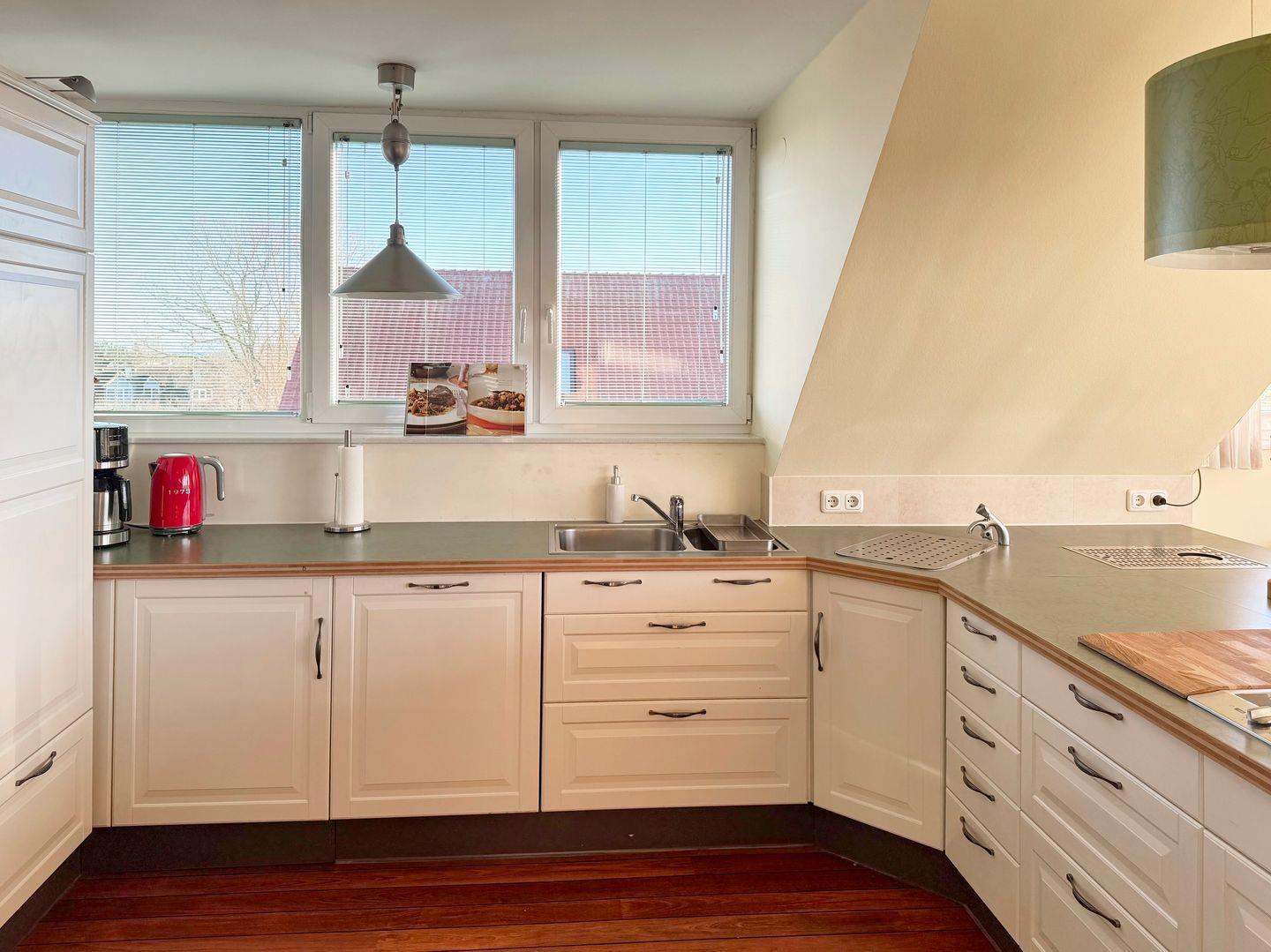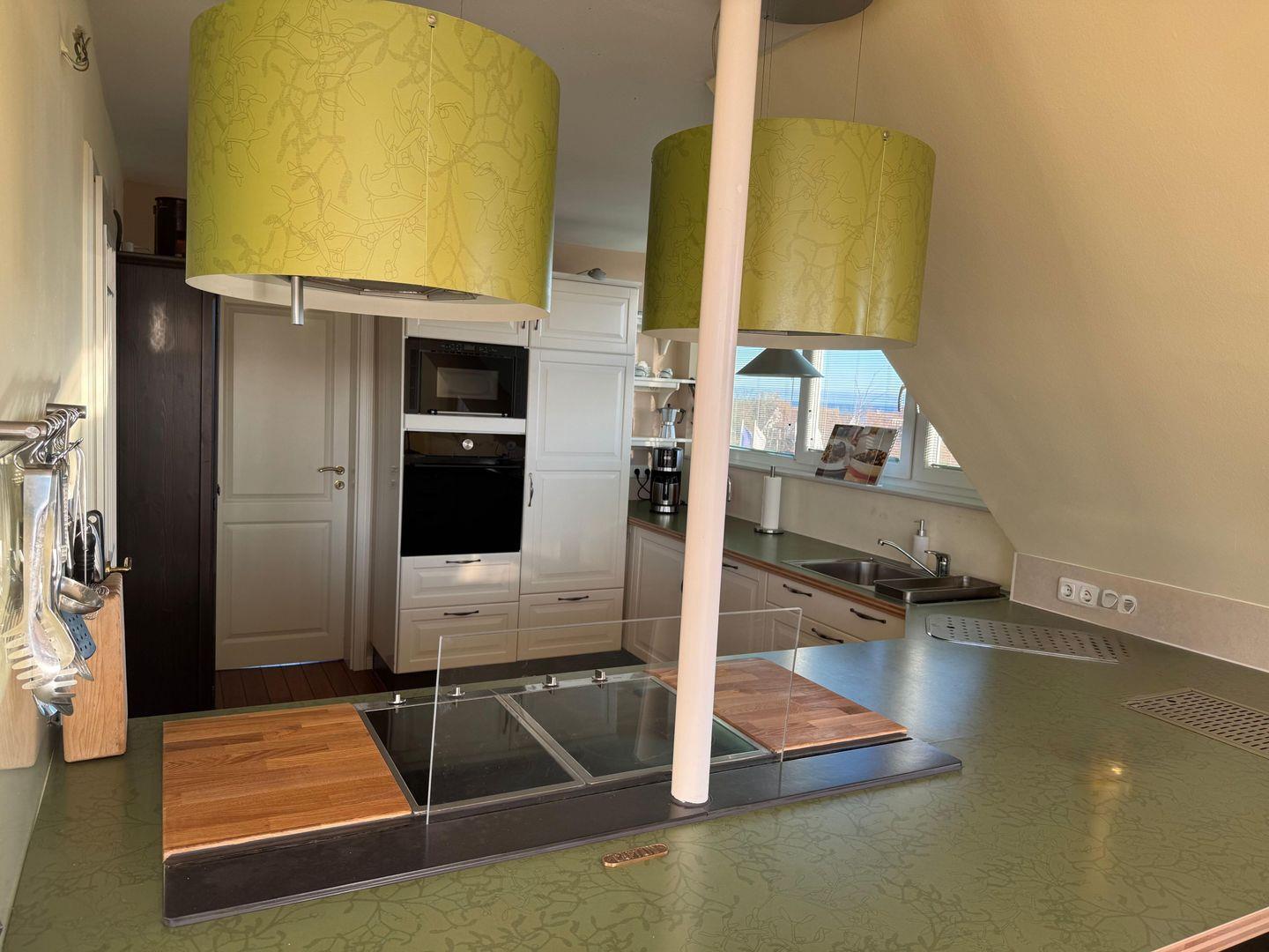 Die offene Küche ist mit modernen Geräten wie Cerankochfeld, Backofen und Spülmaschine ausgestattet und lässt keine Wünsche offen. Ein Wasserkocher, eine Kaffeemaschine und ein Mixer ermöglichen es Ihnen, auch während Ihres Urlaubs schnell und einfach Ihre Lieblingsgerichte zu zaubern. Genießen Sie schöne Stunden auf dem überdachten Balkon, der einen herrlichen Blick auf die Umgebung bietet.