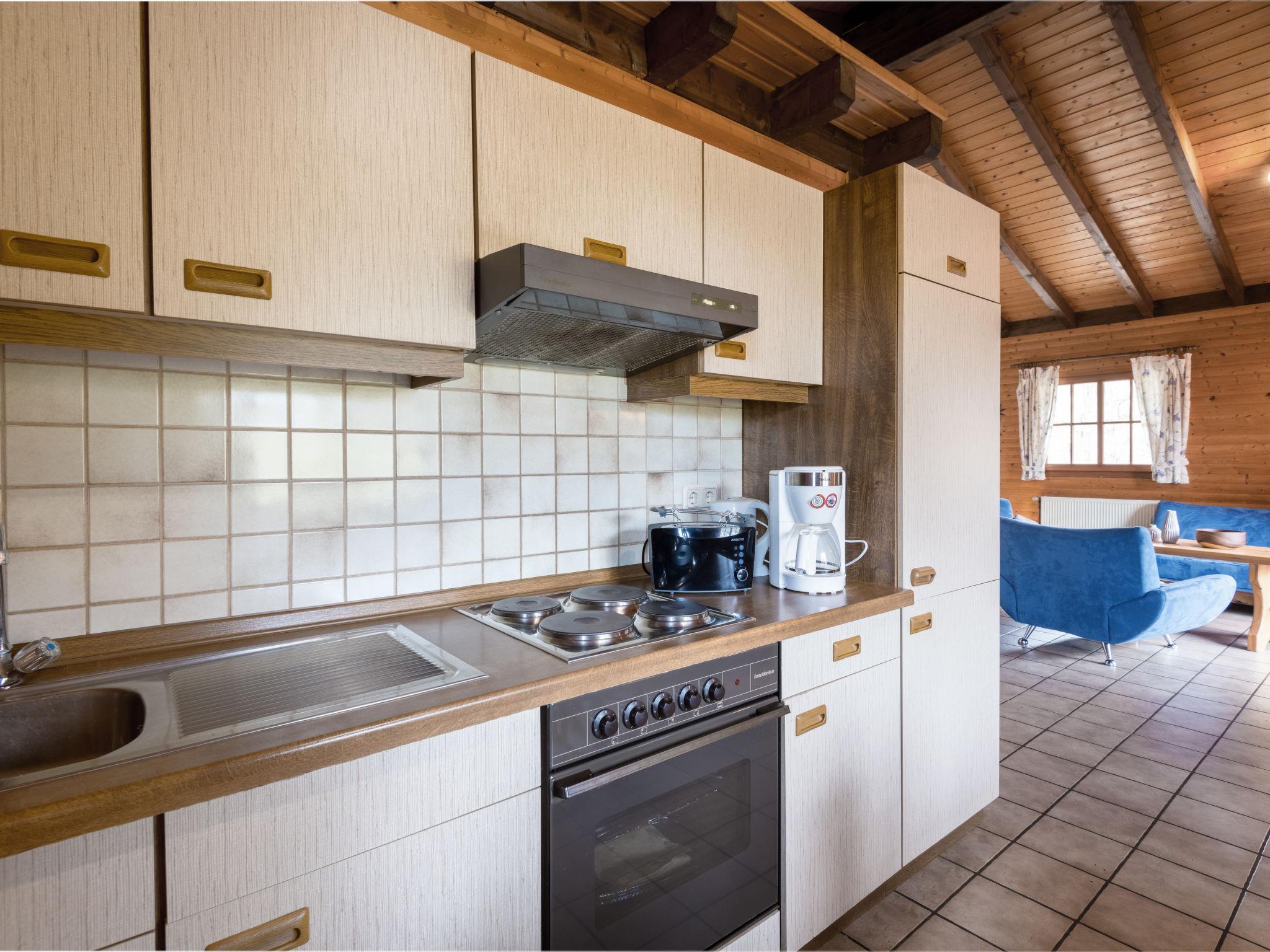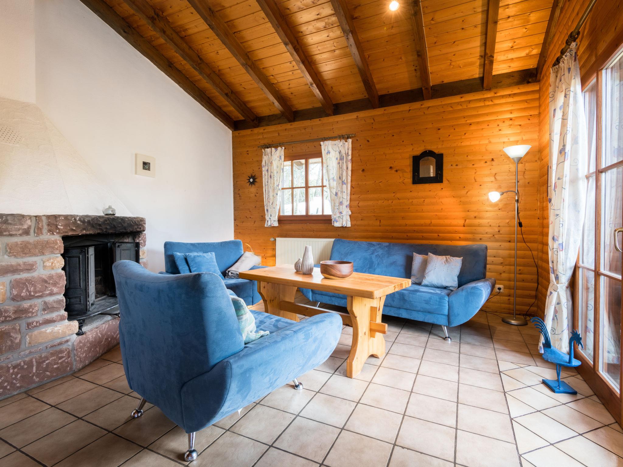 3-room apartment 70 m2, on the upper floor. Cosy and wooden furniture furnishings: living/dining room 40 m2 with open-hearth fireplace and satellite TV (flat screen). Exit to the balcony. 1 room 11 m2 with 1 double bed (180 cm, length 200 cm). 1 room 5 m2 with 1 x 2 bunk beds (90 cm, length 200 cm). Kitchenette (4 hot plates, oven, toaster, kettle, electric coffee machine). Shower/WC. Gas heating. Balcony 7 m2. Balcony furniture. Facilities: logs (extra). Internet (WiFi, free). Please note: non-smokers only. Maximum 1 pet/ dog allowed. Smoke alarm, fire extinguisher. Second pet possible on request (payment per dog/day on site). Access to the upper floor (wooden construction) via external staircase. Bookings accepted for holiday purposes only.