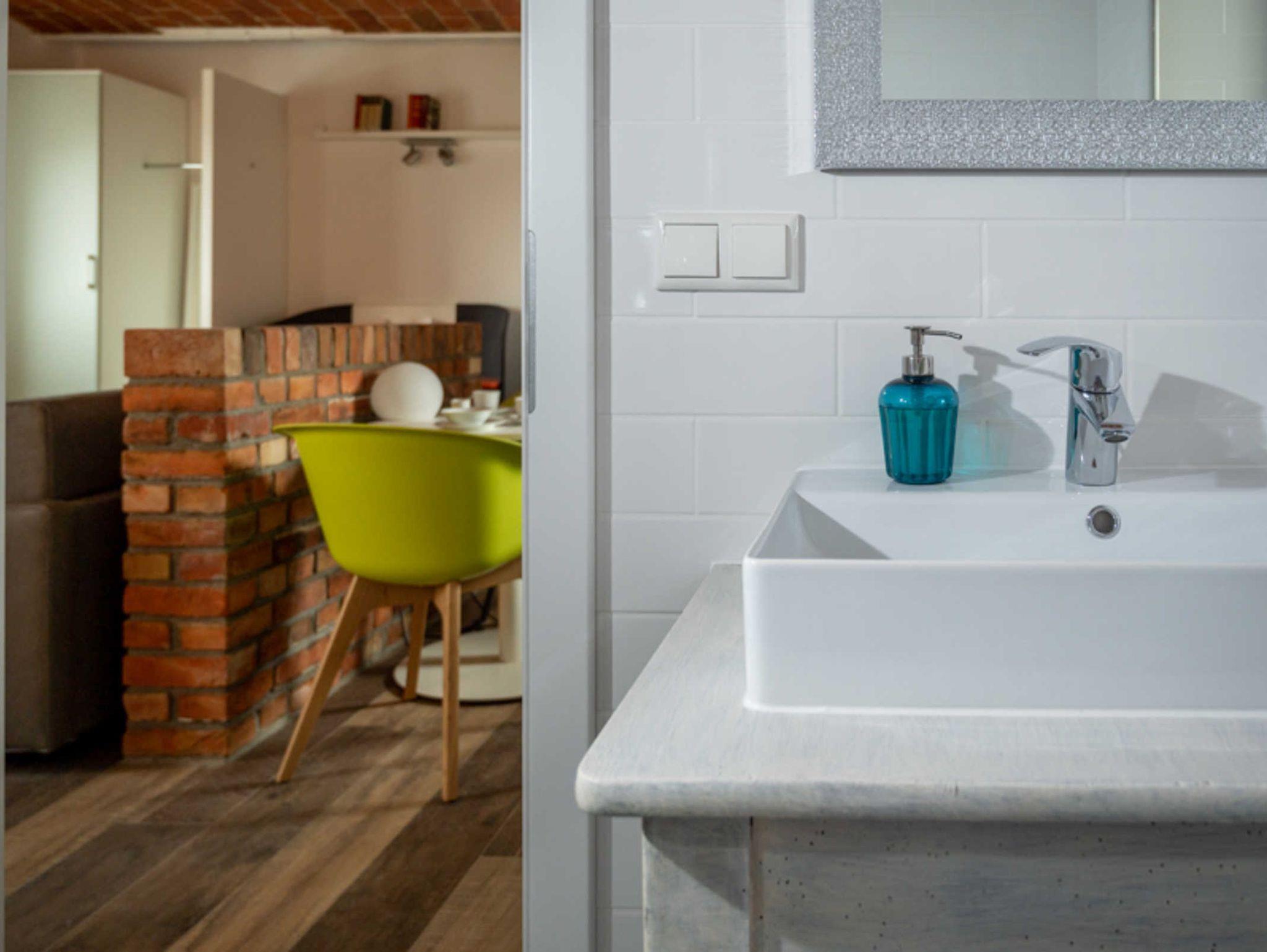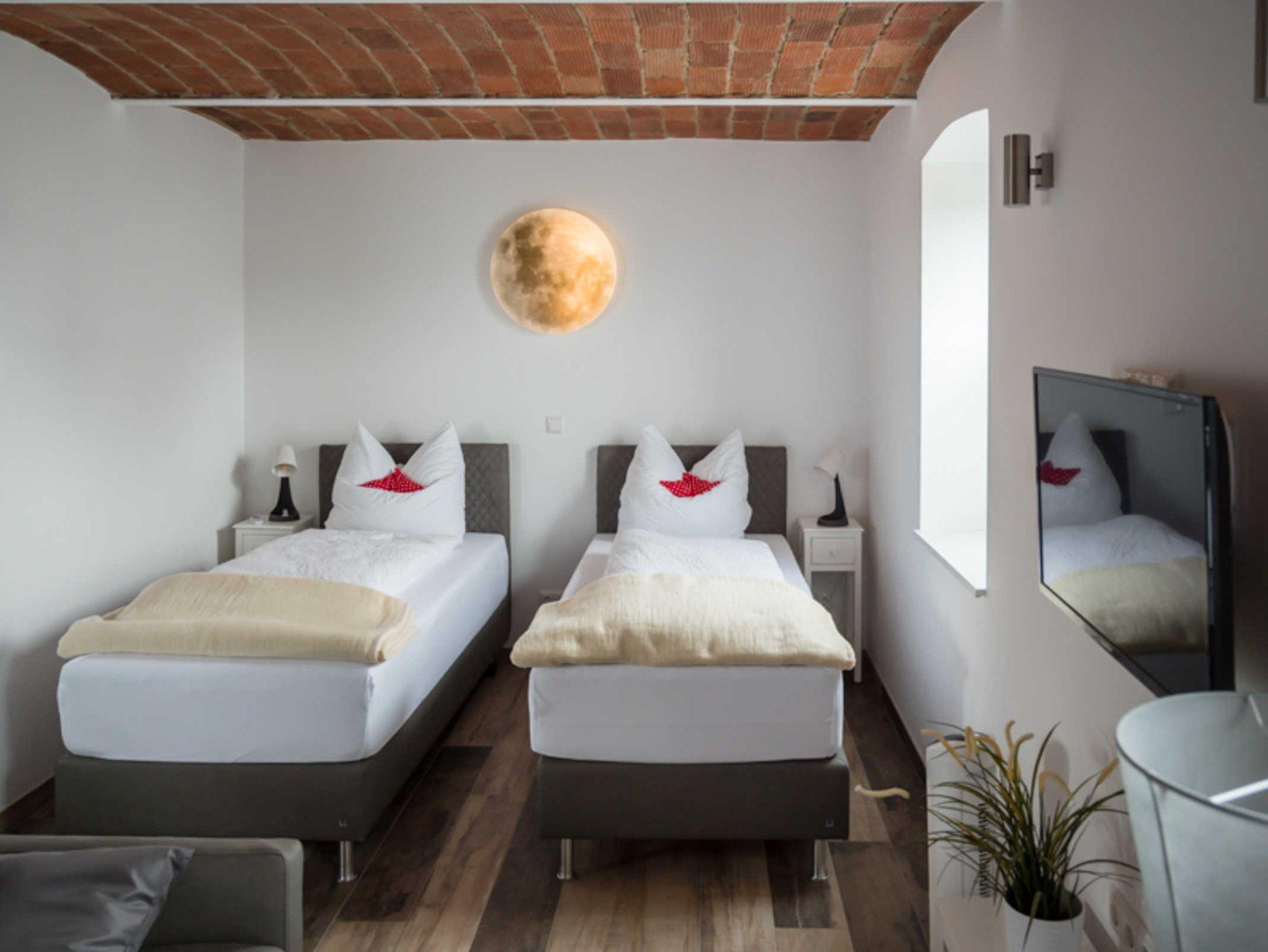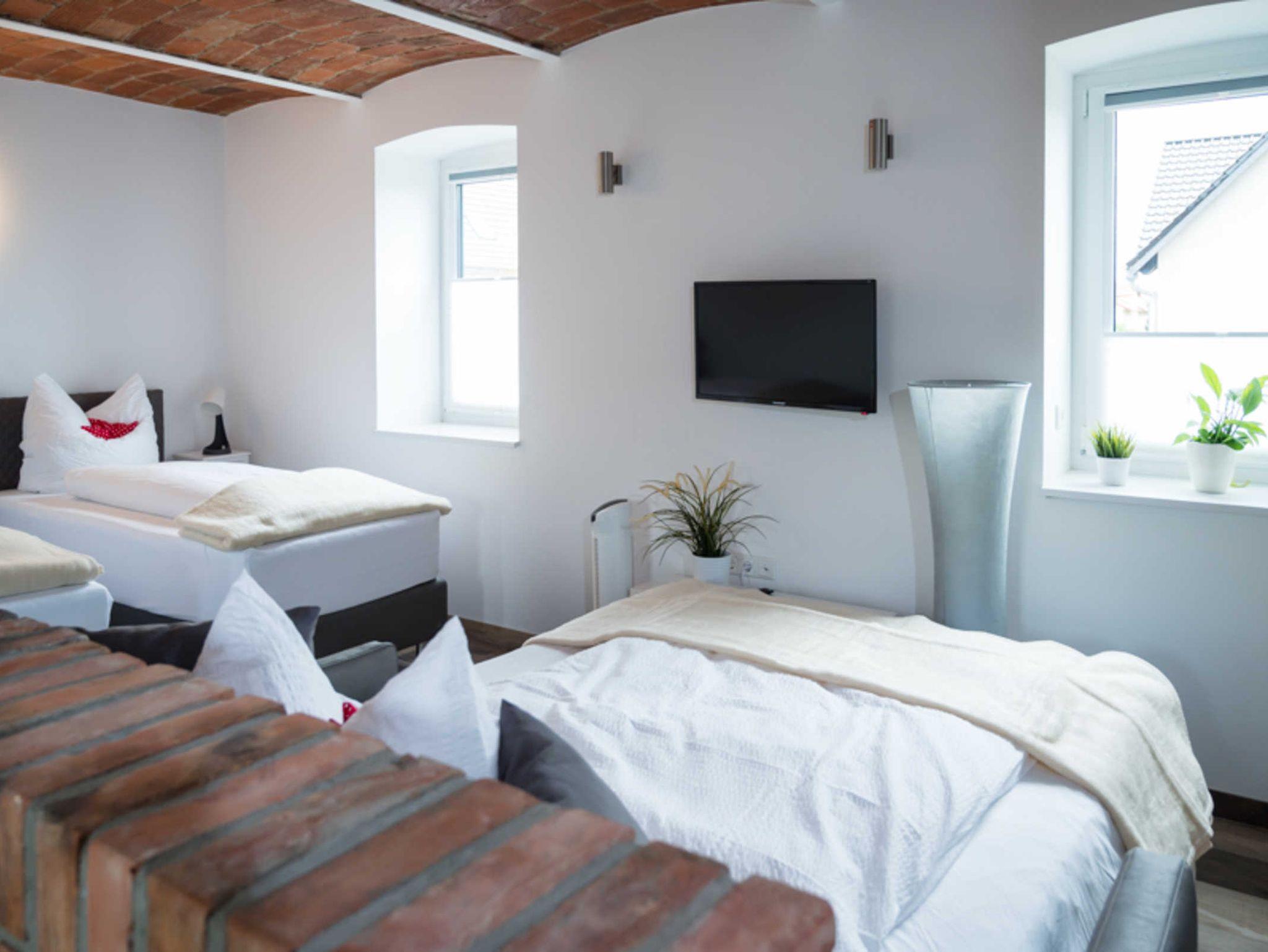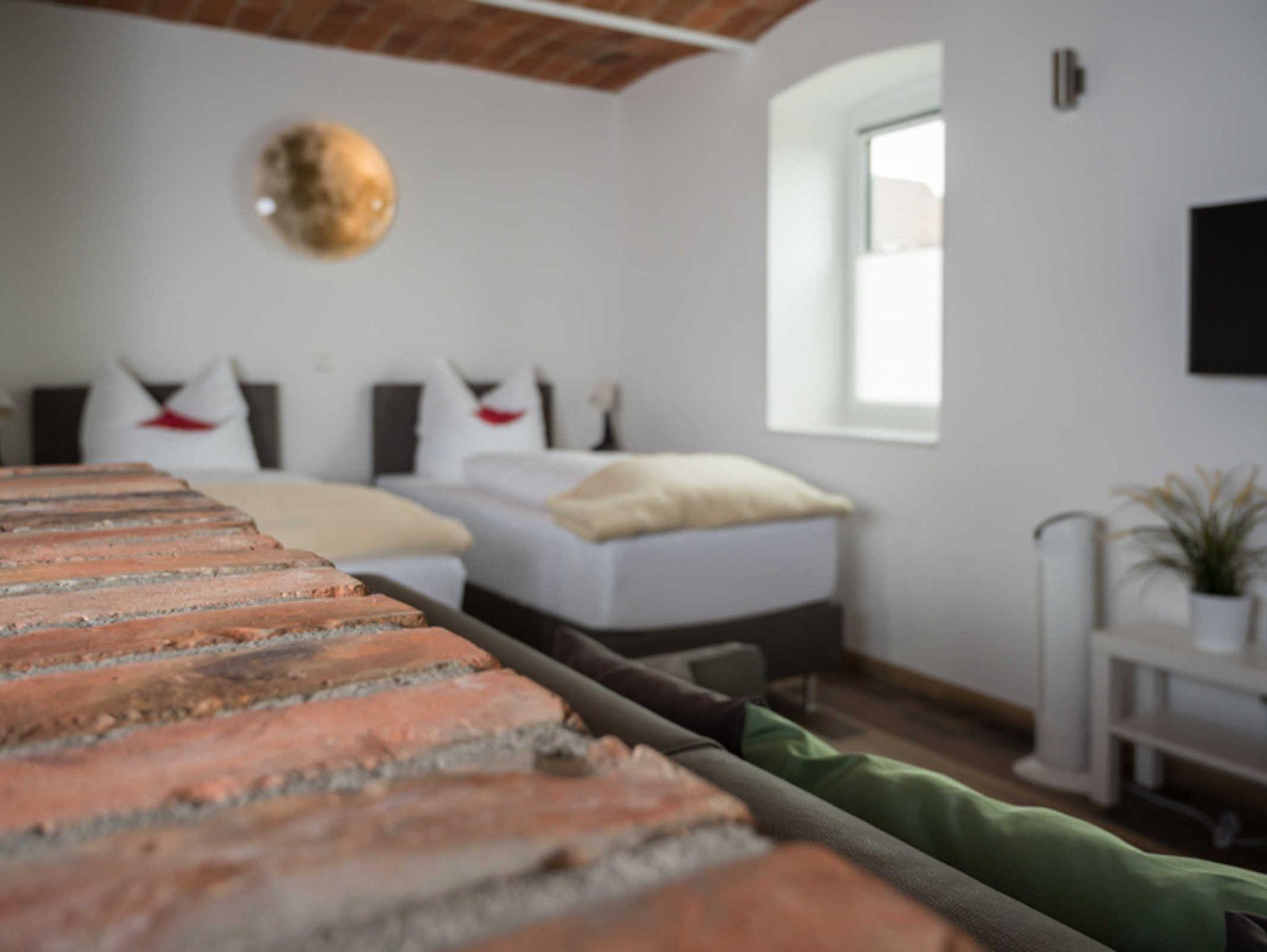Ein altes Stallgebäude wurde komplett entkernt und im Erdgeschoss neu aufgebaut. Innen erinnern lediglich die Kappendecken sowie die Fenster Laibungen an die alten Gemäuer. Ein Zugang ermöglicht unseren Gästen den Weg zu den Appartements ohne direkten Kontakt mit den vierbeinigen Hofbewohnern zu haben.