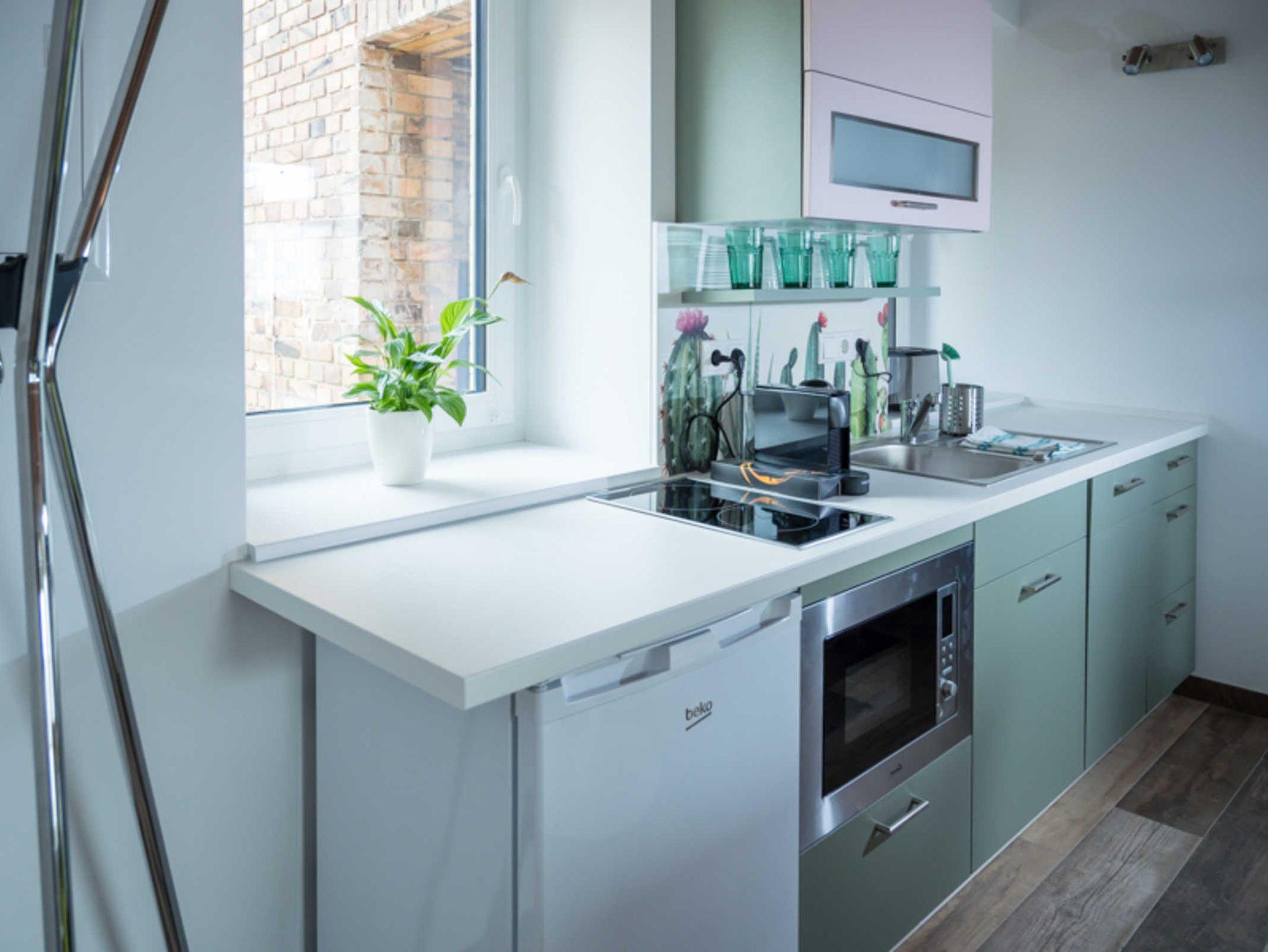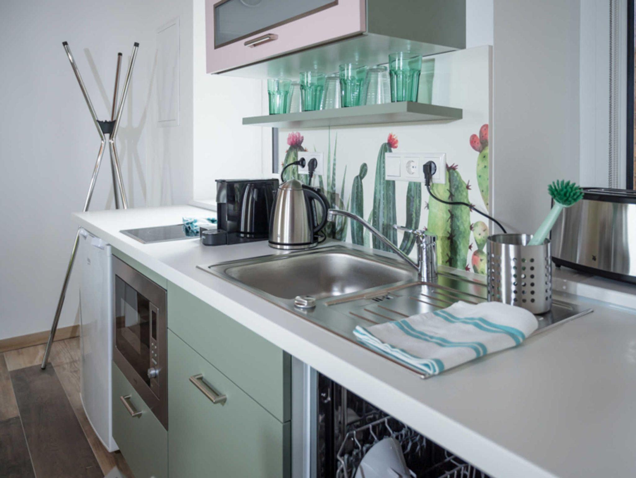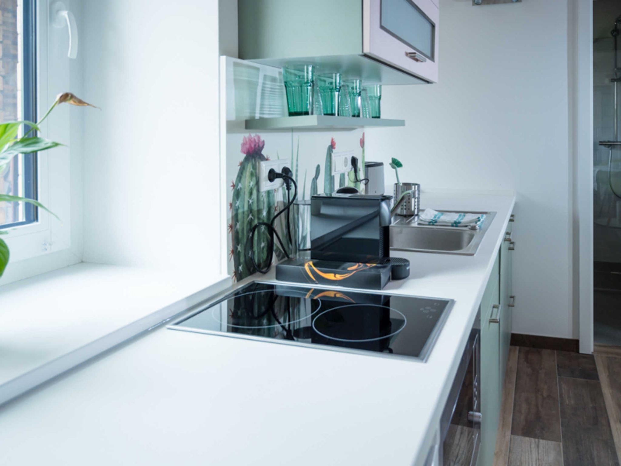 Küche- Komplett neuwertige Küchenzeile mit Kühlschrank inkl. kleinem Gefrierfach, Kochfeld, Mikrowelle mit Grillfunktion, Geschirrspüler, Toaster, Wasserkocher und Nespresso-Kaffeemaschine stehen bereit. Ein direkt angrenzender Essplatz bietet Platz für bis zu 3 Personen.