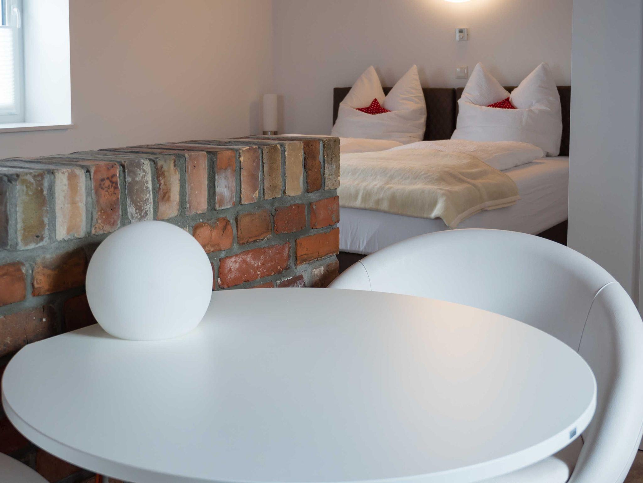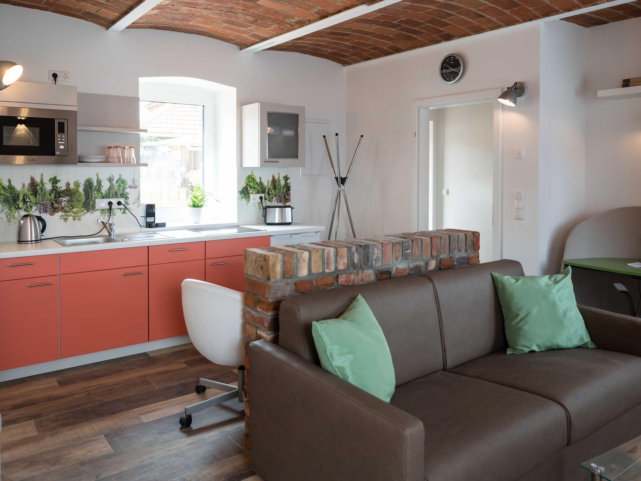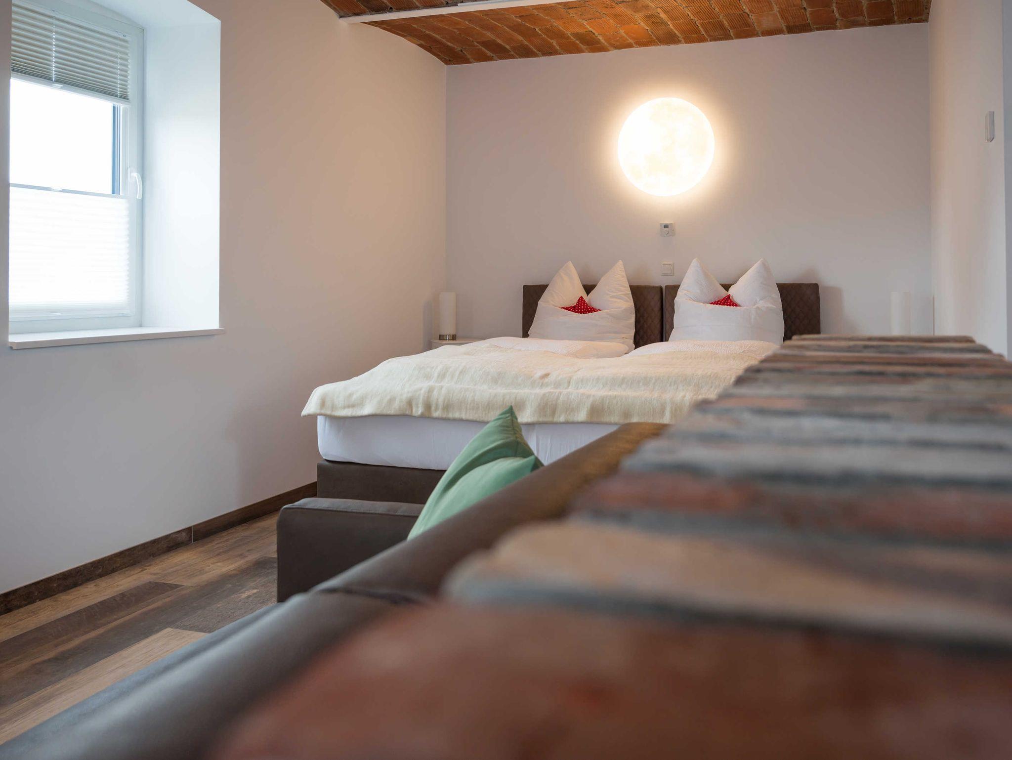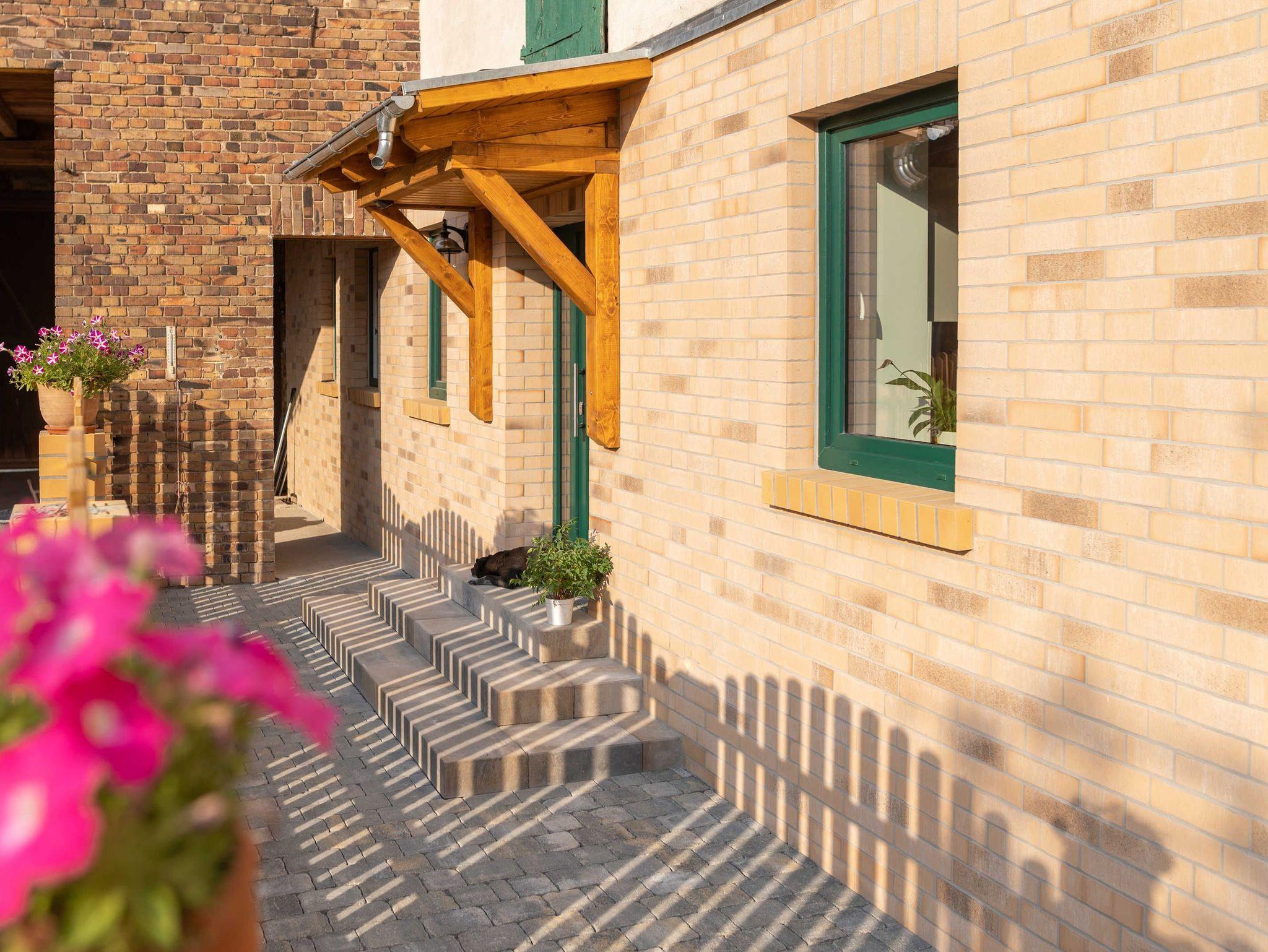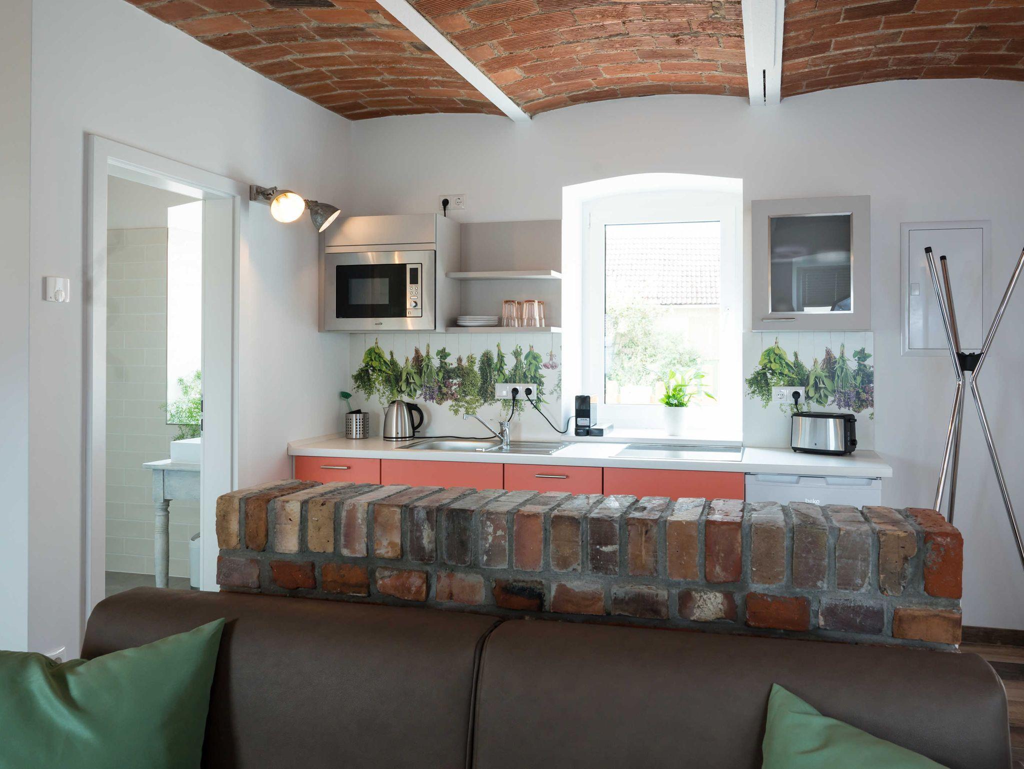 Ein altes Stallgebäude wurde komplett entkernt und im Erdgeschoss neu aufgebaut. Innen erinnern lediglich die Kappendecken sowie die Fenster Laibungen an die alten Gemäuer. Ein Zugang ermöglicht unseren Gästen den Weg zu den Appartements ohne direkten Kontakt mit den vierbeinigen Hofbewohnern zu haben.
