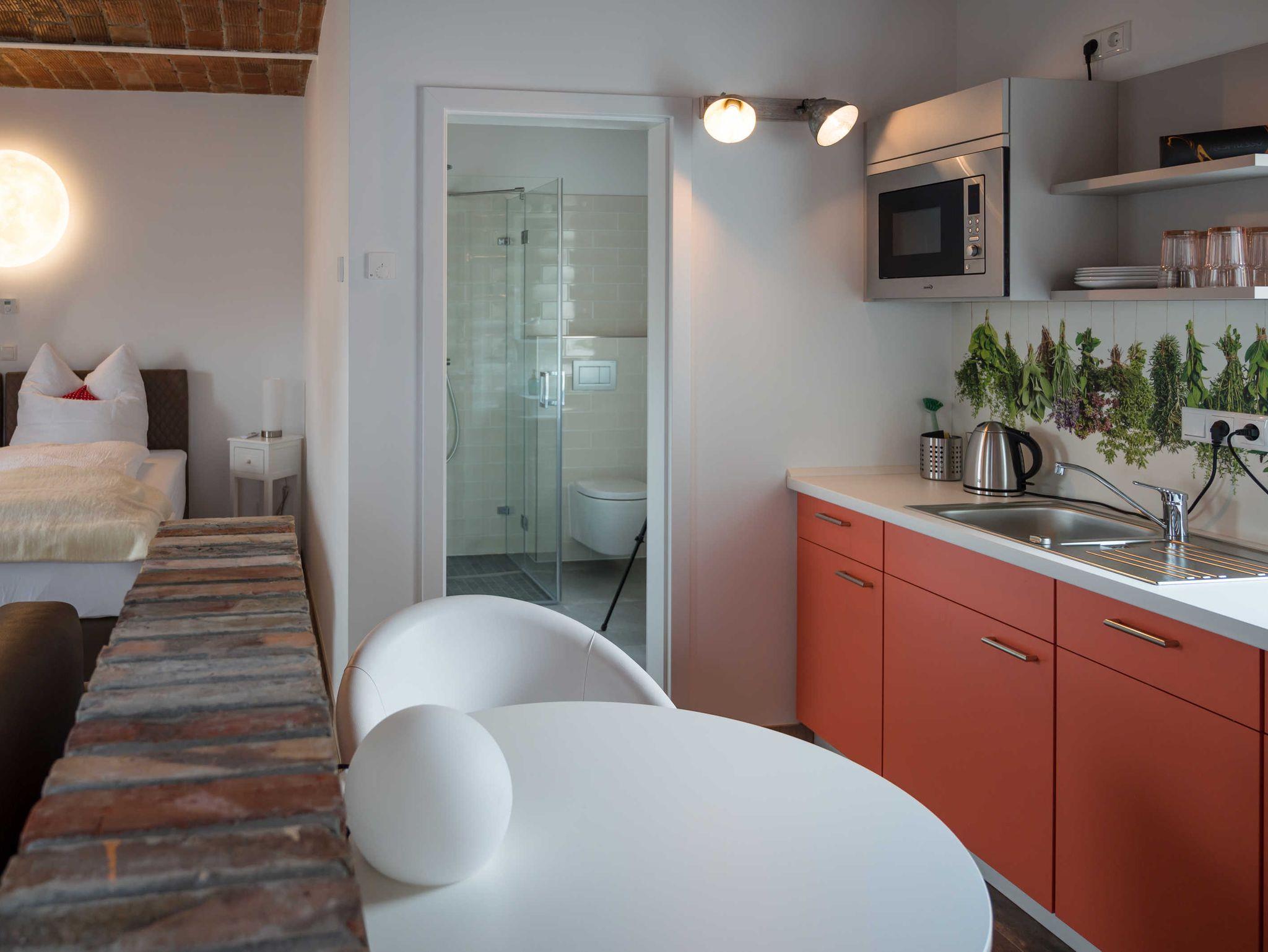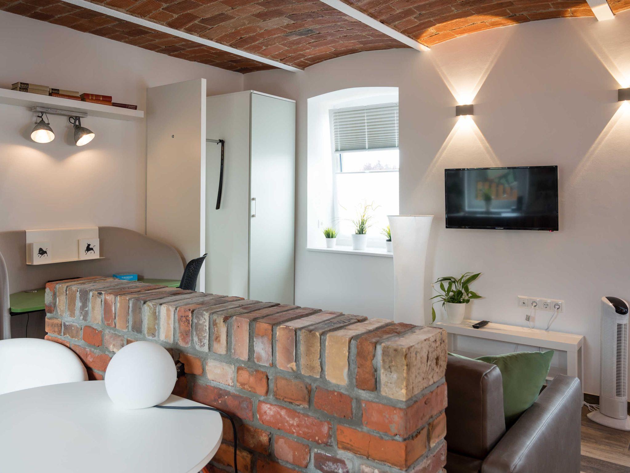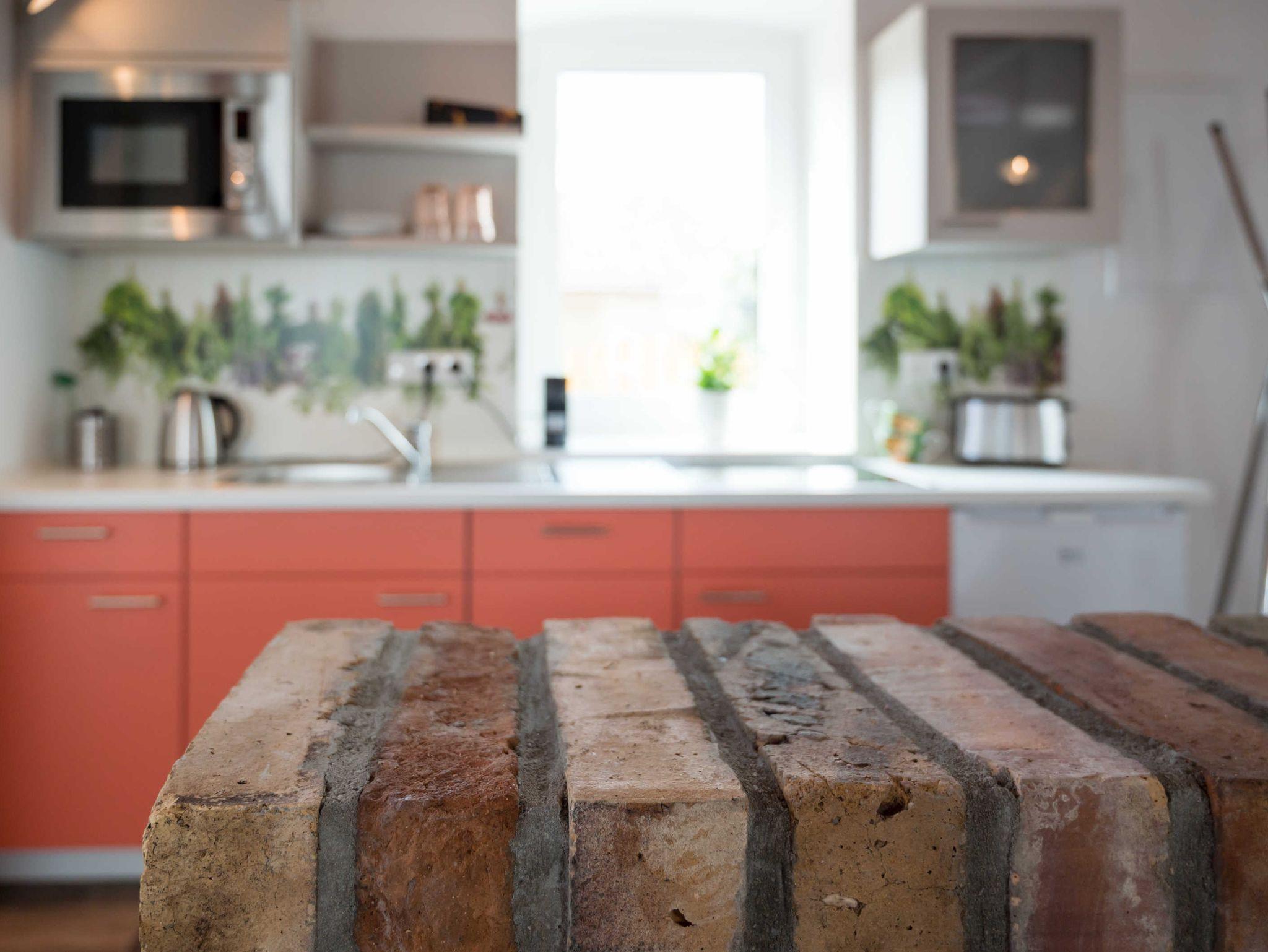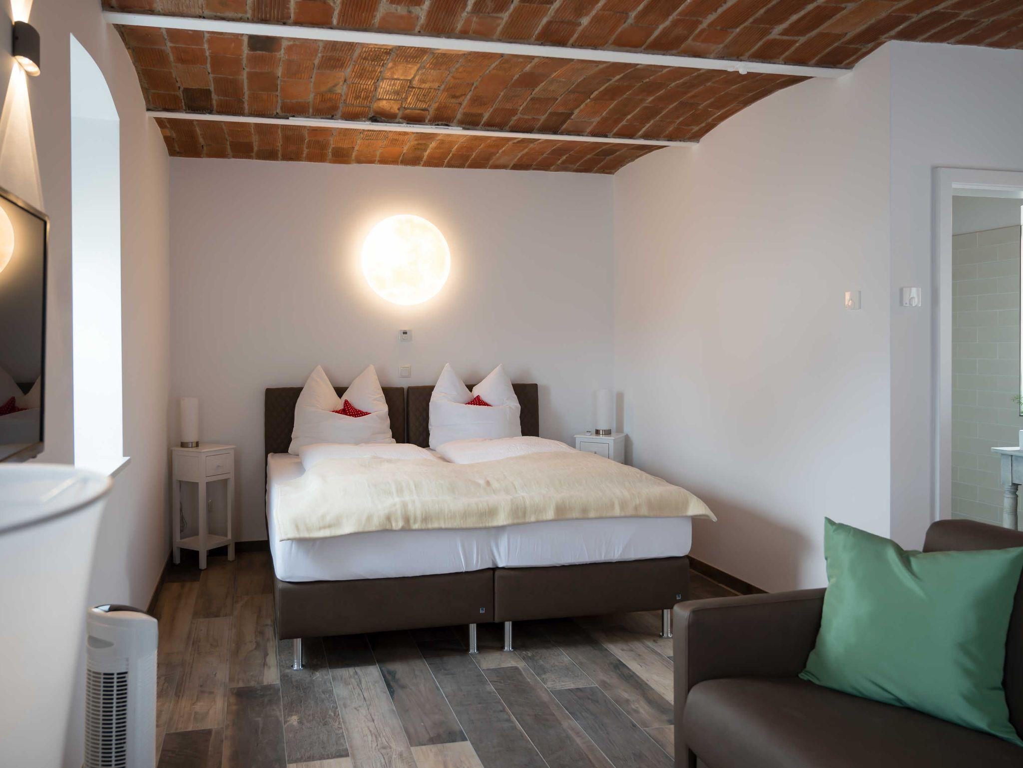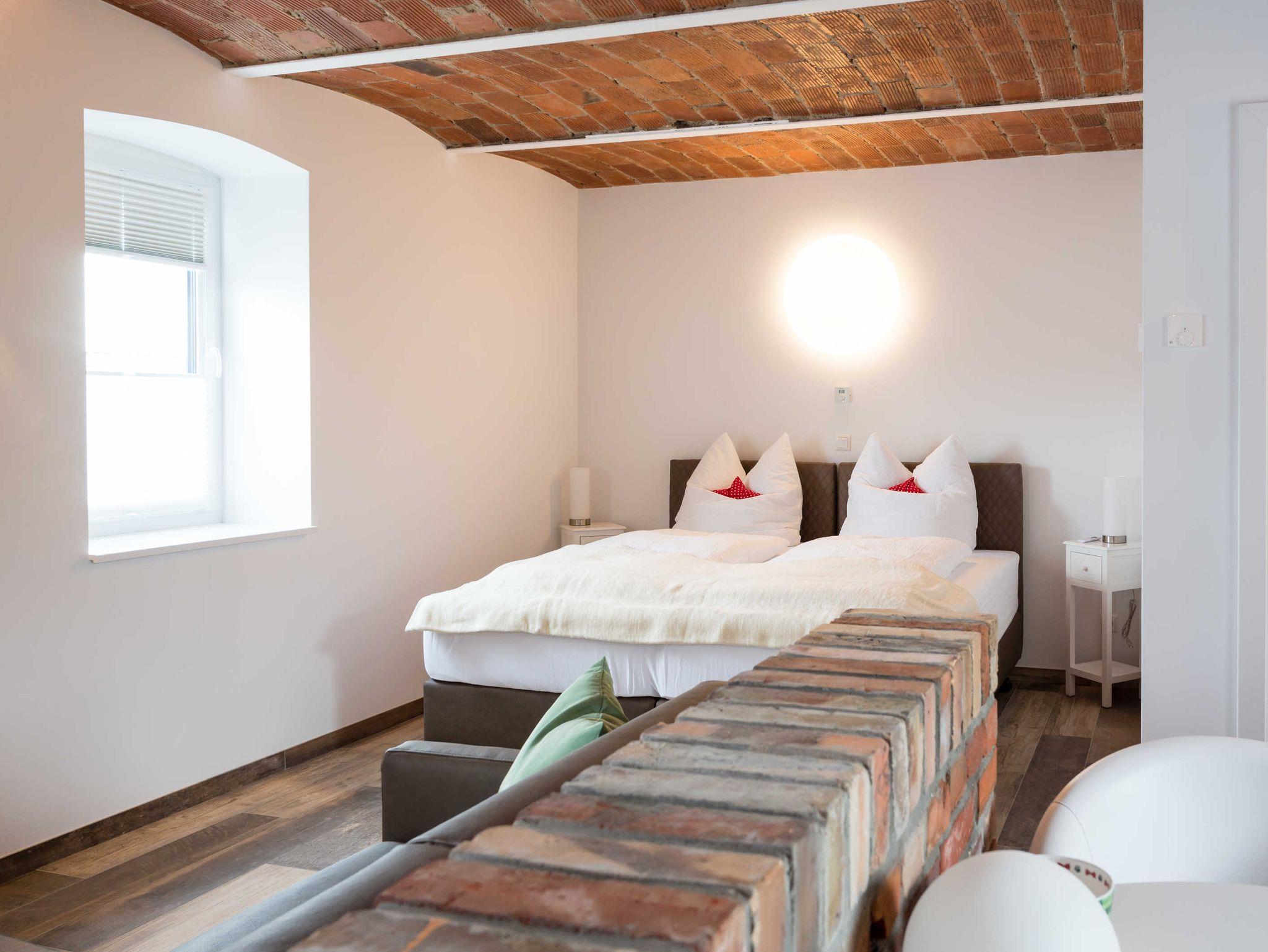 Ein altes Stallgebäude wurde komplett entkernt und im Erdgeschoss neu aufgebaut. Innen erinnern lediglich die Kappendecken sowie die Fenster Laibungen an die alten Gemäuer. Ein Zugang ermöglicht unseren Gästen den Weg zu den Appartements ohne direkten Kontakt mit den vierbeinigen Hofbewohnern zu haben.