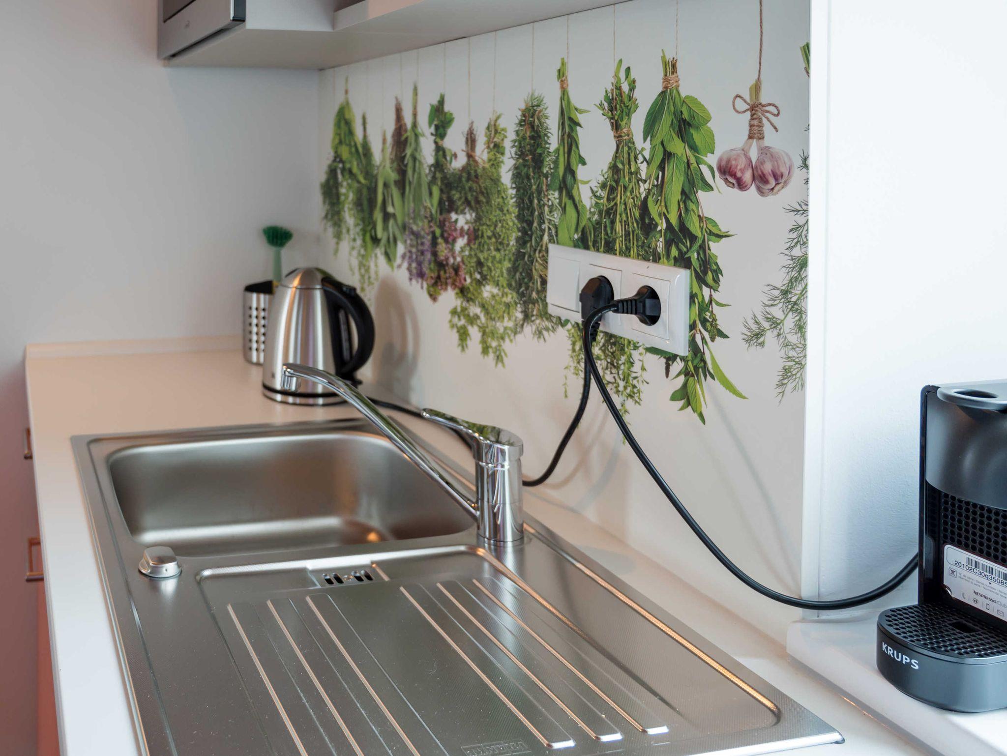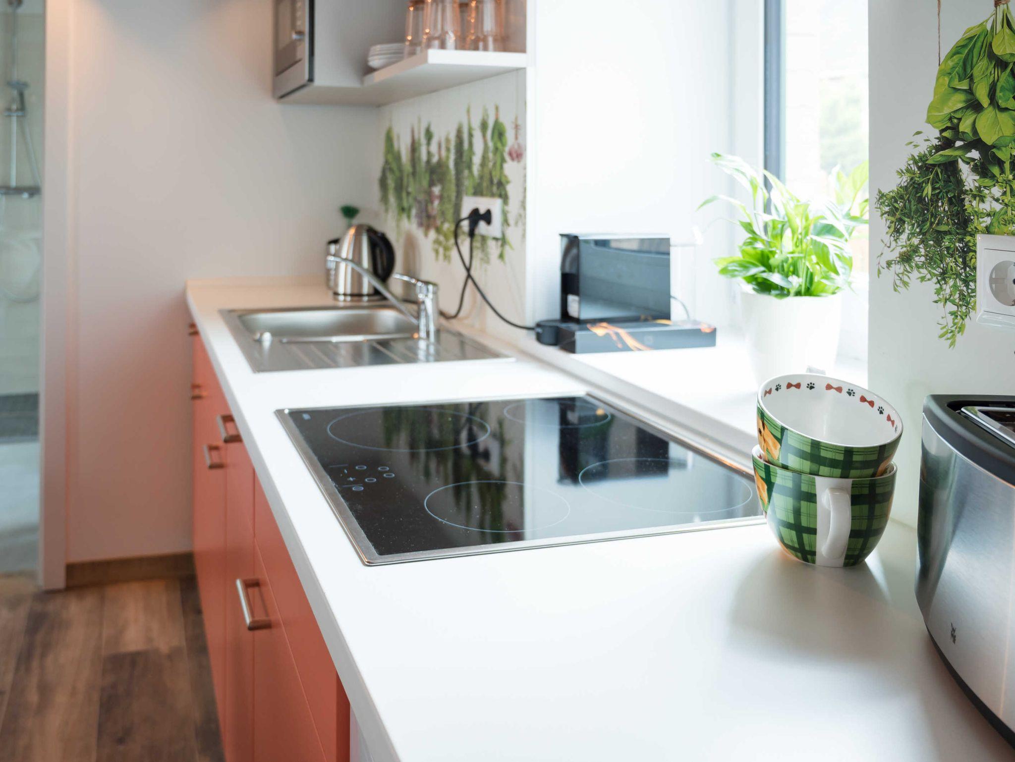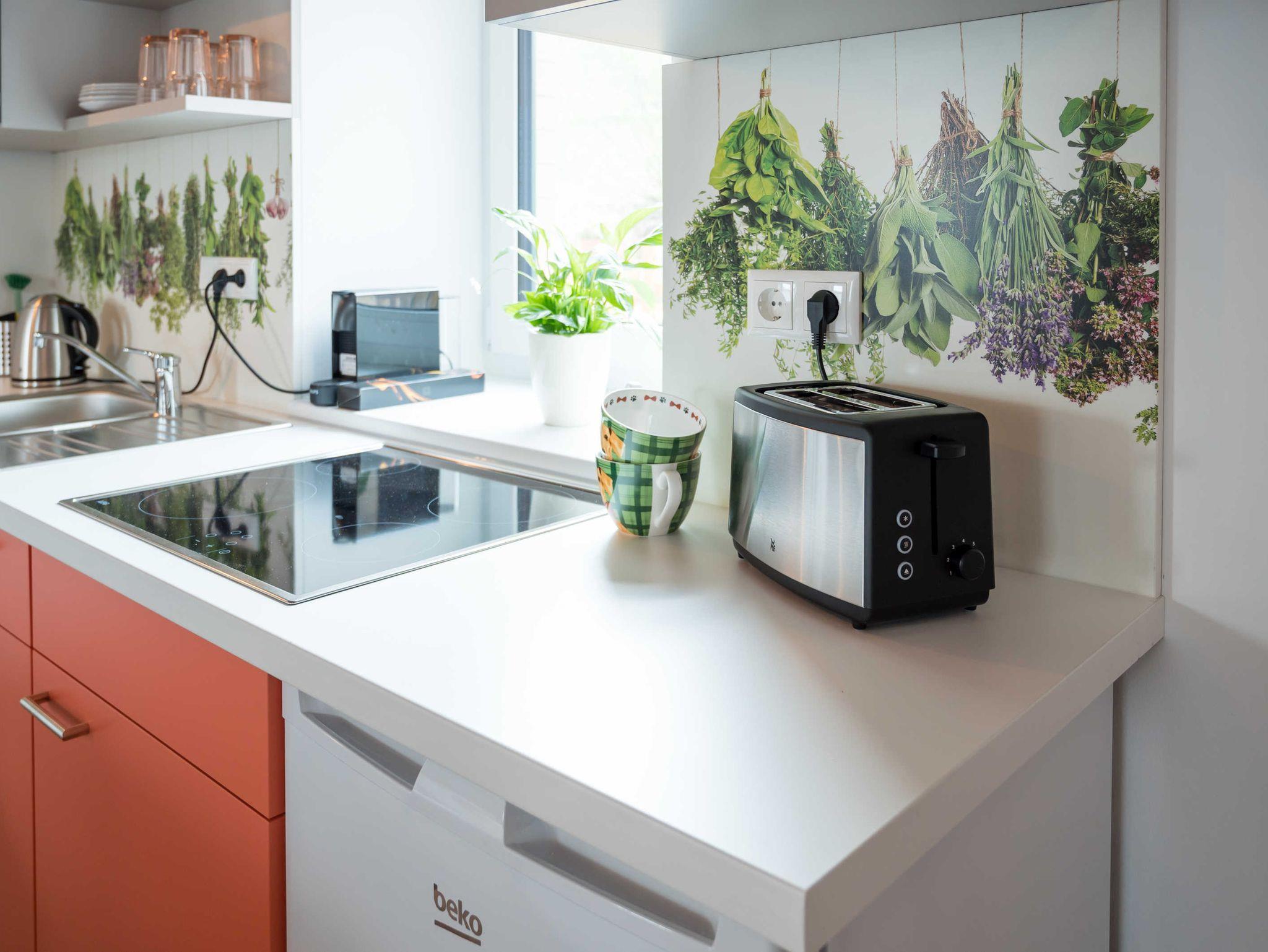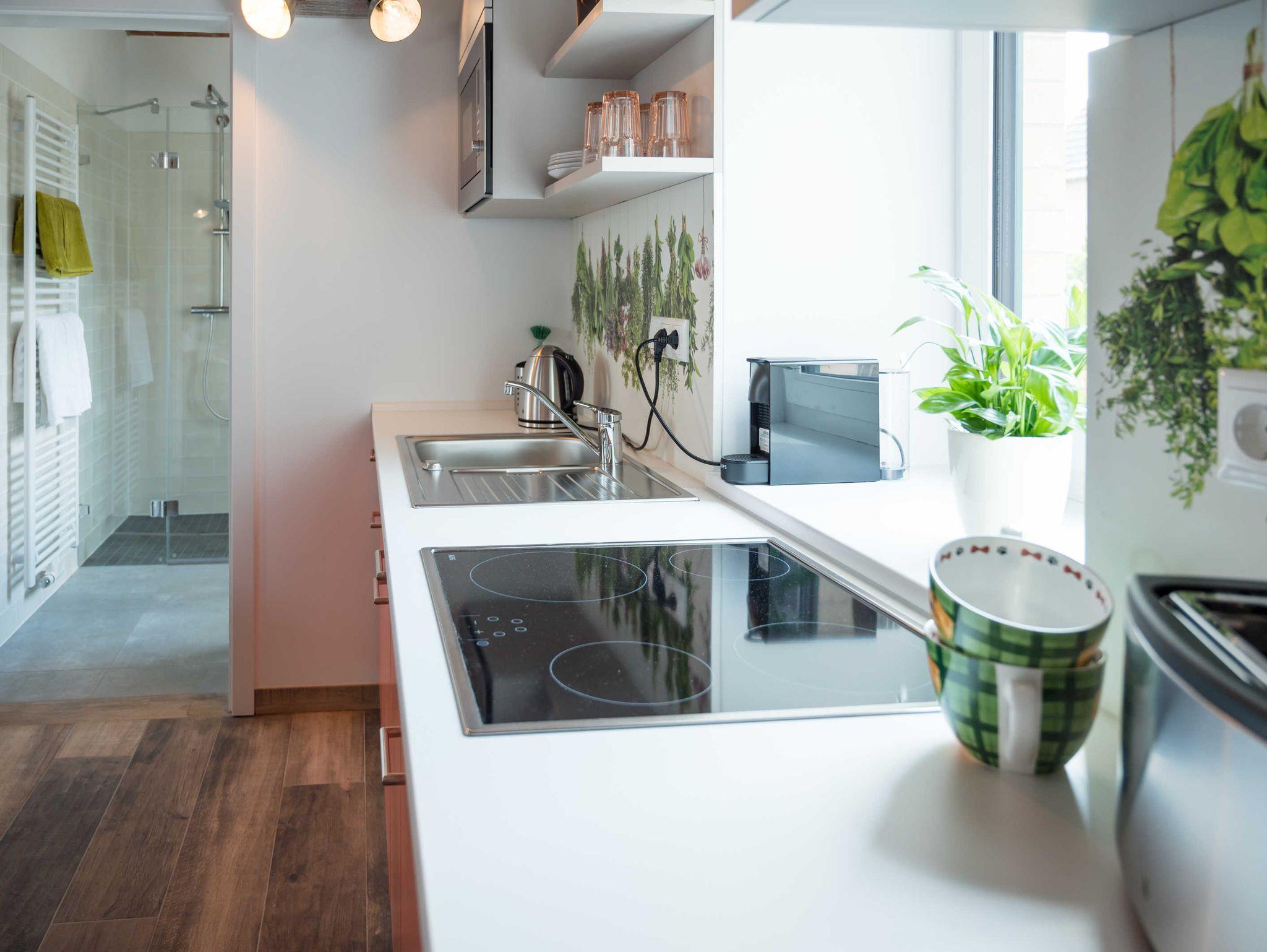 Küche- Komplett neuwertige Küchenzeile mit Kühlschrank inkl. kleinem Gefrierfach, Kochfeld, Mikrowelle mit Grillfunktion, Geschirrspüler, Toaster, Wasserkocher und Nespresso-Kaffeemaschine stehen bereit. Ein direkt angrenzender Essplatz bietet Platz für bis zu 3 Personen.