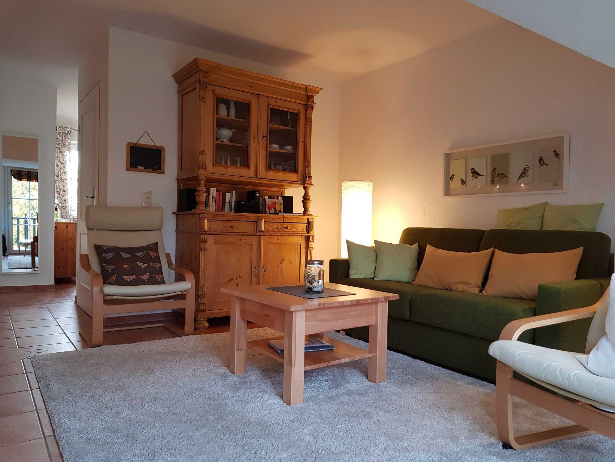 Die liebevoll eingerichtete 2-Zimmer-Maisonette-Ferienwohnung Strandläuferin befindet sich in einer Appartementanlage in der Nähe der Reha-Klinik Schloss Schönhagen. Die 60m² große Wohnung bietet Platz für 2 Personen und hat einen schönen Blick vom möblierten Westbalkon in eine Gartenanlage mit altem Baumbestand. Der individuell eingerichtete Wohnbereich mit einer komfortablen Schlafcouch und der kleinen, offenen Küche sorgen für eine behagliche Atmosphäre. Das helle Bad mit Duschwanne und WC befindet sich auf der Ebene des Wohnbereichs. Ein Studio im Obergeschoss dient als Schlafzimmer mit Doppelbett. Es ist auch als Rückzugsraum über eine Holztreppe erreichbar. In der Wohnung gibt es kostenfreies WLAN. Vor dem Haus steht ein reservierter PKW-Stellplatz zur Verfügung. Im Eingangsbereich gibt es einen kleinen Heizungsraum, in dem maximal 2 Fahrräder untergestellt werden können. Dieser Raum wird gemeinsam mit den Mietern der unteren Wohnung genutzt.