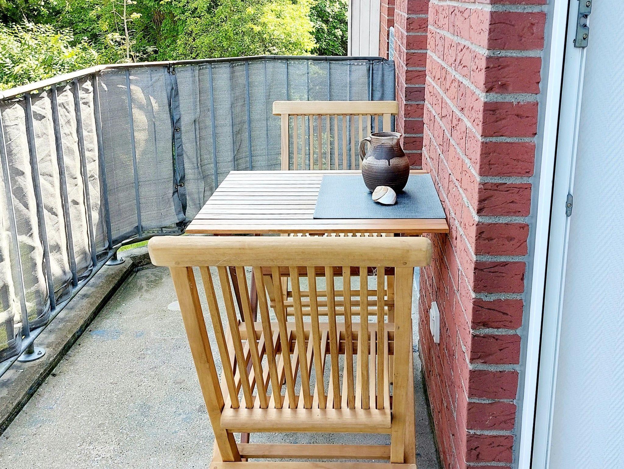 Aufgeteilt in: Wohnzimmer mit Essbereich, Schlafzimmer mit Doppelbett (140x200 cm mit einteiliger Matratze), Küchenzeile im Wohnbereich, Duschbad/WC, Balkon zur Ostseite, WLAN, PKW-Stellplatz und Fahrradbügel