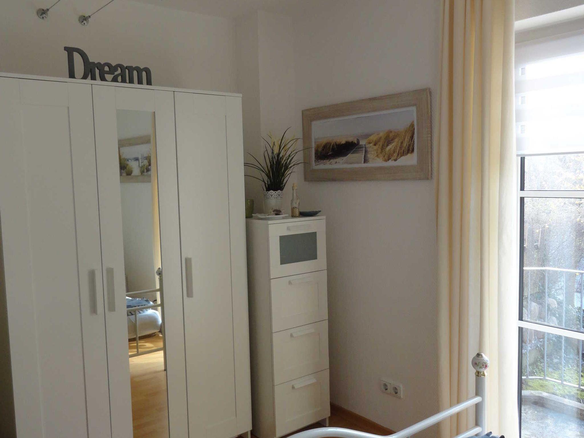 Die 2-Zimmer-Ferienwohnung Strandglück hat ca.46qm Wohnfläche für max. 3 Personen und besteht aus: Wohnzimmer mit Couchgarnitur (Schlafcouch für 1 Person) und Essbereich; Schlafzimmer mit Doppelbett (2x90x200 cm) und Kleiderschrank; Küchenzeile im Flurbereich mit 4-Kochzonen-Ceranfeld, Minibackofen und Geschirrspüler; Bad mit Wanne (Duschmöglichkeit) und WC; möblierte Terrasse zur Süd-Ostseite und Balkon zur Westseite; PKW-Stellplatz; abschließbare Fahrradunterstellmöglichkeit, kostenfreies WLAN in der Wohnung.