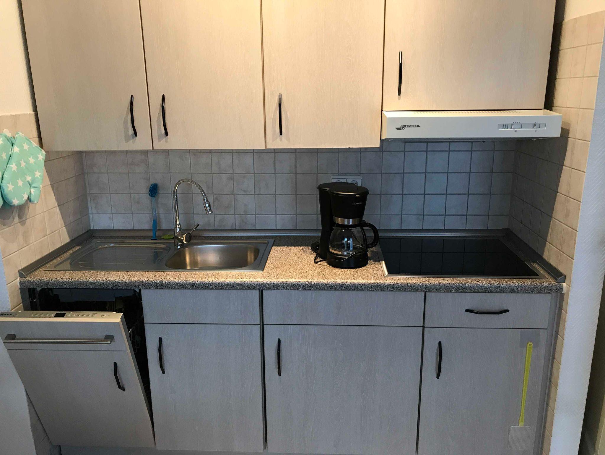 • Küchenzeile mit 4-Kochplatten Glaskeramikfeld, Geschirrspüler und Mikrowelle