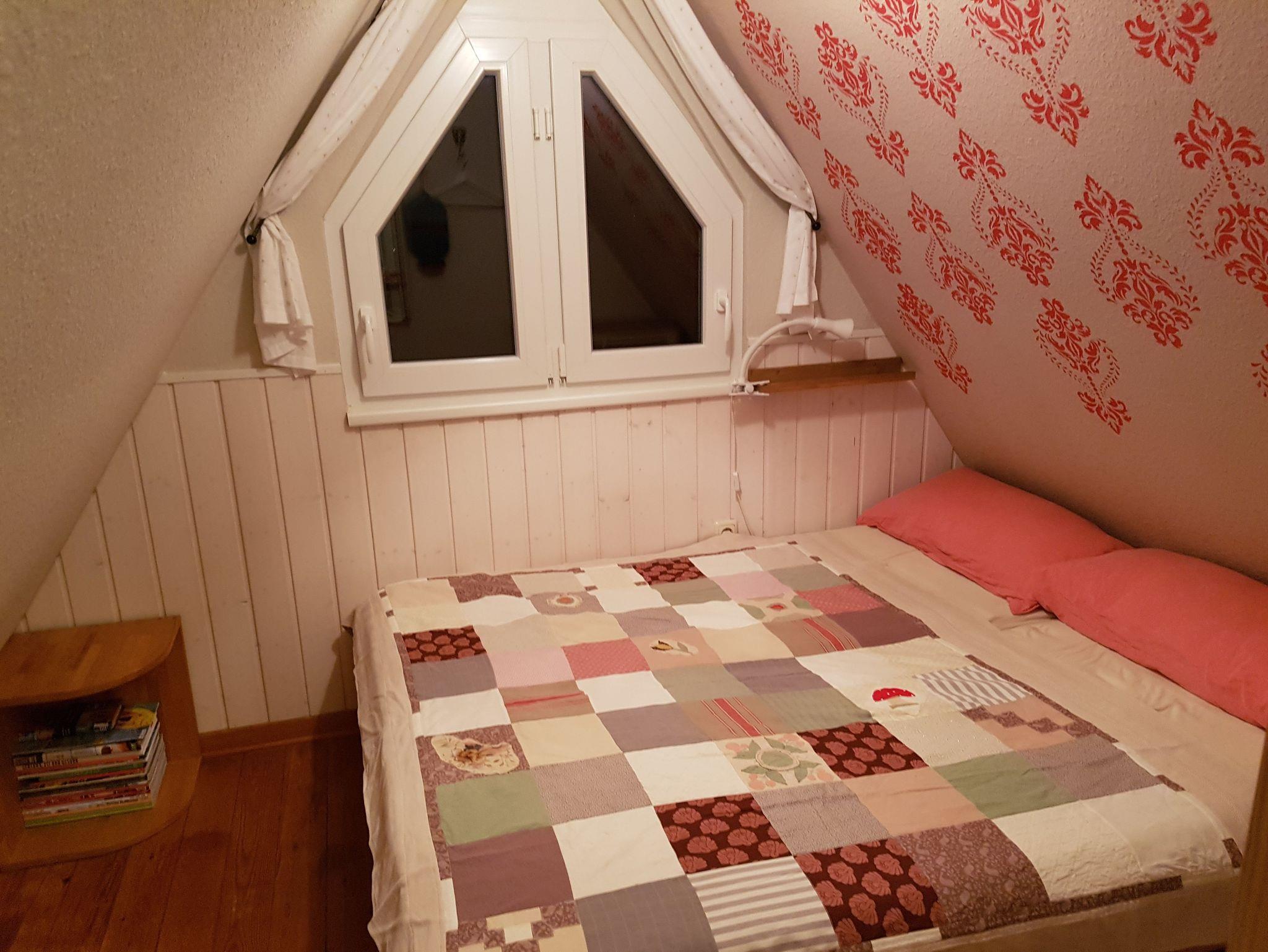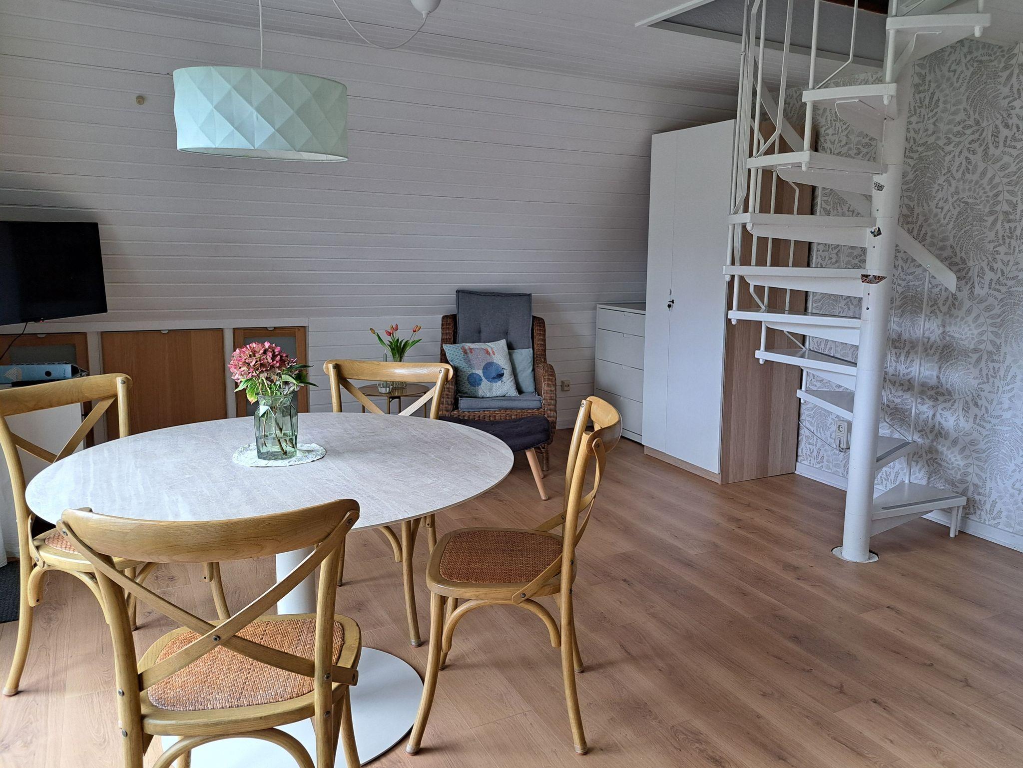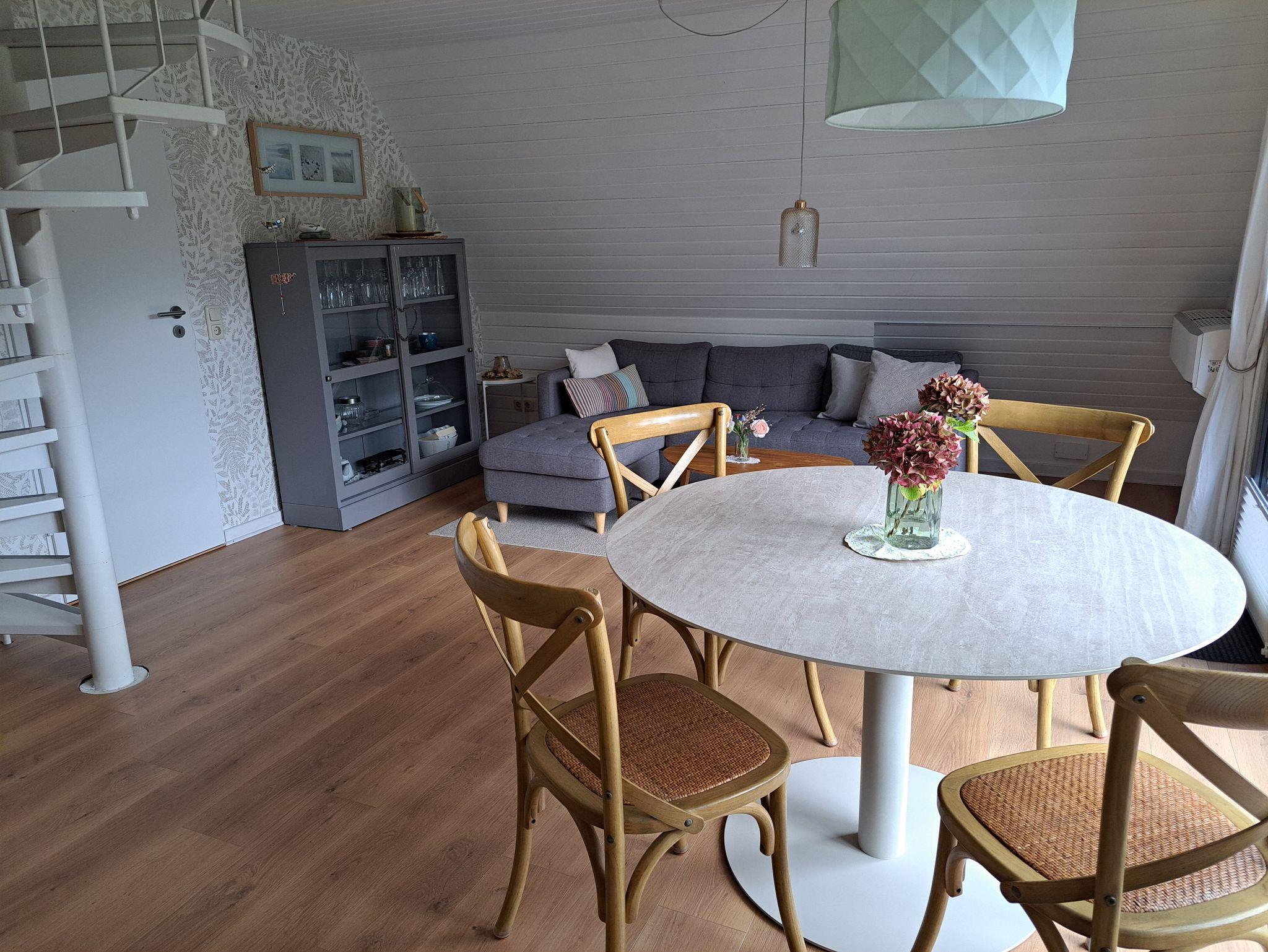 Im Erdgeschoss befindet sich der sonnige Wohn- Essbereich mit SAT-TV, die gut ausgestattete Einbauküche mit Geschirrspüler, Backofen und einer Kühl-Gefrierkombination sowie das Badezimmer mit Wannenbad. Über eine schmale Wendeltreppe gelangen Sie in das Obergeschoss. Dort befindet sich ein Schlafzimmer mit einem Doppelbett (160cm breit) und ein offener Schlafbereich mit einem Doppelbett (140cm breit).