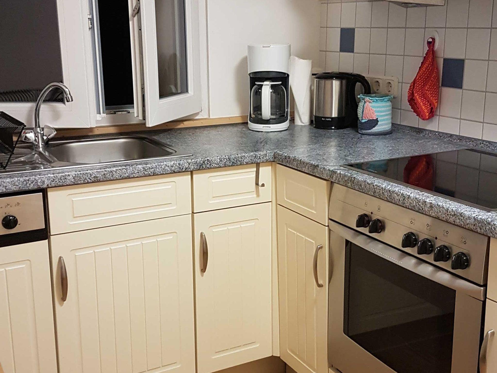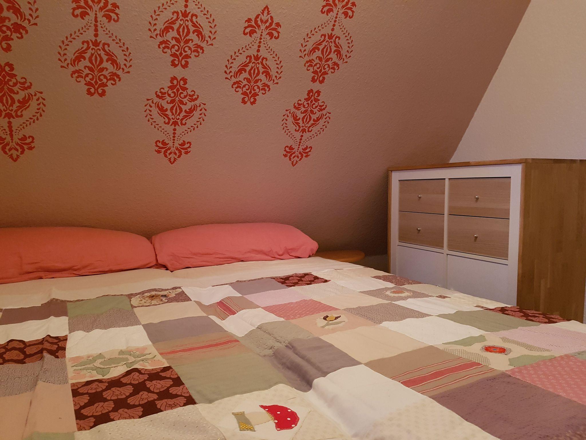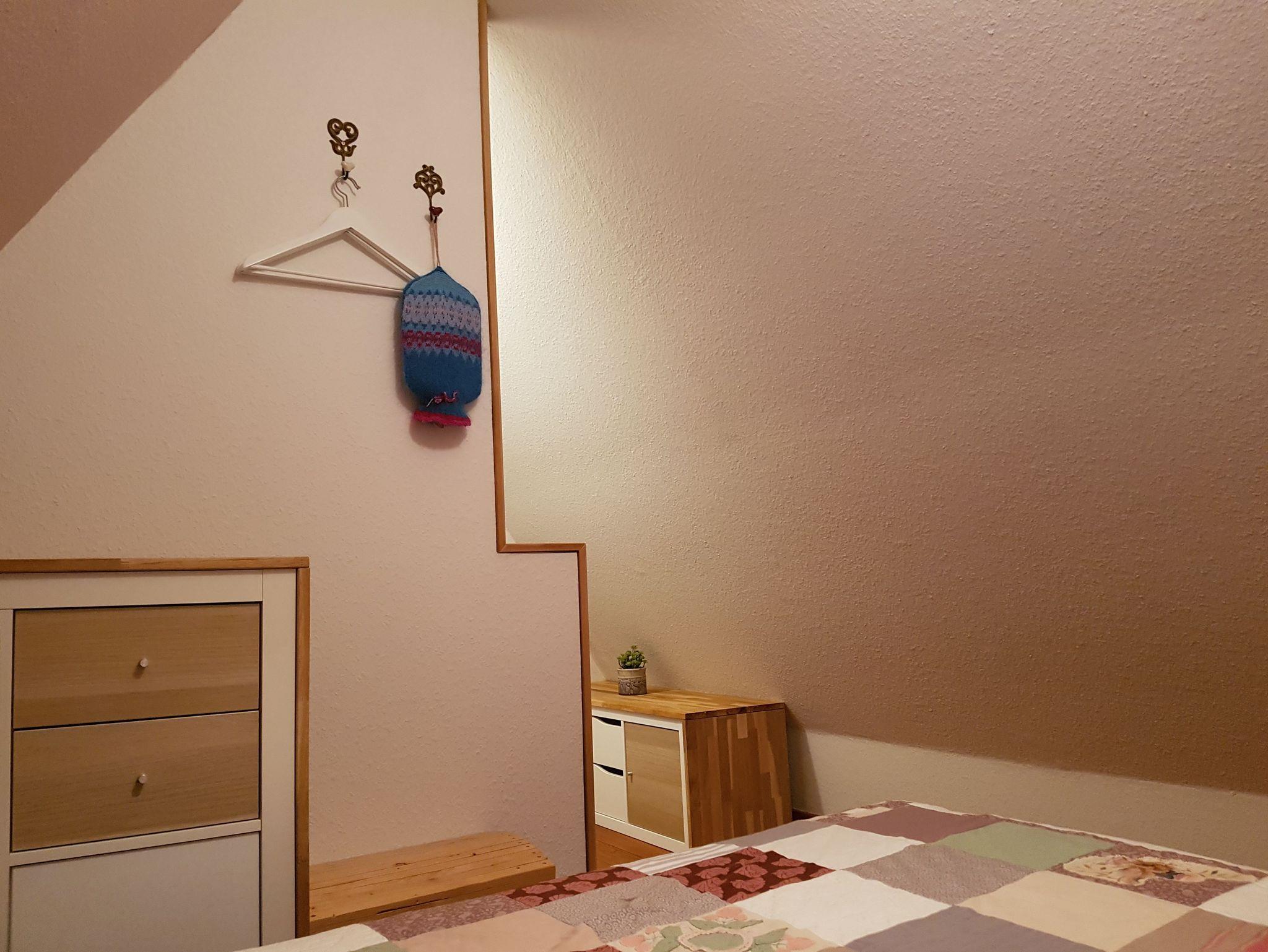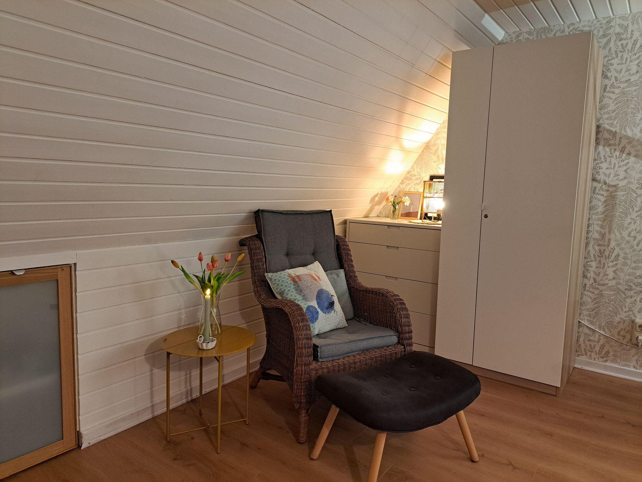 Im Erdgeschoss befindet sich der sonnige Wohn- Essbereich mit SAT-TV, die gut ausgestattete Einbauküche mit Geschirrspüler, Backofen und einer Kühl-Gefrierkombination sowie das Badezimmer mit Wannenbad. Über eine schmale Wendeltreppe gelangen Sie in das Obergeschoss. Dort befindet sich ein Schlafzimmer mit einem Doppelbett (160cm breit) und ein offener Schlafbereich mit einem Doppelbett (140cm breit).