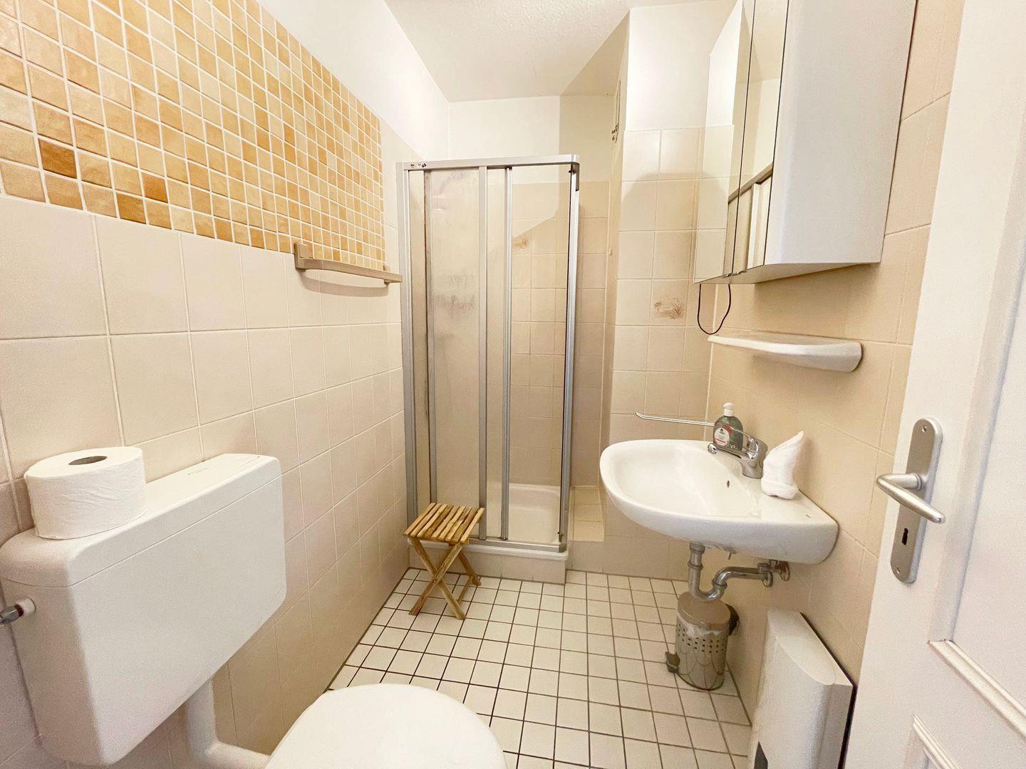 Das Schlafzimmer mit einem Doppelbett (je 90x200 cm) sorgt für erholsame Nächte. Das Badezimmer ist mit einer Dusche, Waschbecken und WC ausgestattet.