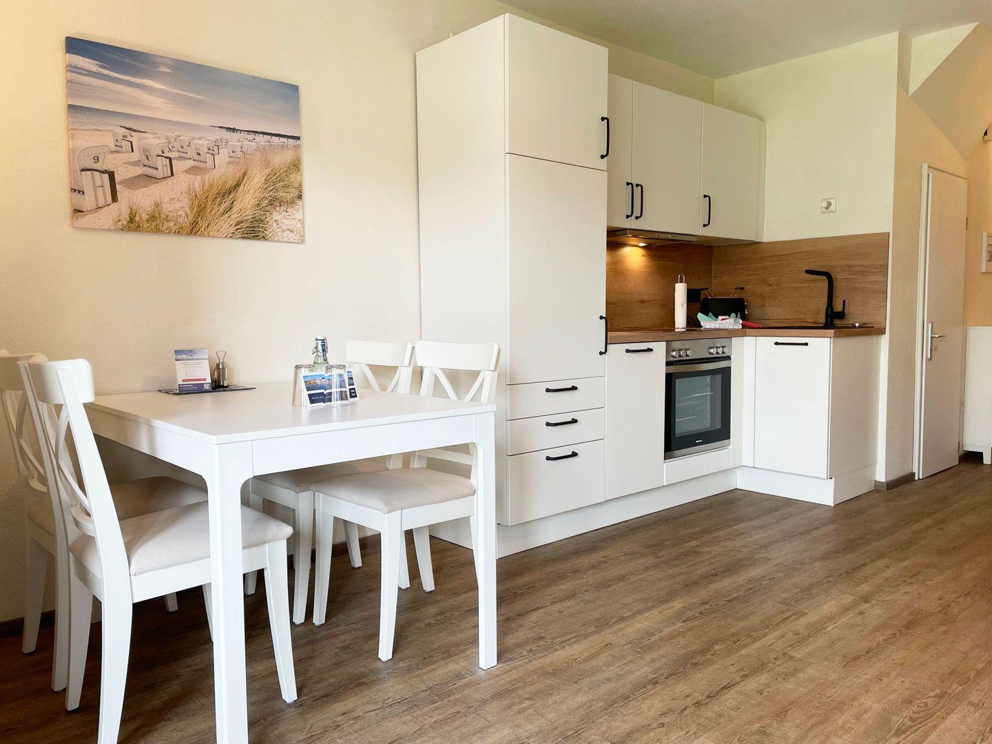 Der integrierte Wohn- und Essraum lädt zum Verweilen ein und bietet eine moderne, kleine Küchenzeile, die mit allem ausgestattet ist, was Sie für die Zubereitung Ihrer Lieblingsgerichte benötigen: Kühlschrank mit Gefrierfach, Backofen, Cerankochfeld, Dunstabzugshaube, Geschirrspüler sowie Wasserkocher, Toaster, Kaffeemaschine und Mikrowelle