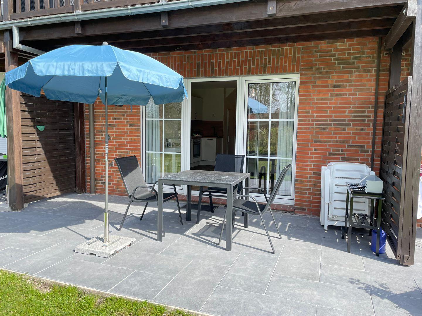 Genießen Sie die frische Luft auf der Terrasse mit Gartennutzung. Hier finden Sie Gartenmöbel sowie einen Grill – perfekt für gesellige Abende im Freien. Ihr Hund ist auf der privaten Terrasse willkommen.